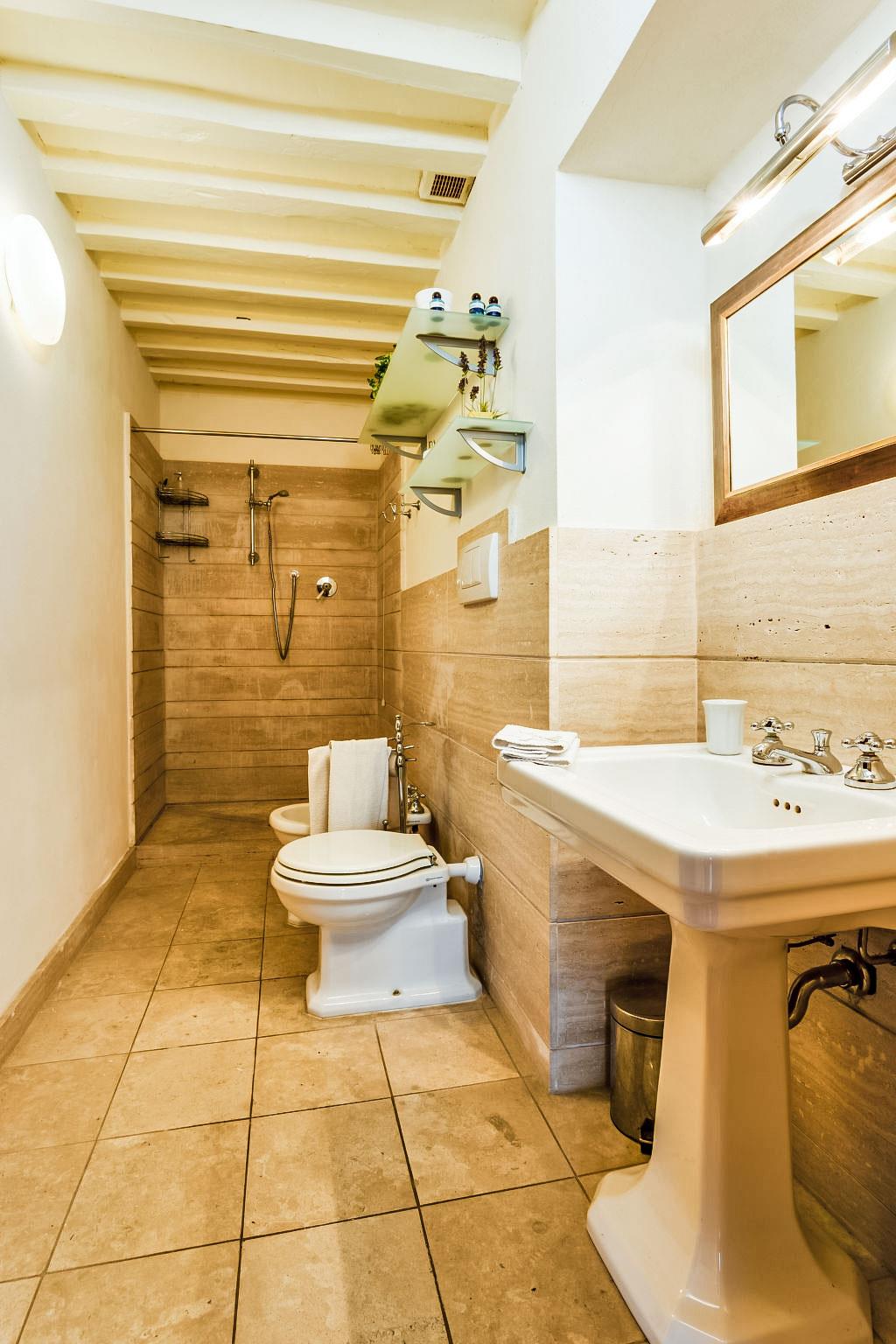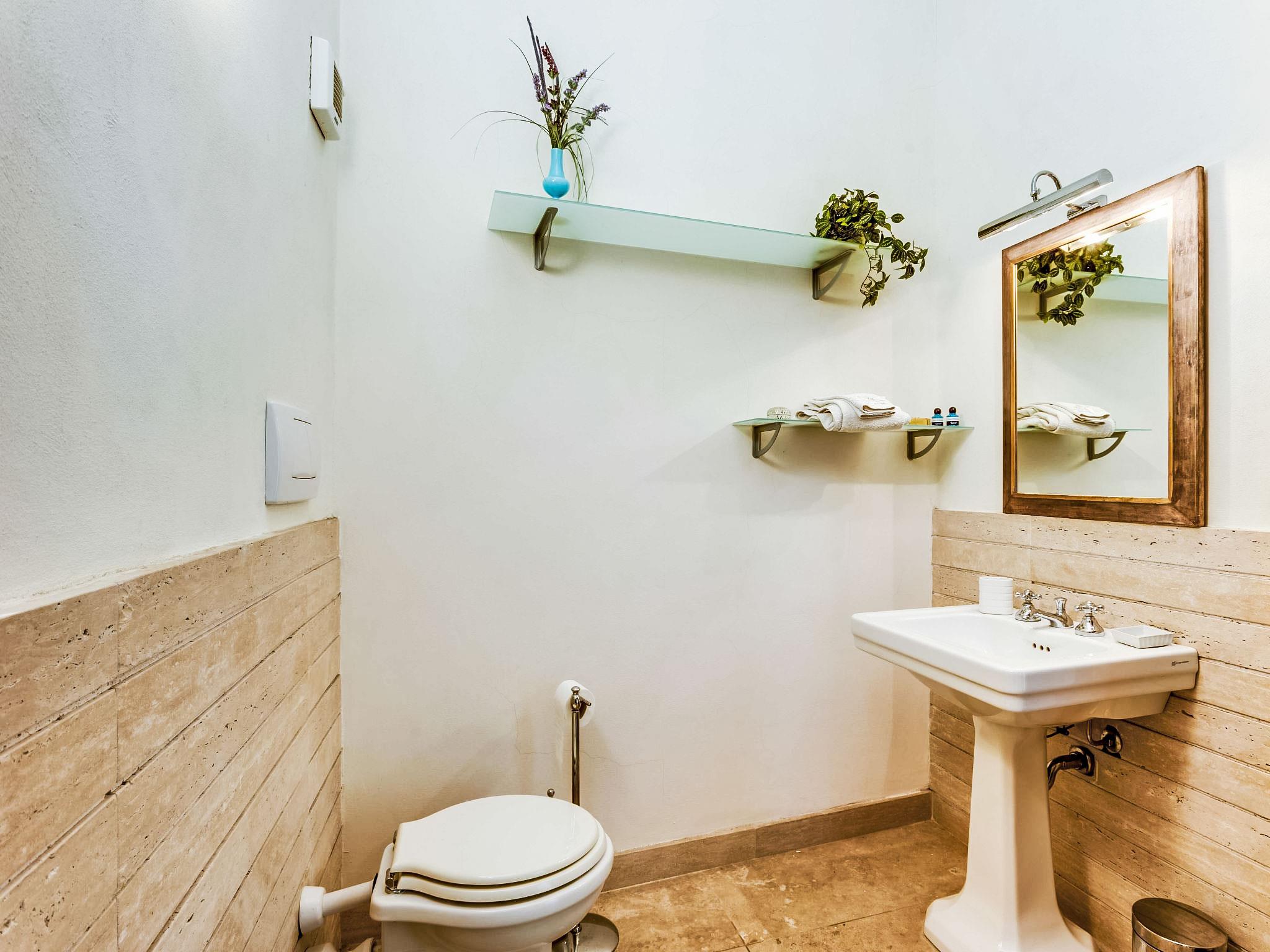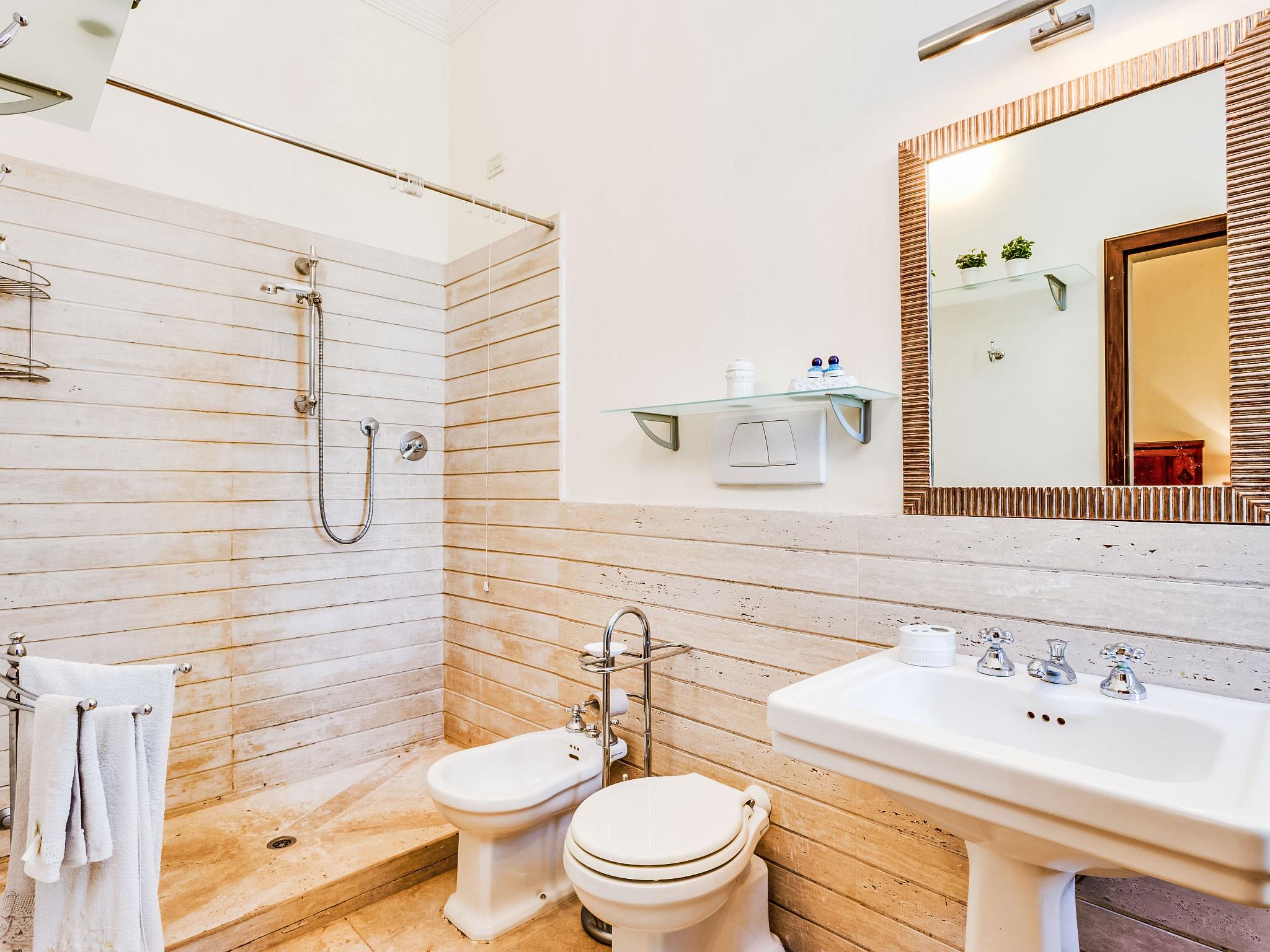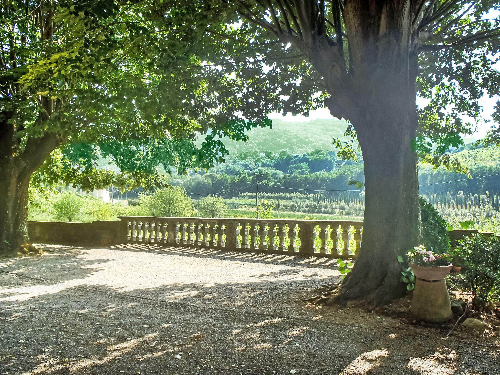 The villa is an old 19th century residential house recently restored, belongs to the larger residence. In a quiet position, in the middle of a large park with centuries old trees. From the house you can see the observation tower to the Montalbano hills with olive groves and vineyards and to the stronghold towers of Serravalle. The swimming pool is 150 m away, open from 10.00-19.00 hours. Villa "Nicoletta", detached, renovated in 2005. 7 km from the centre of Montecatini Terme, 35 km from the centre of Lucca, 44 km from the centre of Firenze, located by a road. Private: garden 5'500 m2 (fenced), swimming pool (12 x 6 m, depth 90 - 140 cm, seasonal availability: 17.May. - 27.Sep.). Outdoor shower, garden furniture, barbecue. In the house: central heating system, heating to be paid on the spot, heating available only from 01.Nov. - 07.Apr.. Room cleaning weekly (included). House maid daily on request (extra). Cook on request (extra). Motor access to the house (100 m via unmade road). Parking on the premises. Shop 7 km, grocery 1 km, supermarket 8 km, restaurant 1 km, bar 1 km, bus stop 2 km, railway station "Masotti" 2 km, sandy beach "Versilia" 62 km, thermal baths "Montecatini Terme" 7 km. Golf course (18 hole) 7 km, tennis 3 km. Nearby attractions: Pistoia 7 km, Uzzano 18 km, Montecarlo 22 km, Pescia 24 km, Collodi 26 km. The owner does not accept any youth groups. Neighbourhood highly sensitive to noise. Quietness and good behaviour expected.