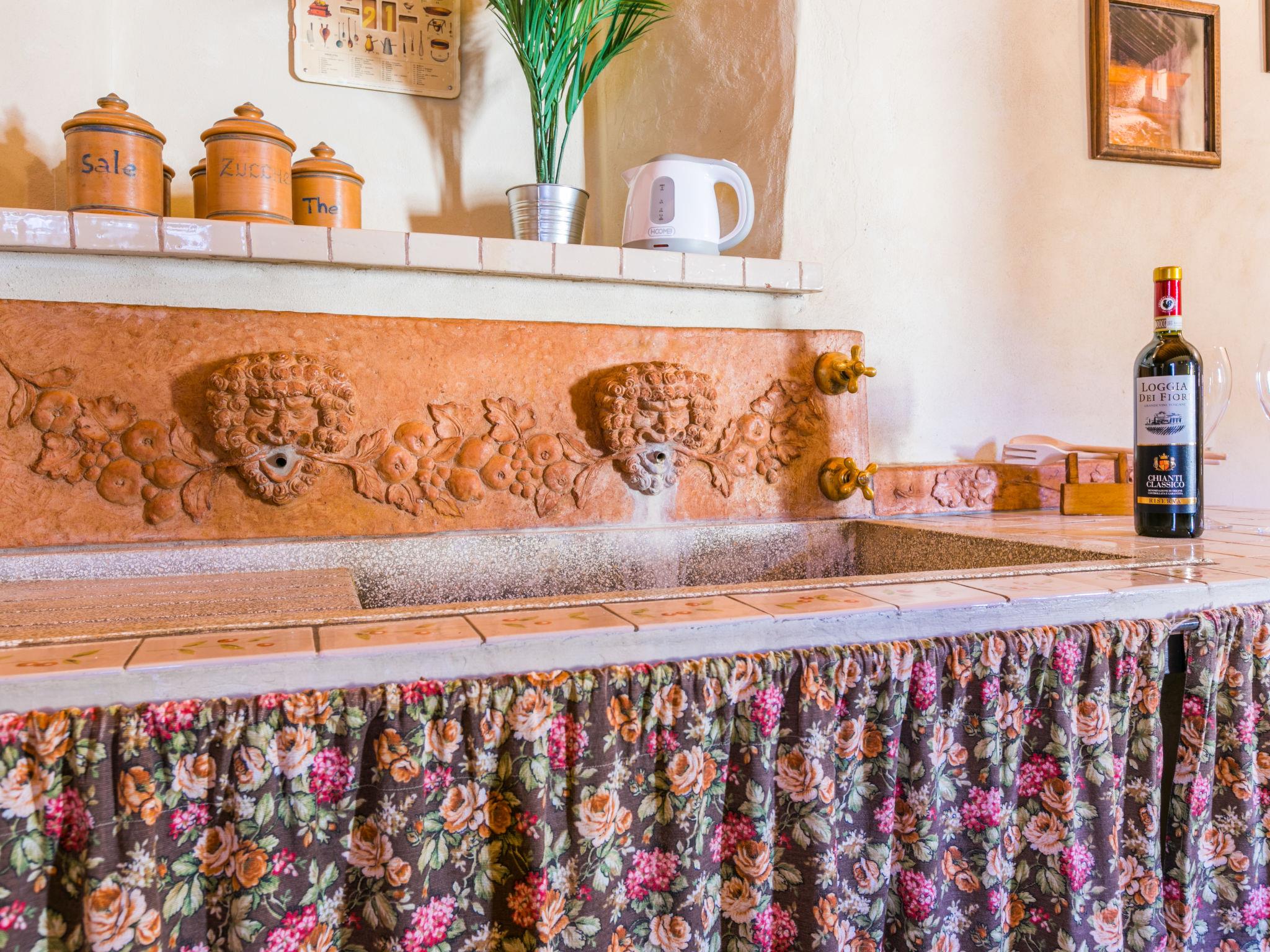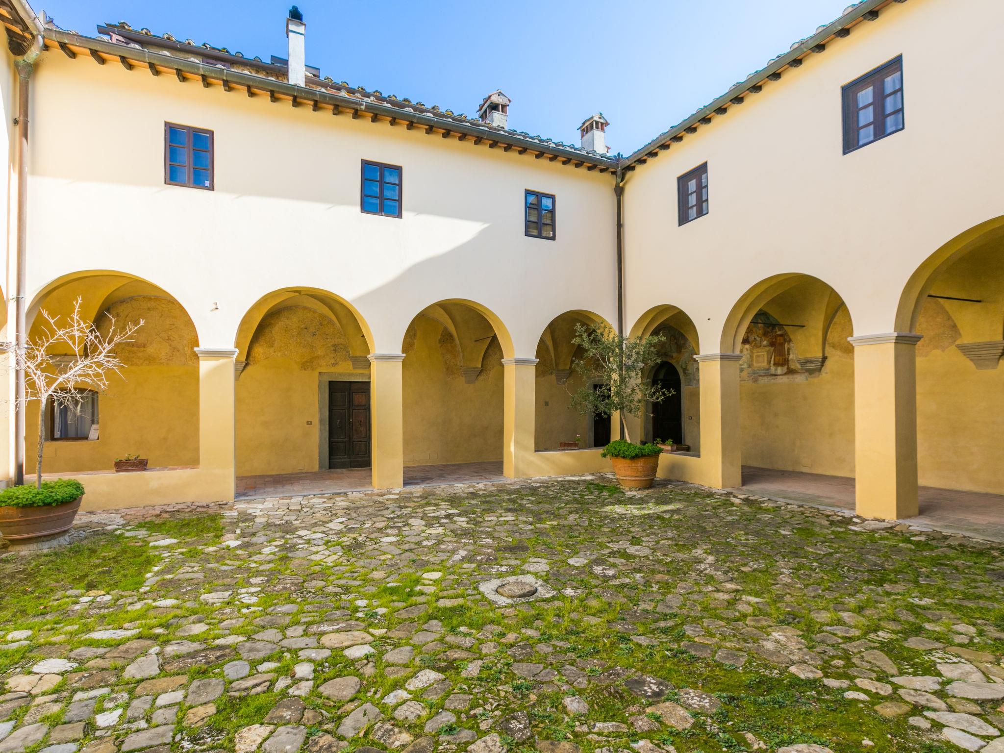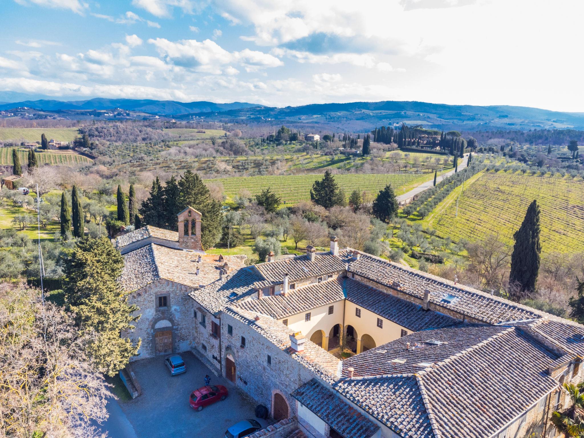 Montefiridolfi: Very old, historical cottage "Il Convento", from the 14th century, surrounded by vineyards. 10 apartments in the residence. 3 km from the centre of Montefiridolfi, in a sunny, elevated position on top of a hill, 90 km from the sea, in the countryside. Parking at the house. Shop 3 km, grocery 3 km, supermarket 8 km, restaurant 3 km, bakery 3 km, bus stop "Montefiridolfi" 3 km, sandy beach "Cecina Mare" 90 km, outdoor swimming pool 8 km, indoor swimming pool 8 km. Golf course (18 hole) 20 km, tennis 8 km, walking paths from the house 100 m. Nearby attractions: Firenze, San Gimignano, Siena. Please note: baby equipment (included).