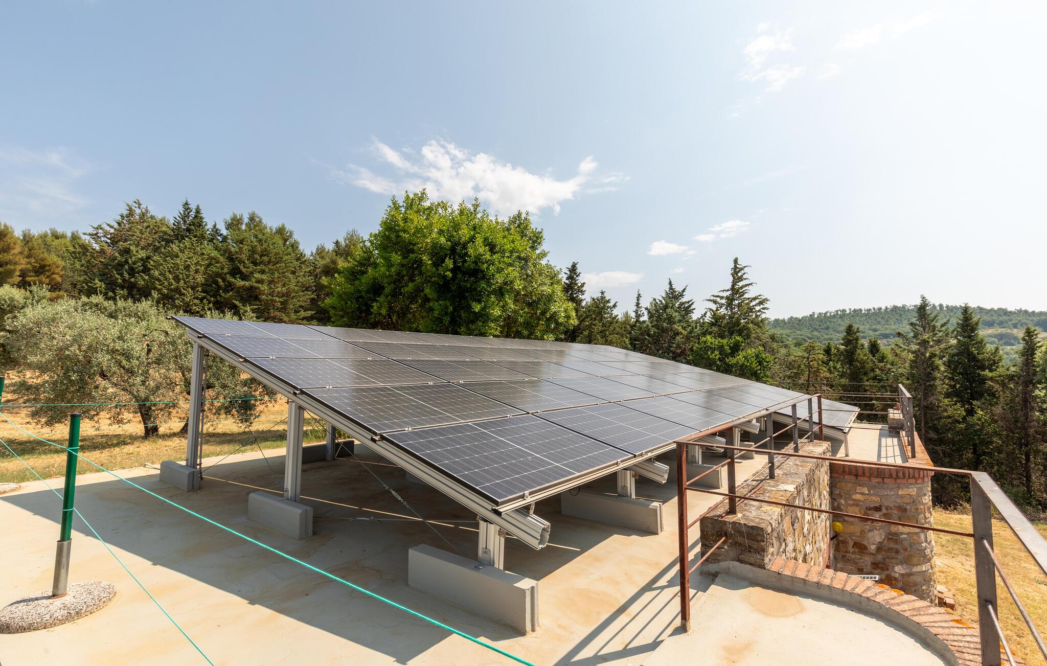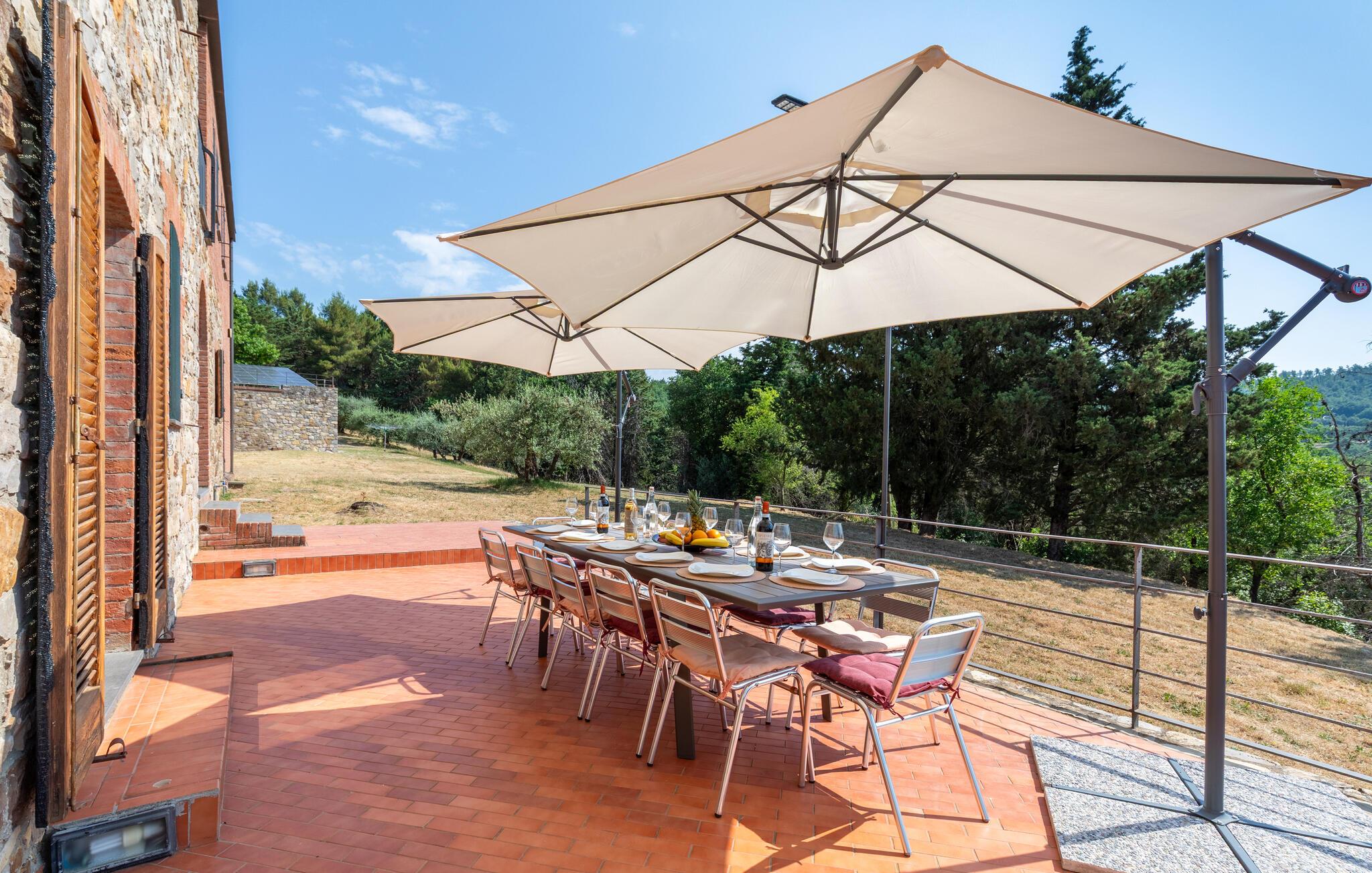 Omgivet af skovklædte bakker er det absolut roligt beliggende og har en skøn udsigt til de landlige omgivelser. Stort udendørsområde med naturplæne, pool, udendørsbruser, parkeringsplads og område til måltider i det fri.