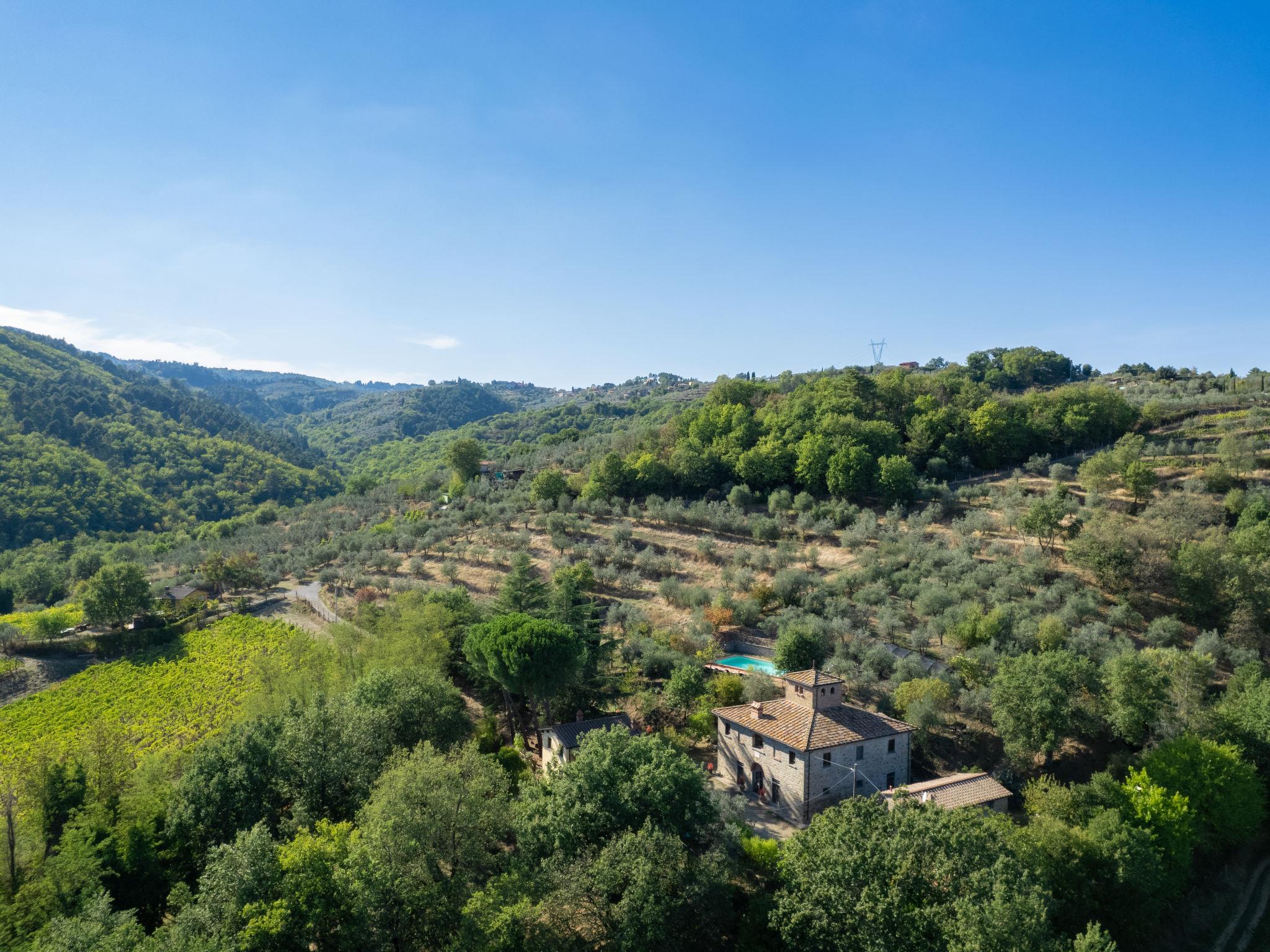 Beautiful stone house from the late 1700s located in a splendid natural setting, surrounded by olive groves, vineyards and woods in a panoramic position. The farm is made up of the main house which accommodates 10 beds and the dependance which houses 06 beds. Our commercial proposal gives the possibility to book the farm for 16 pax (main house + dependance) or just the main house for 10 pax. Large, child friendly, comfortable manor house "Poggio Cuccule", 350 m a.s.l., surrounded by trees. 7 km from the centre of Montevarchi, Montegonzi, 50 km from the centre of Firenze, 45 km from the centre of Siena, in a quiet, sunny, elevated position, in the countryside. Private: property 7'000 m2 (fenced), natural garden 3'000 m2 (fenced), swimming pool (6 x 12 m, depth 90 - 190 cm, seasonal availability: 27.Apr. - 11.Oct.). Table tennis, boules, garden furniture, barbecue, fireplace. In the house: internet access, billiard table, washing machine, heating to be paid on the spot, heating available only from 01.Nov. - 07.Apr.. Linen change weekly. Room cleaning on request (extra). Cook on request (extra). Steep motor access (200 m via unmade road). Parking on the premises. Shop 5 km, grocery 3 km, bus stop 800 m, railway station "Montevarchi" 5 km. Golf course (3 hole) 13 km, tennis 5 km, riding stable 3 km. Nearby attractions: Moto Cross Circuit Miravalle 1 km, Cavriglia 13 km, Badia a Coltibuono 19 km, Gaiole in Chianti 23 km, Radda in Chianti, Castello di Meleto 27 km, Greve in Chianti 38 km. Please note: car recommended. Suitable for families. The owner does not accept any youth groups. Local sale of farm products.