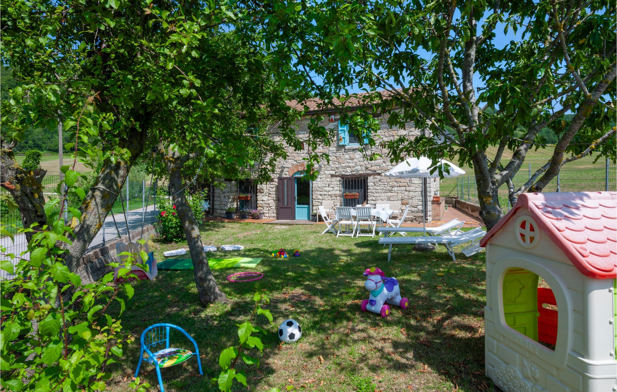 Huset er på to etager og ligger i en skøn indhegnet have, udstyret med havemøbler, hvor I kan nyde feriens måltider i det fri. Et ideelt rejsemål til alle der holder af natur og med mange vandrestier og mountainbike-ruter i nærheden. Herfra er der cirka 30 km til Adriaterhavskysten med lange strande og forlystelsesparker for alle aldre.