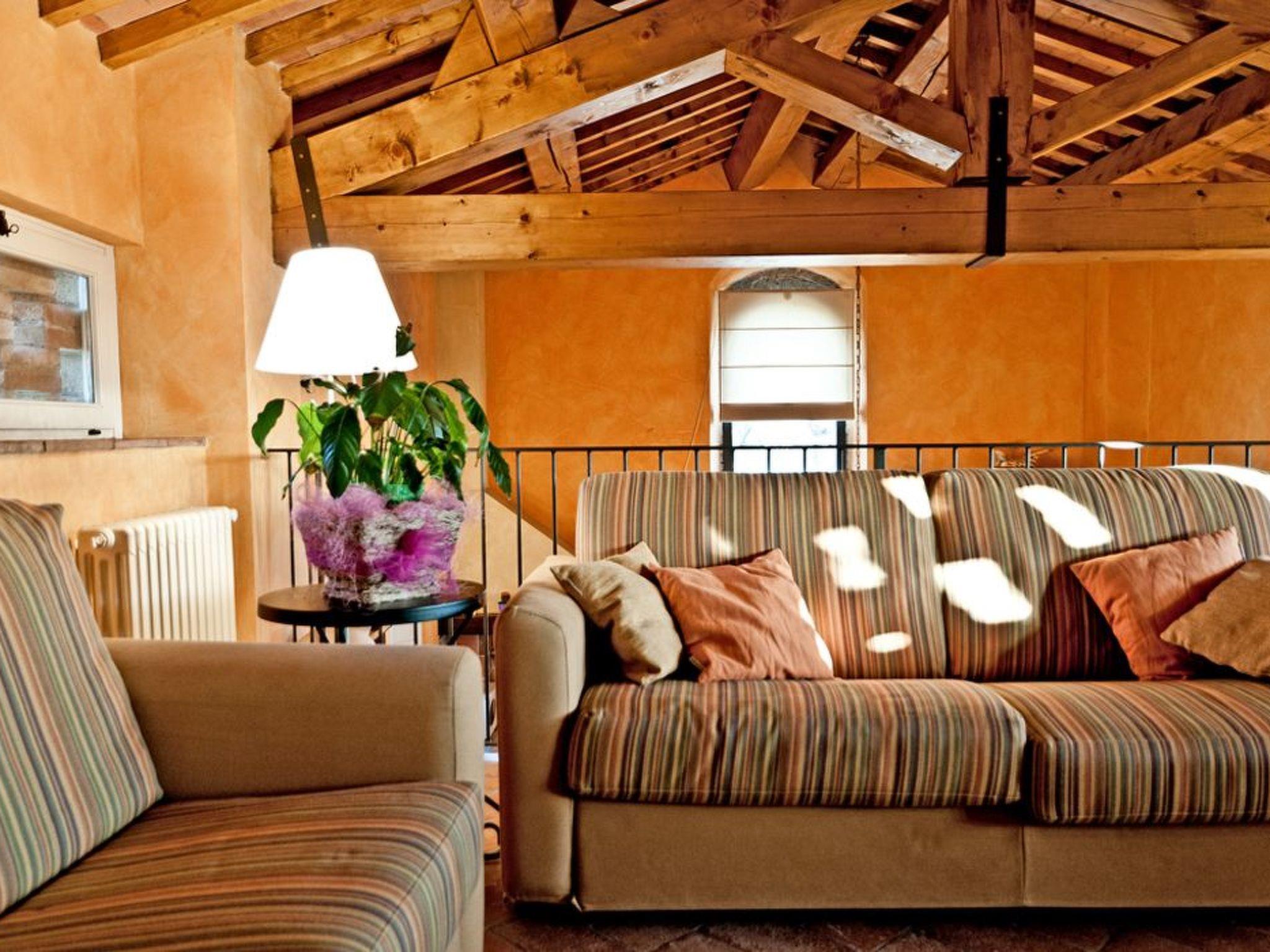 It can accommodate up to six people and consists of a bright, colourful and fully equipped kitchen with modern conveniences, two double bedrooms with original antique wrought-iron beds and two bathrooms with shower cubicles. On the upper floor there is a delightful loft with a fireplace, used as a living room with two sofas (one of these is a sofa-bed for two people) and furnished again in typical Tuscan style with an antique and original 19th century chest of drawers, satellite TV, DVD, stereo with CD player, free internet connection, books and magazines, and a basket of wood for the fireplace.