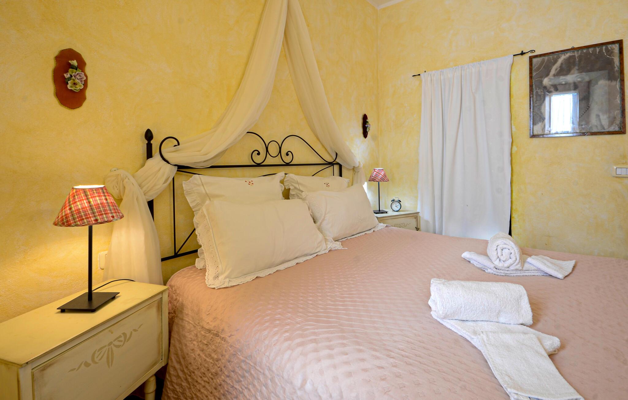 Åbne naturstensvægge og velholdte træbjælkelofter viser, hvordan denne traditionelle bolig harmonisk er integreret i det bakkede landskab. Tryl lækre pastaretter frem i det charmerende køkken, sæt jer til bords ved det farverigt dækkede spisebord og glæd jer til harmoniske spilleaftener.