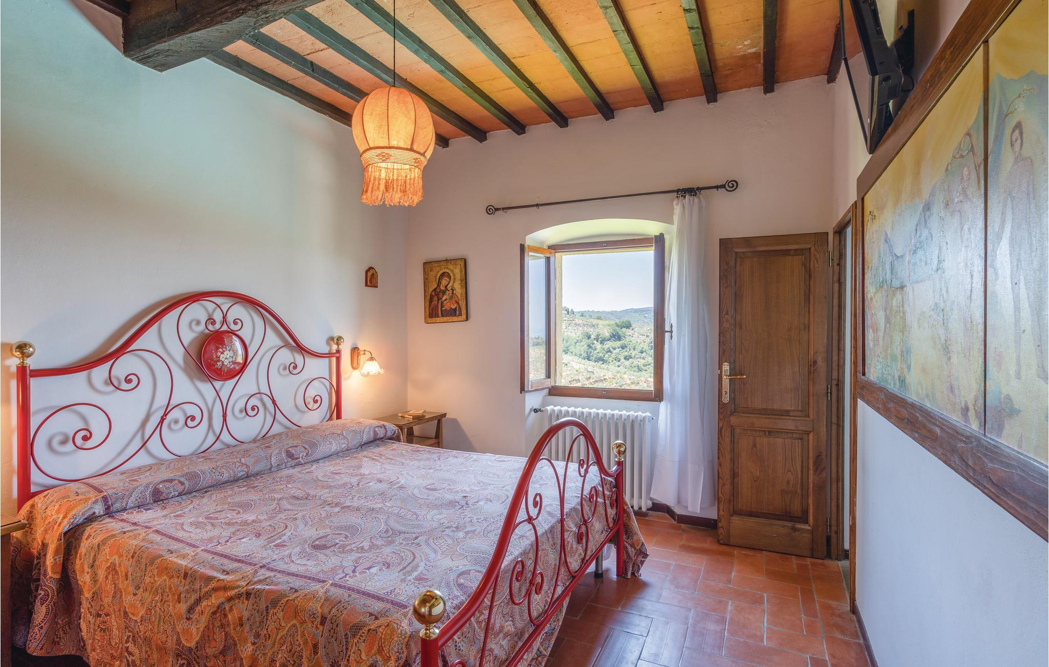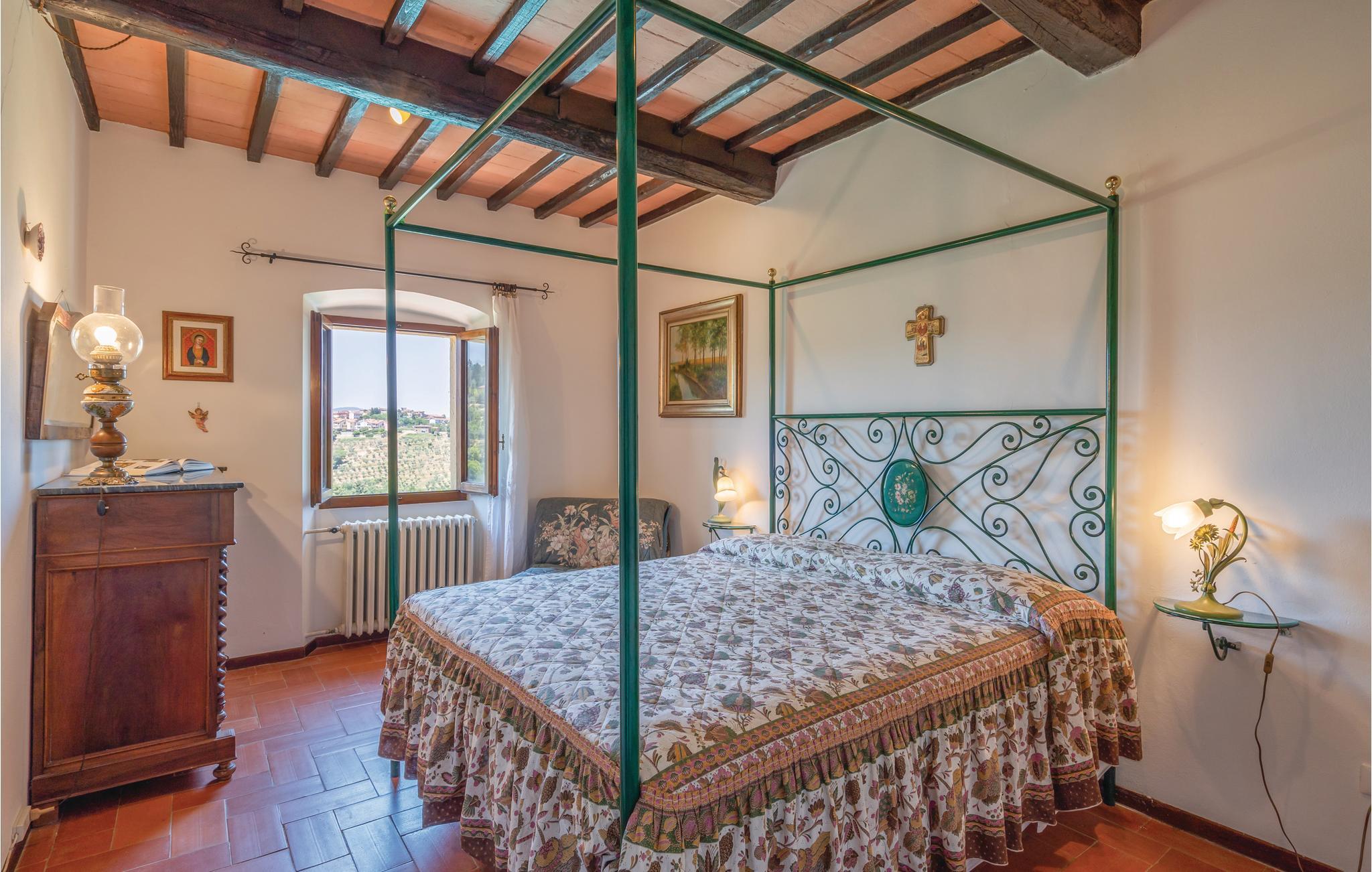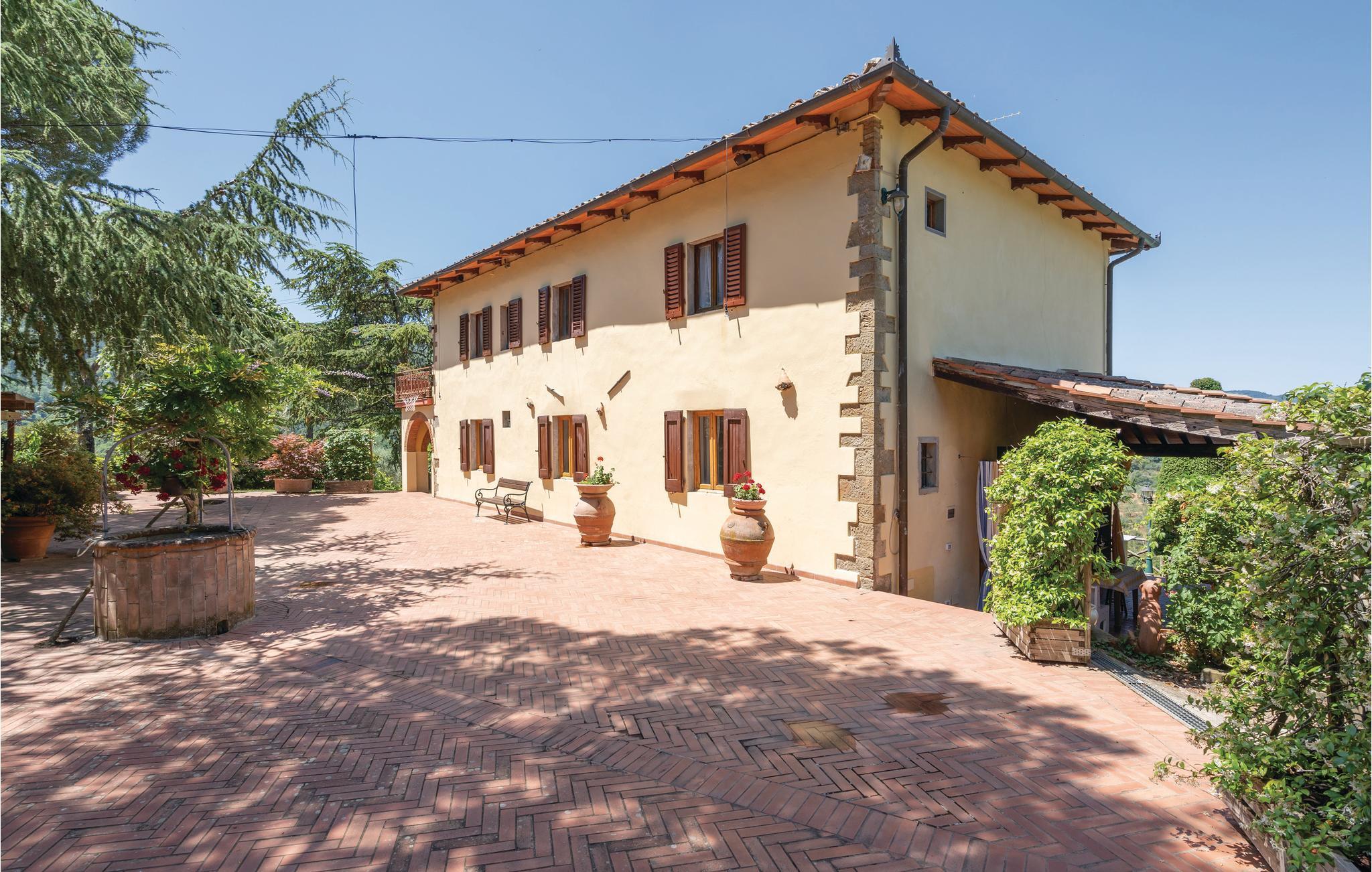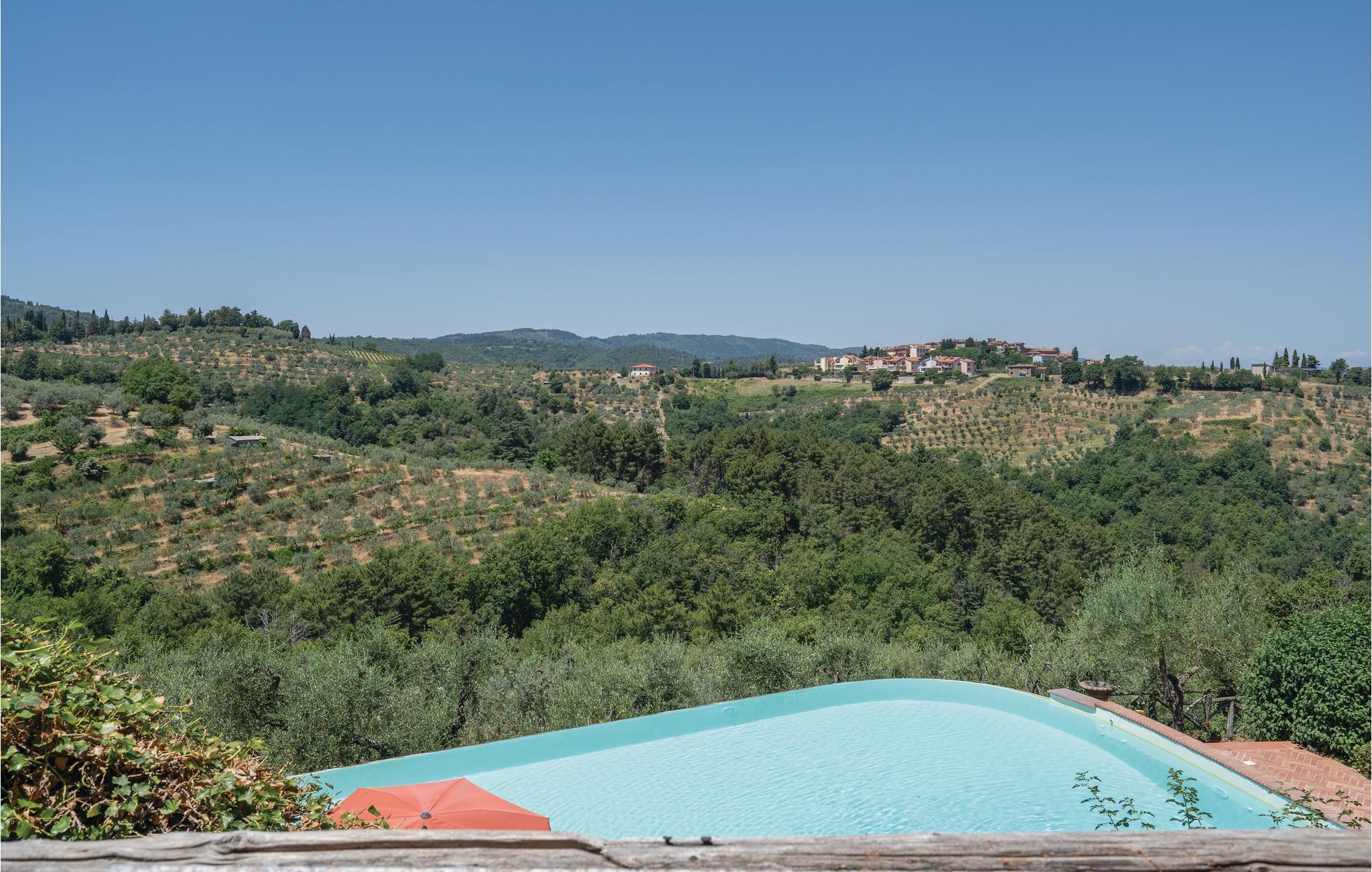 I en helt udsædvanlig panoramabeliggenhed, lige mellem Arnodalen og Chianti, ligger denne ferievilla på en bakke, omgivet af olivenlunde, kun en km fra den smukke by Moncioni. Feriehuset har været landsted for en florentinsk familie, er hyggeligt indrettet med stil og benyttes nu kun som feriebolig. I stueplan ligger det store opholdsrum med åben kamin, der er spisestue og et godt indrettet køkken. Soveværelserne og to badeværelser ligger på første sal, hvor der også er en skøn terrasse med vid udsigt. Foran huset er der en kæmpe terrasse, med overdækkede siddepladser og et godt udstyret sommerkøkken med grill og stenovn hvor I kan bage pizza. Men det bedste er den underliggende pool, med rampe, whirlpool og børneafdeling og et overløb, der giver illusionen af at svømme lige ud i bakkelandskabet. Ved poolen er der også liggestole og udendørs brusebad. I olivenlunden er der et træhus der appellere til familiens små. En lille sidebygning på grunden er beboet året rundt. Ejer passer på grunden og sælger jer gerne sine egne produkter: olivenolie og Chiantivine. Det vil sikkert være svært at forlade jeres eget paradis men I bor ikke langt fra talrige gode udflugtsmål: inden for 50 km; Firenze, Siena og Arezzo. Tilkørsel ad grusvej, der er med mange huller.