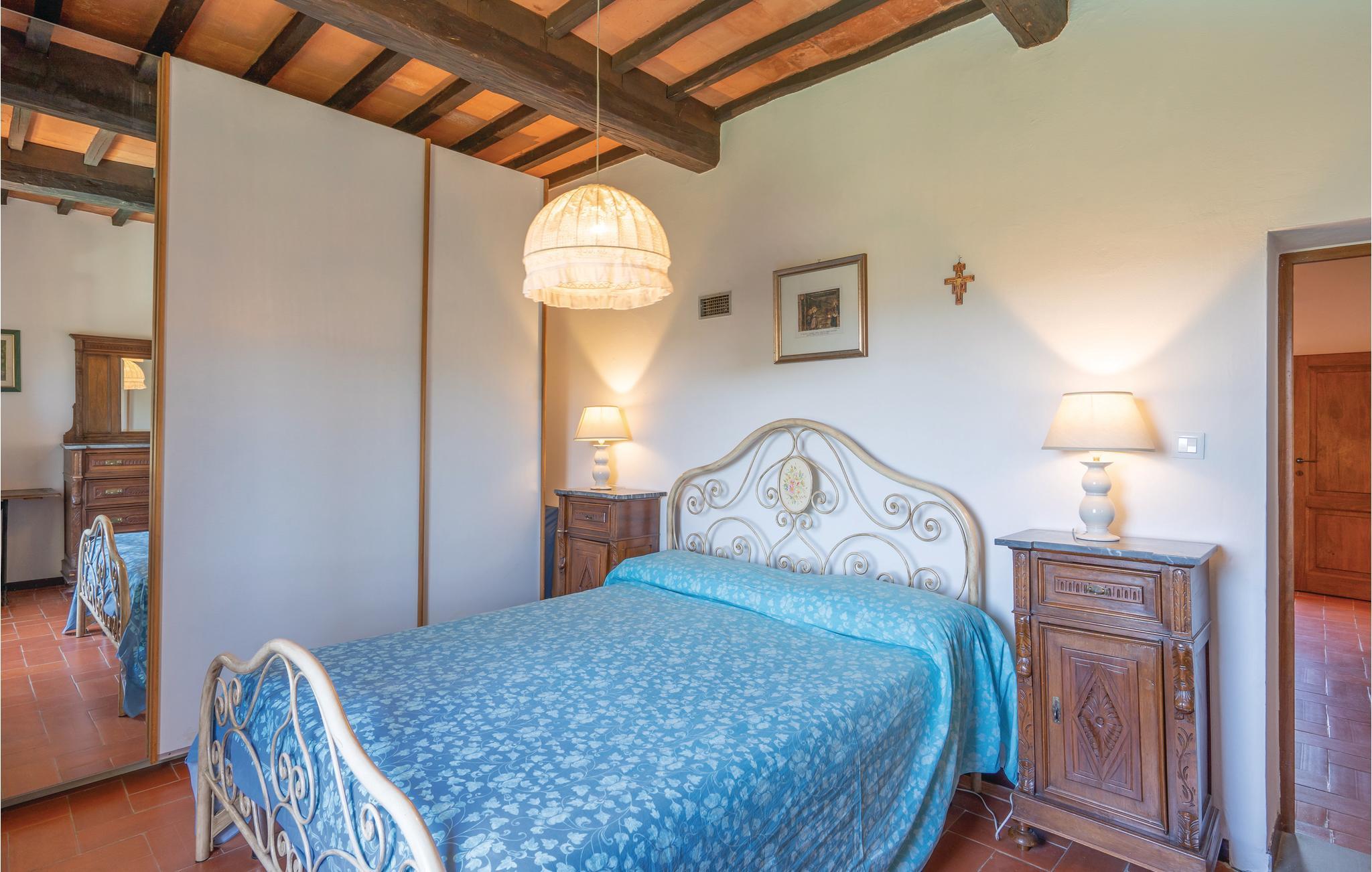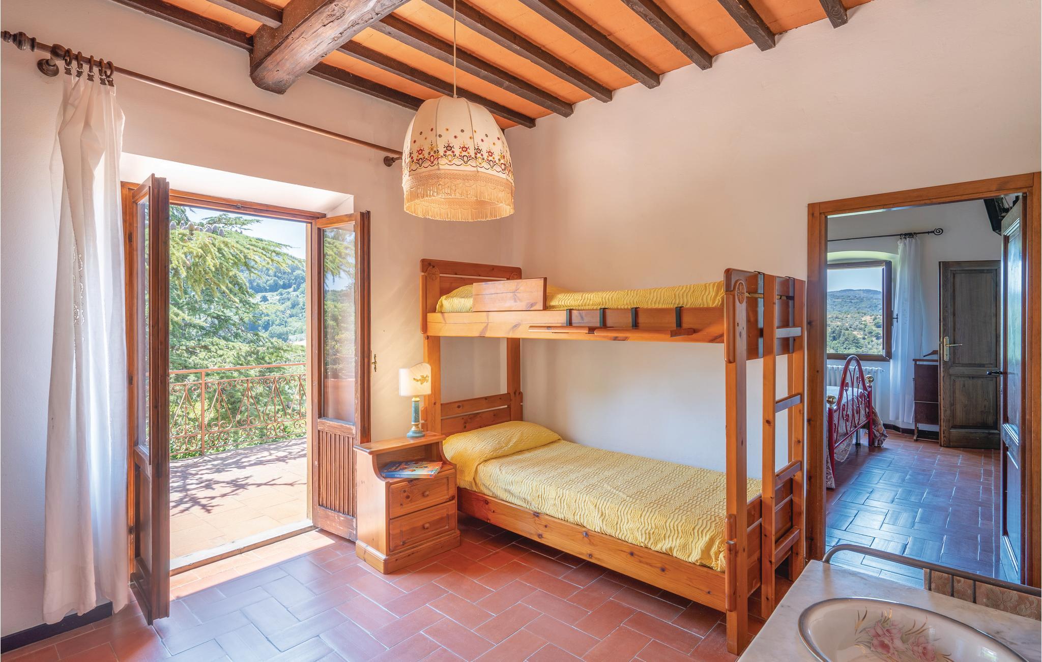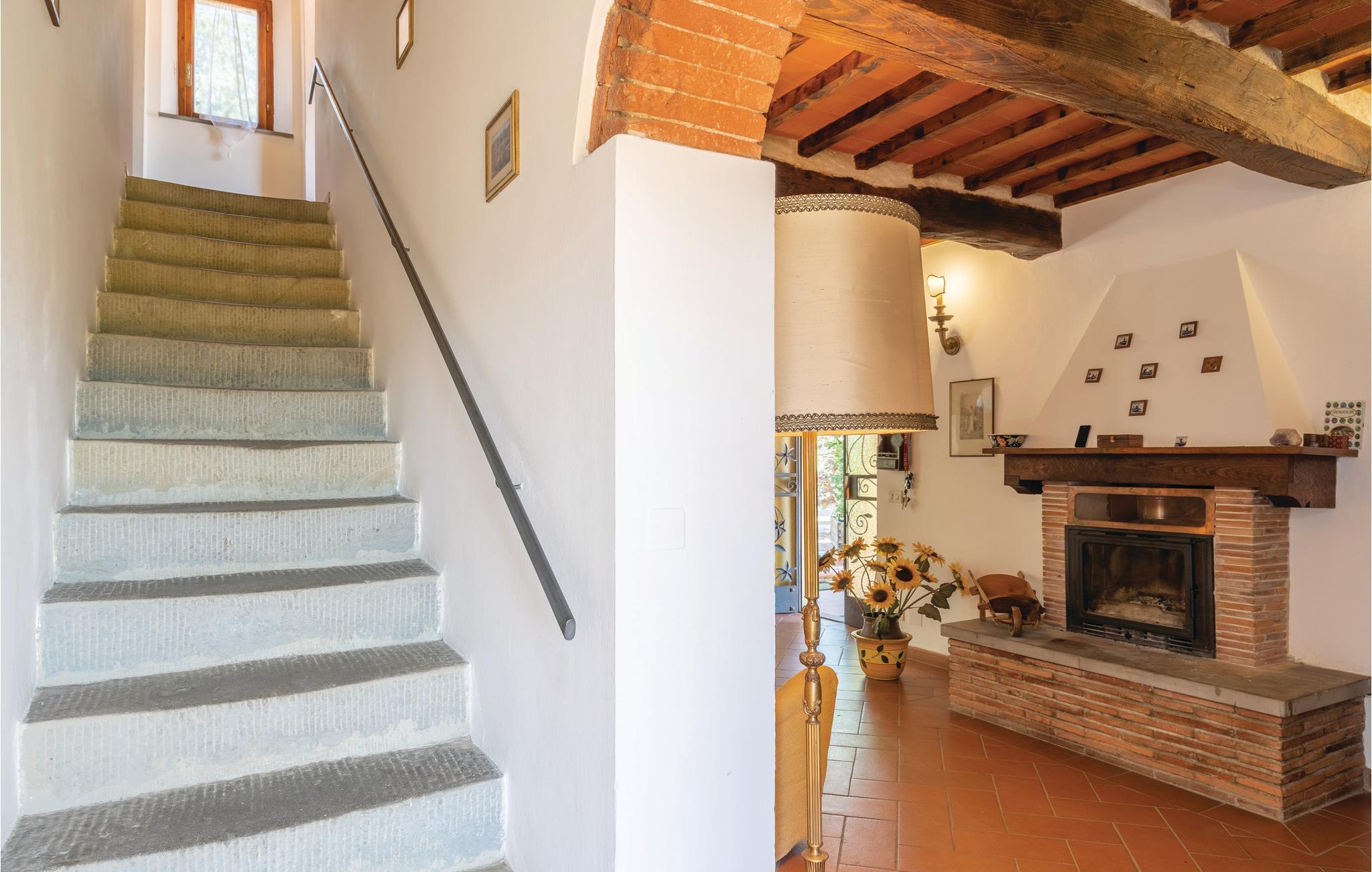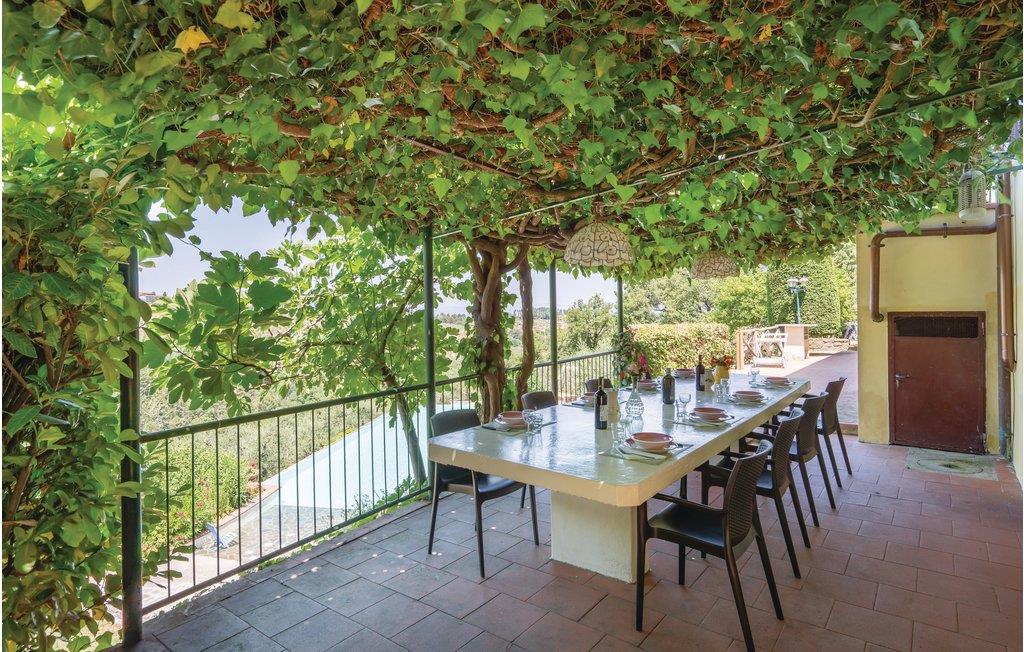 I en helt udsædvanlig panoramabeliggenhed, lige mellem Arnodalen og Chianti, ligger denne ferievilla på en bakke, omgivet af olivenlunde, kun en km fra den smukke by Moncioni. Feriehuset har været landsted for en florentinsk familie, er hyggeligt indrettet med stil og benyttes nu kun som feriebolig. I stueplan ligger det store opholdsrum med åben kamin, der er spisestue og et godt indrettet køkken. Soveværelserne og to badeværelser ligger på første sal, hvor der også er en skøn terrasse med vid udsigt. Foran huset er der en kæmpe terrasse, med overdækkede siddepladser og et godt udstyret sommerkøkken med grill og stenovn hvor I kan bage pizza. Men det bedste er den underliggende pool, med rampe, whirlpool og børneafdeling og et overløb, der giver illusionen af at svømme lige ud i bakkelandskabet. Ved poolen er der også liggestole og udendørs brusebad. I olivenlunden er der et træhus der appellere til familiens små. En lille sidebygning på grunden er beboet året rundt. Ejer passer på grunden og sælger jer gerne sine egne produkter: olivenolie og Chiantivine. Det vil sikkert være svært at forlade jeres eget paradis men I bor ikke langt fra talrige gode udflugtsmål: inden for 50 km; Firenze, Siena og Arezzo. Tilkørsel ad grusvej, der er med mange huller.