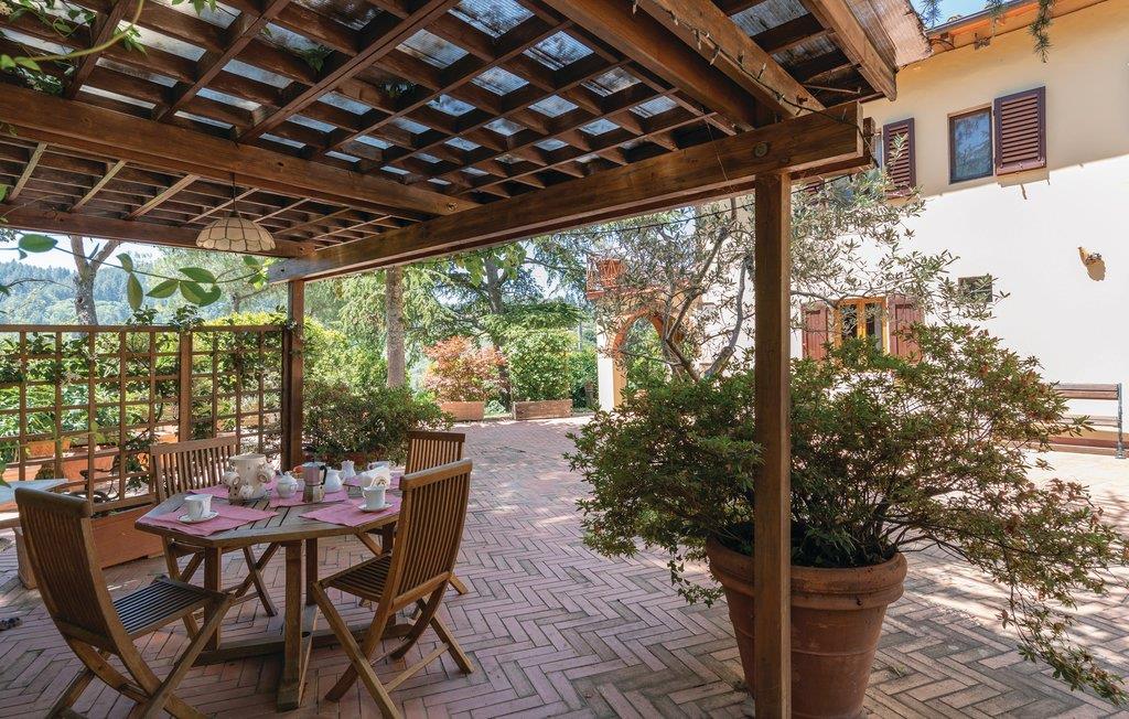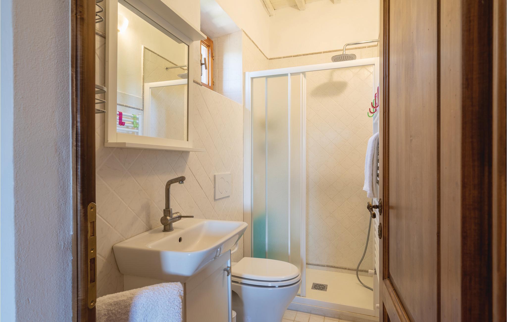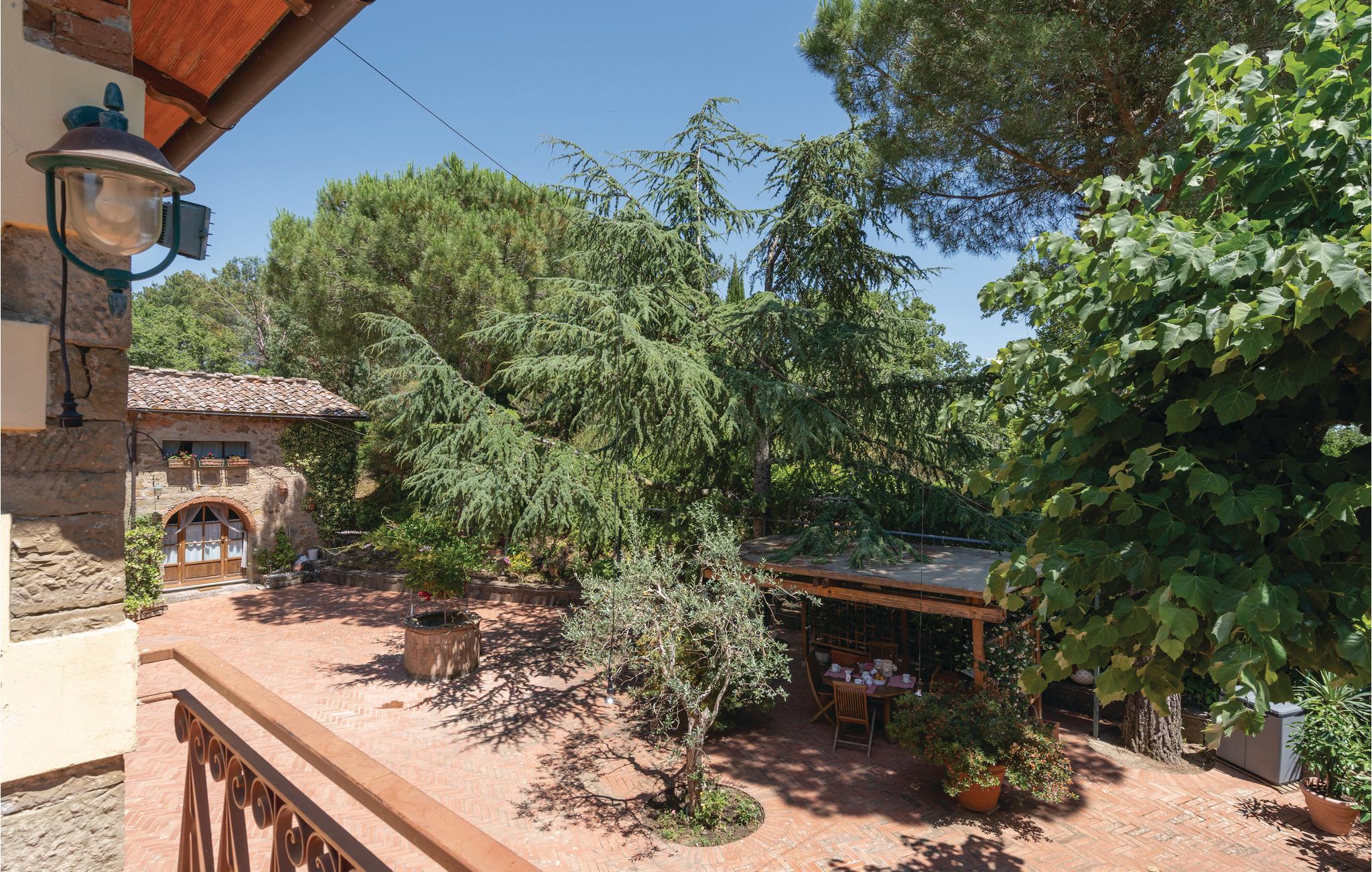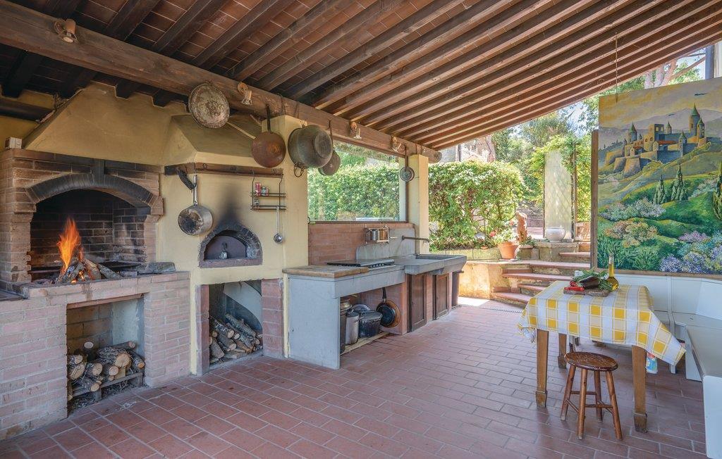 I en helt udsædvanlig panoramabeliggenhed, lige mellem Arnodalen og Chianti, ligger denne ferievilla på en bakke, omgivet af olivenlunde, kun en km fra den smukke by Moncioni. Feriehuset har været landsted for en florentinsk familie, er hyggeligt indrettet med stil og benyttes nu kun som feriebolig. I stueplan ligger det store opholdsrum med åben kamin, der er spisestue og et godt indrettet køkken. Soveværelserne og to badeværelser ligger på første sal, hvor der også er en skøn terrasse med vid udsigt. Foran huset er der en kæmpe terrasse, med overdækkede siddepladser og et godt udstyret sommerkøkken med grill og stenovn hvor I kan bage pizza. Men det bedste er den underliggende pool, med rampe, whirlpool og børneafdeling og et overløb, der giver illusionen af at svømme lige ud i bakkelandskabet. Ved poolen er der også liggestole og udendørs brusebad. I olivenlunden er der et træhus der appellere til familiens små. En lille sidebygning på grunden er beboet året rundt. Ejer passer på grunden og sælger jer gerne sine egne produkter: olivenolie og Chiantivine. Det vil sikkert være svært at forlade jeres eget paradis men I bor ikke langt fra talrige gode udflugtsmål: inden for 50 km; Firenze, Siena og Arezzo. Tilkørsel ad grusvej, der er med mange huller.