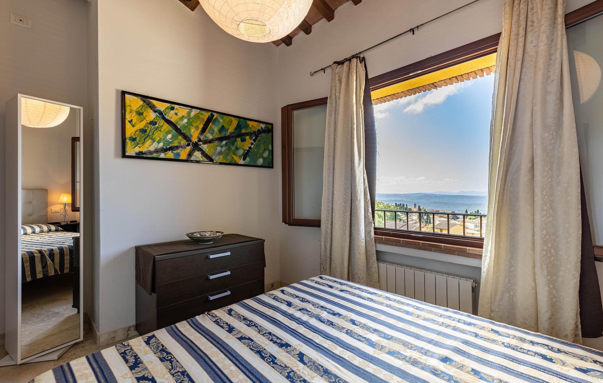 Hold en afslappende ferie på landet og slap af med familien i denne veludstyrede ferielejlighed. I husets stueetage er der alt, hvad I skal bruge til en ubekymret ferie. Højt til loftet, flot udsmykning og spisekøkkenet lægger op til at slappe af med retterne indenfor. Men I kan også finde gode steder udendørs på verandaen eller den overdækkede terrasse med udsigt over landskabet. Derudover har grunden en fællespool, hvor I kan snuppe friske dukkerter og solbade.
