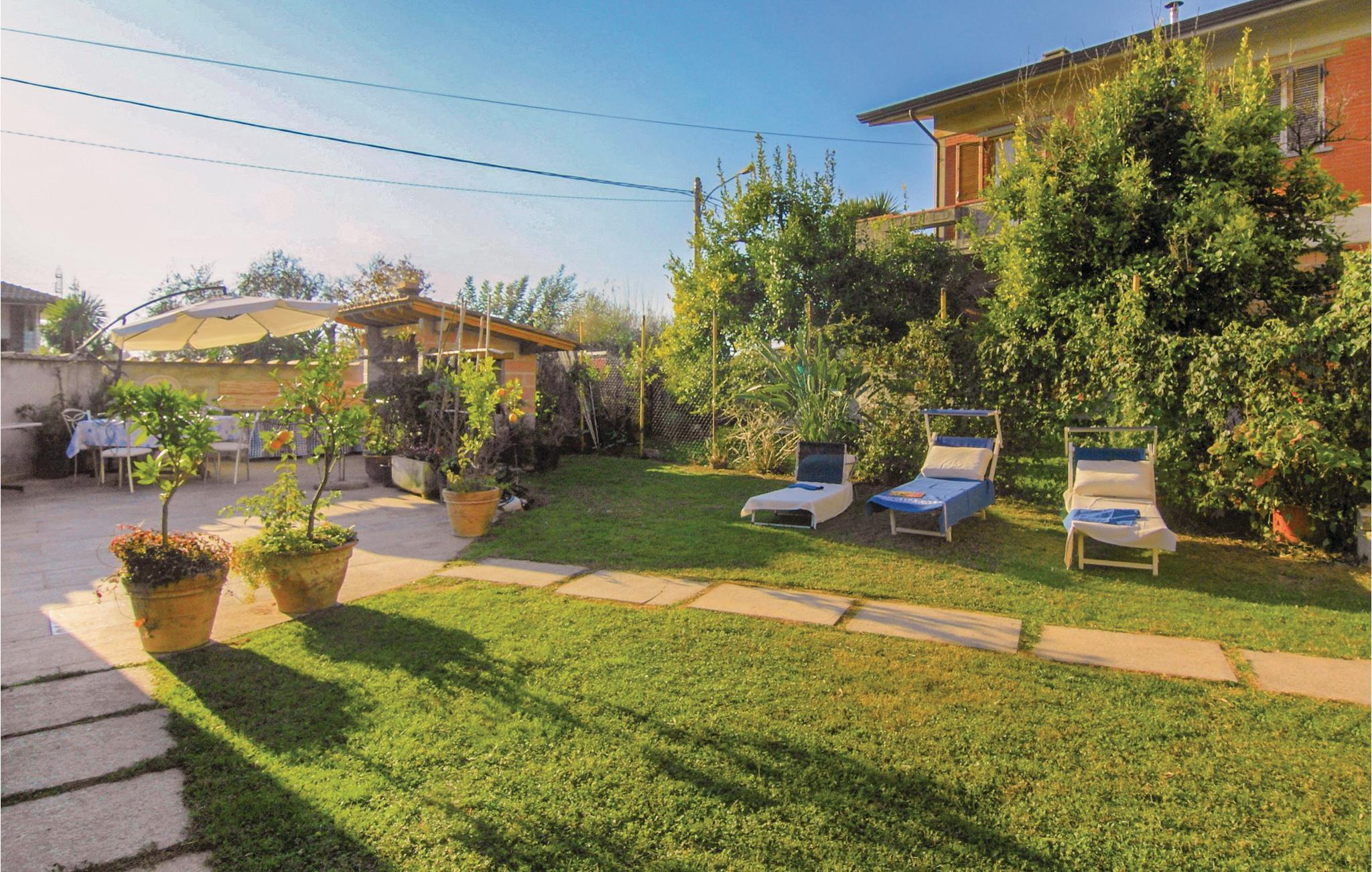 Ferielejlighed i et tofamiliehus med åbne terrasser og overdækket veranda, der ligger i en privat have med havemøbler i Versilia. I befinder jer i Montignoso, i et fredeligt landområde, 3,2 km fra strandene ved Cinquale. Ejendommen ligger ca. 4 km fra Massa, 7 km fra Forte dei Marmi, 9 km fra Pietrasanta, 43 km fra Lucca og Pisa, 54 km fra Cinque Terre og 109 km fra Firenze. Fra huset r der udsigt til de skovklædte bakker i Versilia og til de Apuanske Alper. Ejerne bor i den anden lejlighed på første sal med separat indgang. Grunden (ca. 200 m²) er indhegnet, her er græsplæne, have og lille grøntsagshave, bord, stole og parasol, en muret ovn og en grill, solstole og legeplads. Den overdækkede veranda (ca. 15 m²) er indrettet som en udendørs stue med infrarødvarme. Der er 4 cykler til rådighed. I kan fiske i en nærliggende sø (1,3 km), spise grøntsager fra urtehaven, og købe oksekød og svinekød samt andre spiselige specialiteter som ejer selv har fremstillet.