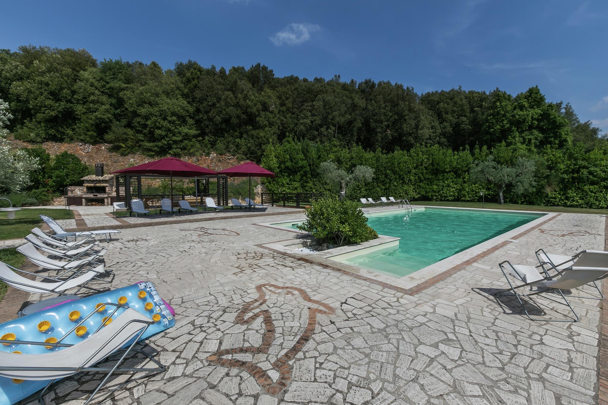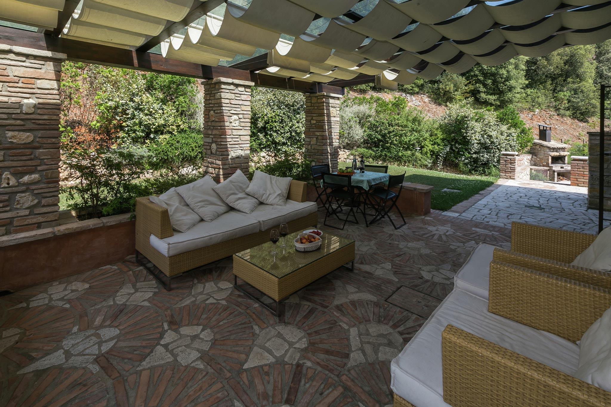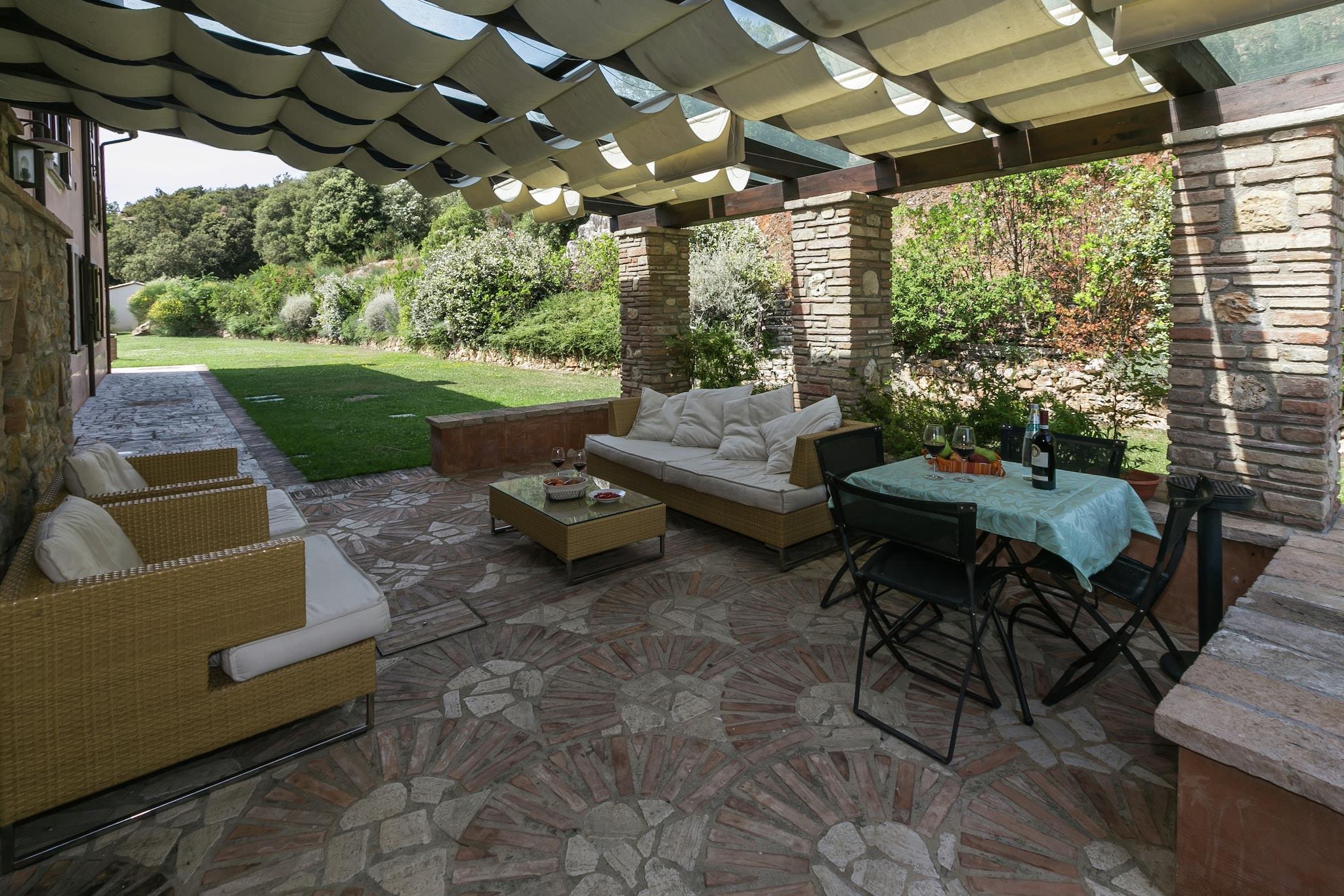 På 1. etage: (Stue(Fjernsyn, spisebord, pejs, sofahjørne), åbent køkken(kogeplade, emhætte, ovn, mikrobølgeovn, opvaskemaskine , køle-fryseskab), soveværelse(køjeseng), soveværelse(dobbeltseng), badeværelse(badekar med bruser, Bubble bath, håndvask, toilet, bidet), åbent rum(enkeltseng)) spisebord, vaskemaskine(deles med andre gæster), varme, terrasse, have(deles med andre gæster, > 1000 m2), havemøbler, solstole, grill(deles med andre gæster), Parasol, swimmingpool(deles med andre gæster, 14 x 7 m., opened from Jun upto and including Sep), baldakin