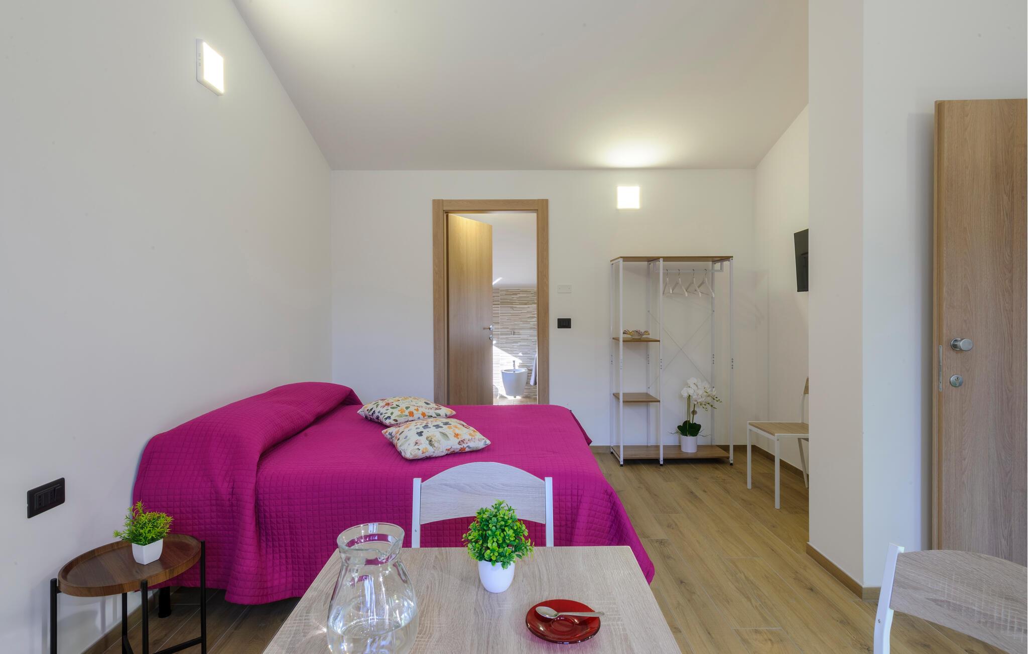 Velkommen til denne dejlige lejlighed, der ligger i en bygning med flere ferieboliger, smukt omgivet af oliventræerne, og med en skøn udsigt over landskabet. Hvis I gerne vil rejse som en større flok, kan I booke flere lejligheder i huset og nyde et ophold med det helt rette mix af sociale stunder og privatlivets fred. Lejligheden er flot indrettet med lyse farveskalaer, moderne komfort og et veludstyret køkken, hvor I kan tilberede en lækker morgenmad, som kan nydes på terrassen med en god kop kaffe og udsigt over landskabet i Pescaras bagland.