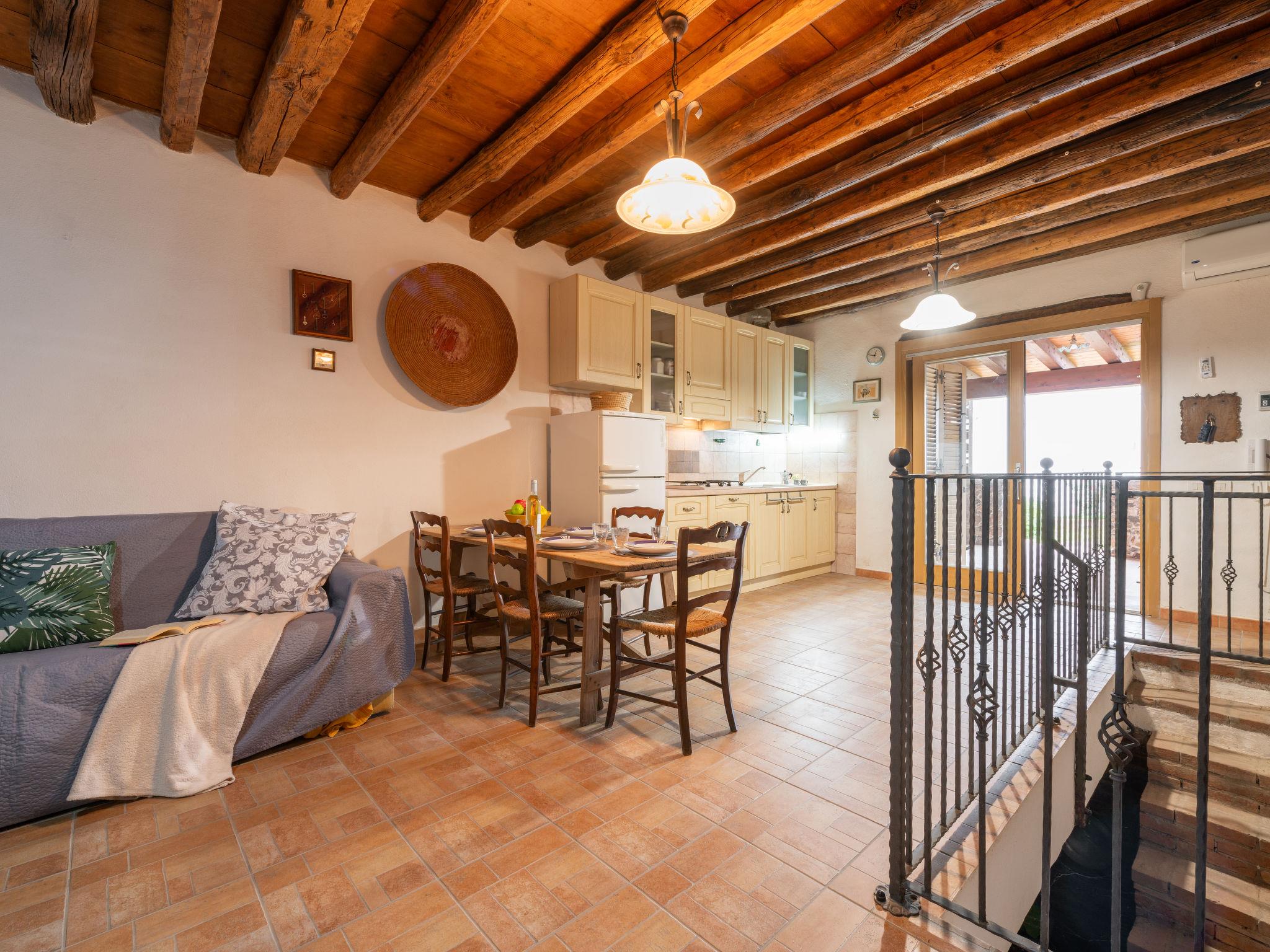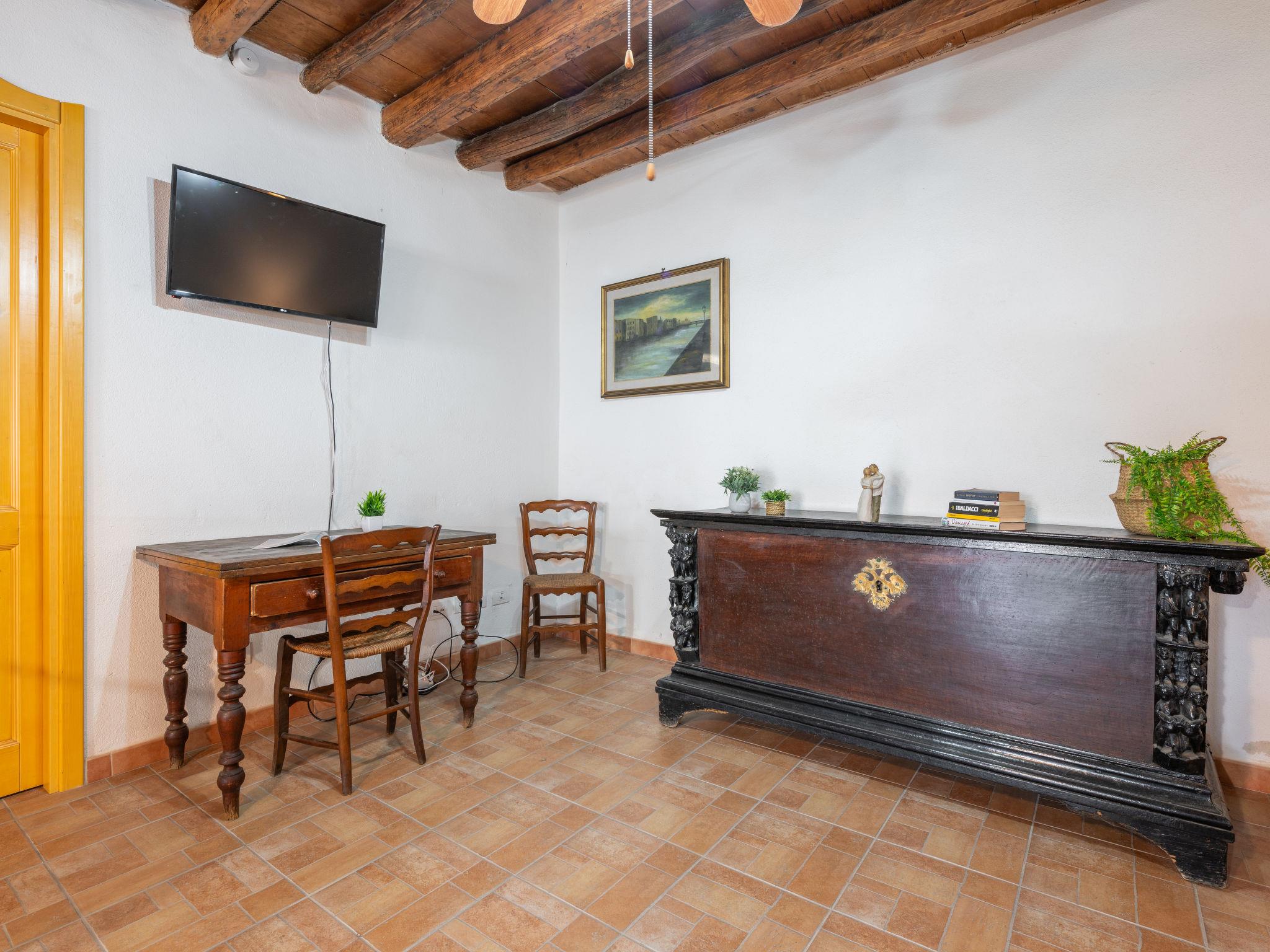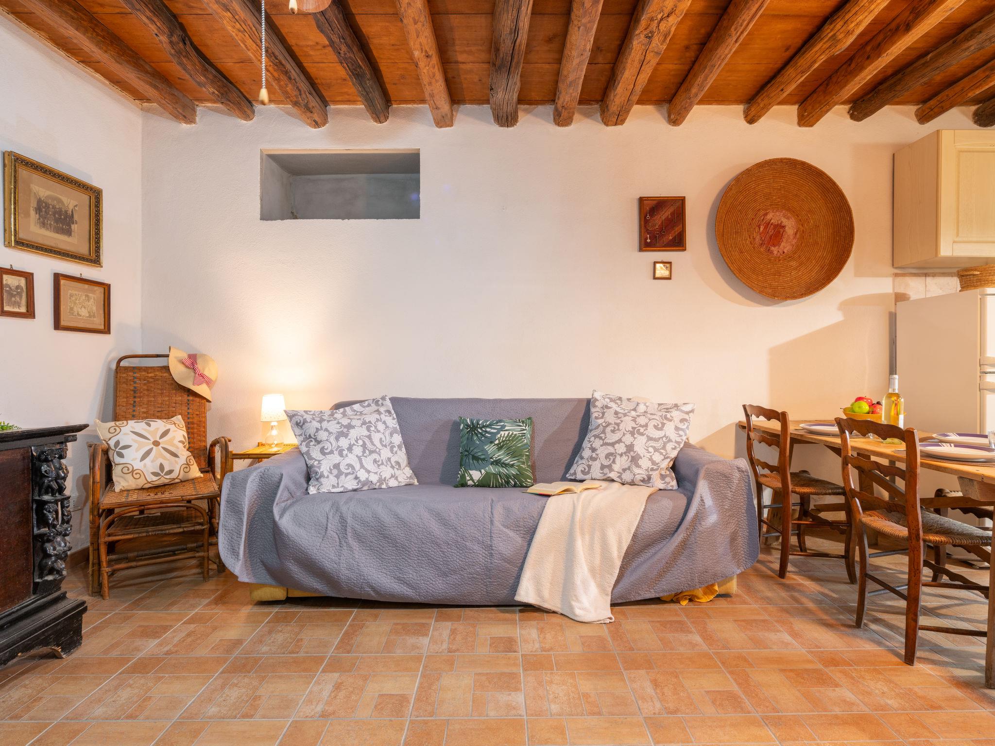 "Cadoni", 2-room house on 2 levels, on the ground floor. Antique and cosy furnishings: large living/dining room with 1 double sofabed, dining table, TV, air conditioning, fan and forced-air heating. Exit to the garden. Kitchen (4 gas rings, toaster, kettle). Shower/bidet/WC. Upper floor: 1 large room with 2 beds, 1 double bed, air conditioning, fan and forced-air heating. Shower/bidet/WC. Large terrace roofed, garden. Terrace furniture, barbecue. View of the resort. Facilities: washing machine, iron, children's high chair, baby cot (extra), hair dryer. IT111042C2000R7956