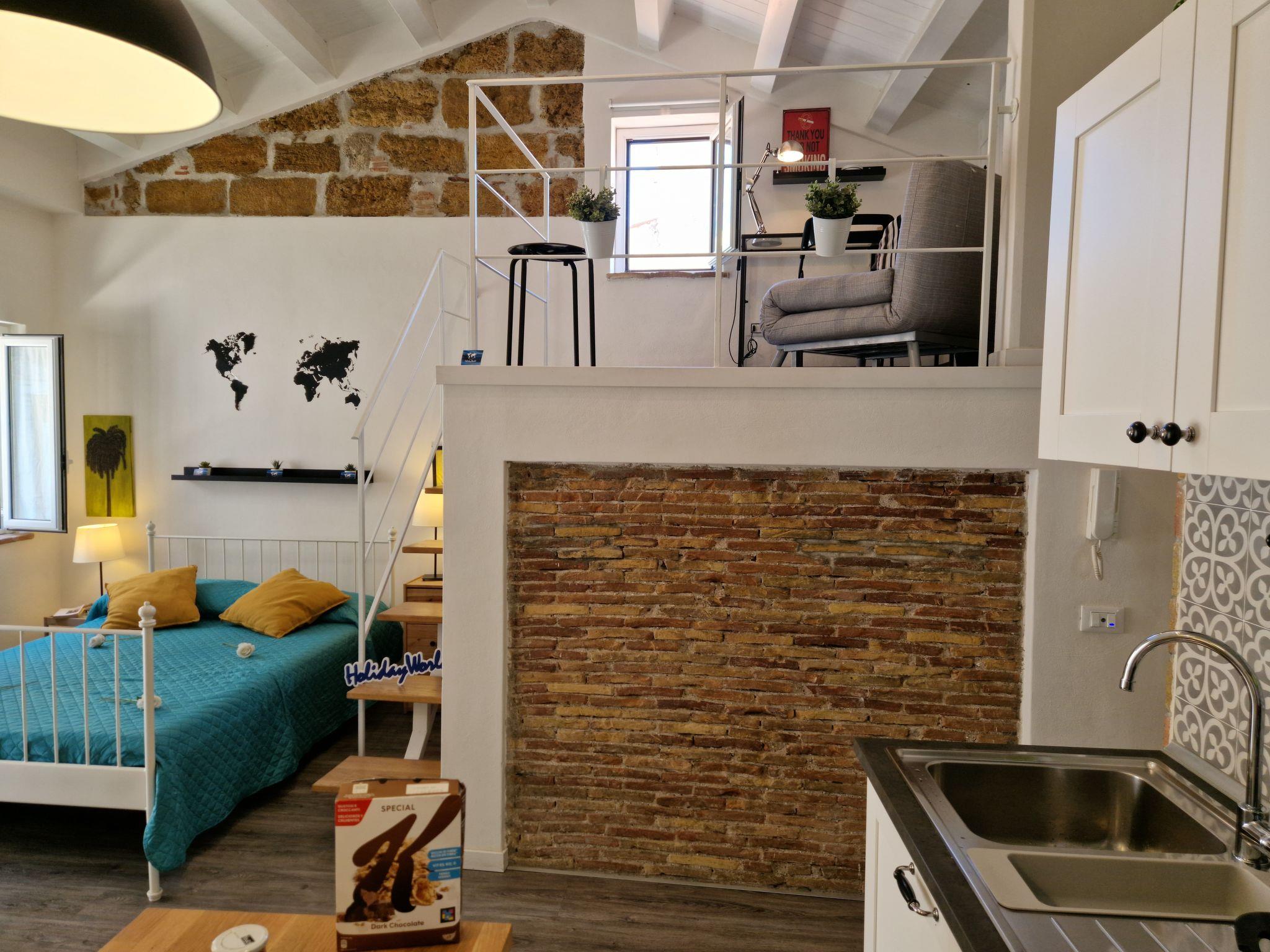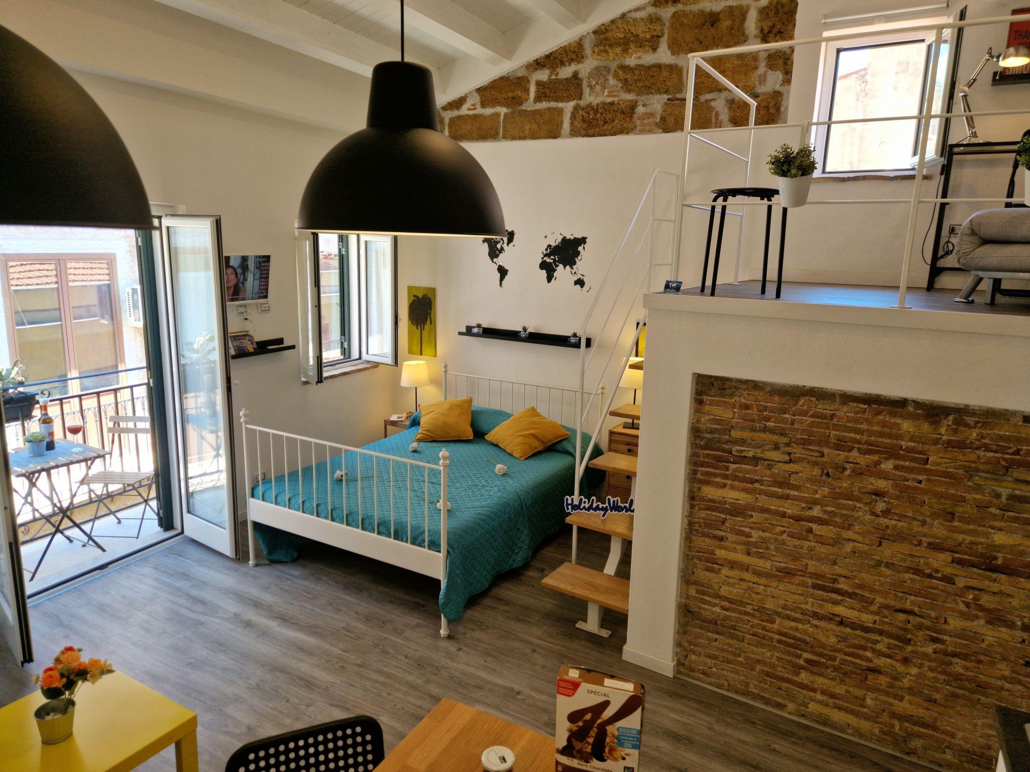 The Fico D'india is a bright and practical studio apartment and is located in the heart of Palermo's lively movida, in a central area full of life and amenities. The room is cosy and well-organised, with a functional kitchenette, a double bed and a comfortable sofa bed, ideal to accommodate several people. An elegant mezzanine enriches the space by offering a single armchair bed, perfect for an additional sleeping place or for relaxing moments. The flat also features a modern bathroom, complete with shower and bidet, finished with attention to detail. The balcony provides natural light throughout the day and a pleasant outdoor space to enjoy the urban atmosphere.