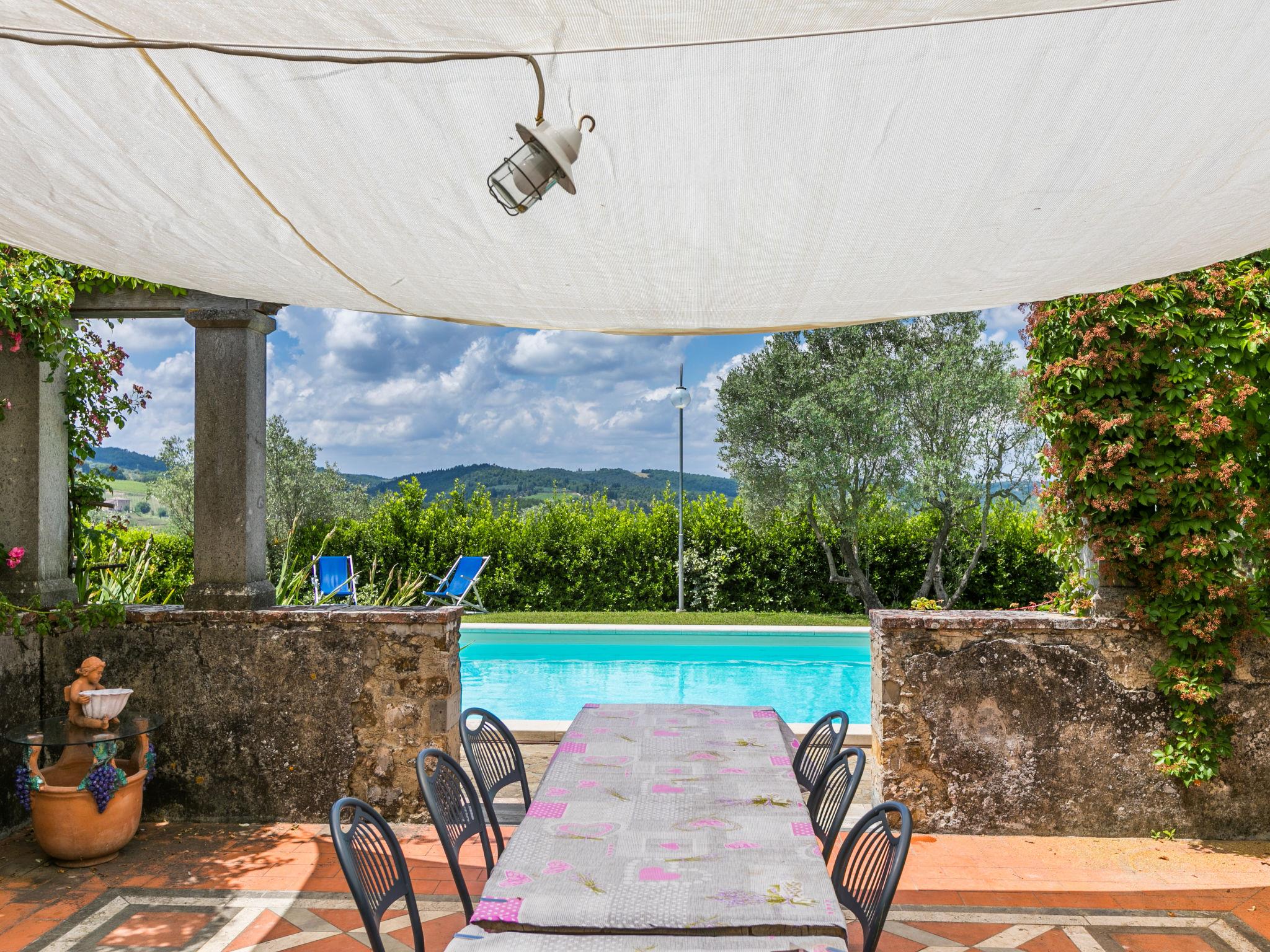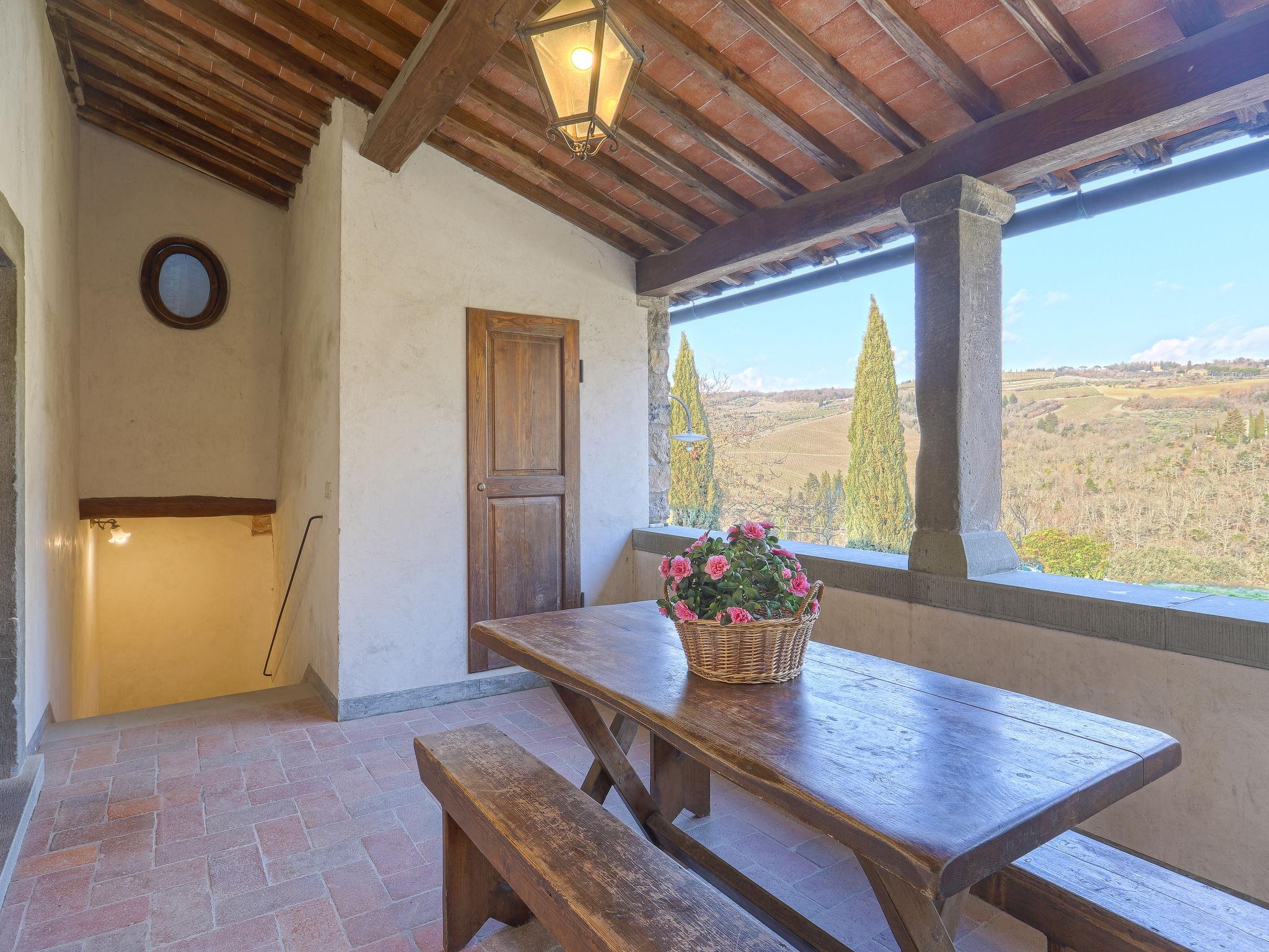 Cosy on a vinyard "Reggine", from the 18th century, renovated, surrounded by meadows and fields. 3 km from the centre of Panzano, 10 km from the centre of Greve in Chianti, 40 km from the centre of Firenze, in a secluded, elevated position, in the countryside. For shared use: property with lawn, orchard, swimming pool (12 x 6 m, seasonal availability: 01.May. - 15.Oct.). Outdoor shower, pergola, terrace, garden furniture, barbecue, pool maintenance by the owner/gardener. Motor access (2.4 km via unmade road). Parking on the premises. Shop 3 km, grocery 3 km, supermarket 10 km, restaurant 3 km, bakery 3 km, bus stop 3 km, indoor swimming pool 21 km. Golf course (18 hole) 25 km. Nearby attractions: Radda in Chianti 15 km, Siena 40 km, San Gimignano 40 km. Please note: car recommended. Baby equipment (included). Groups of teenagers on request only. Local sale of farm products. Owner uses some rooms in the house. All houses/apartments are individually designed/furnished.