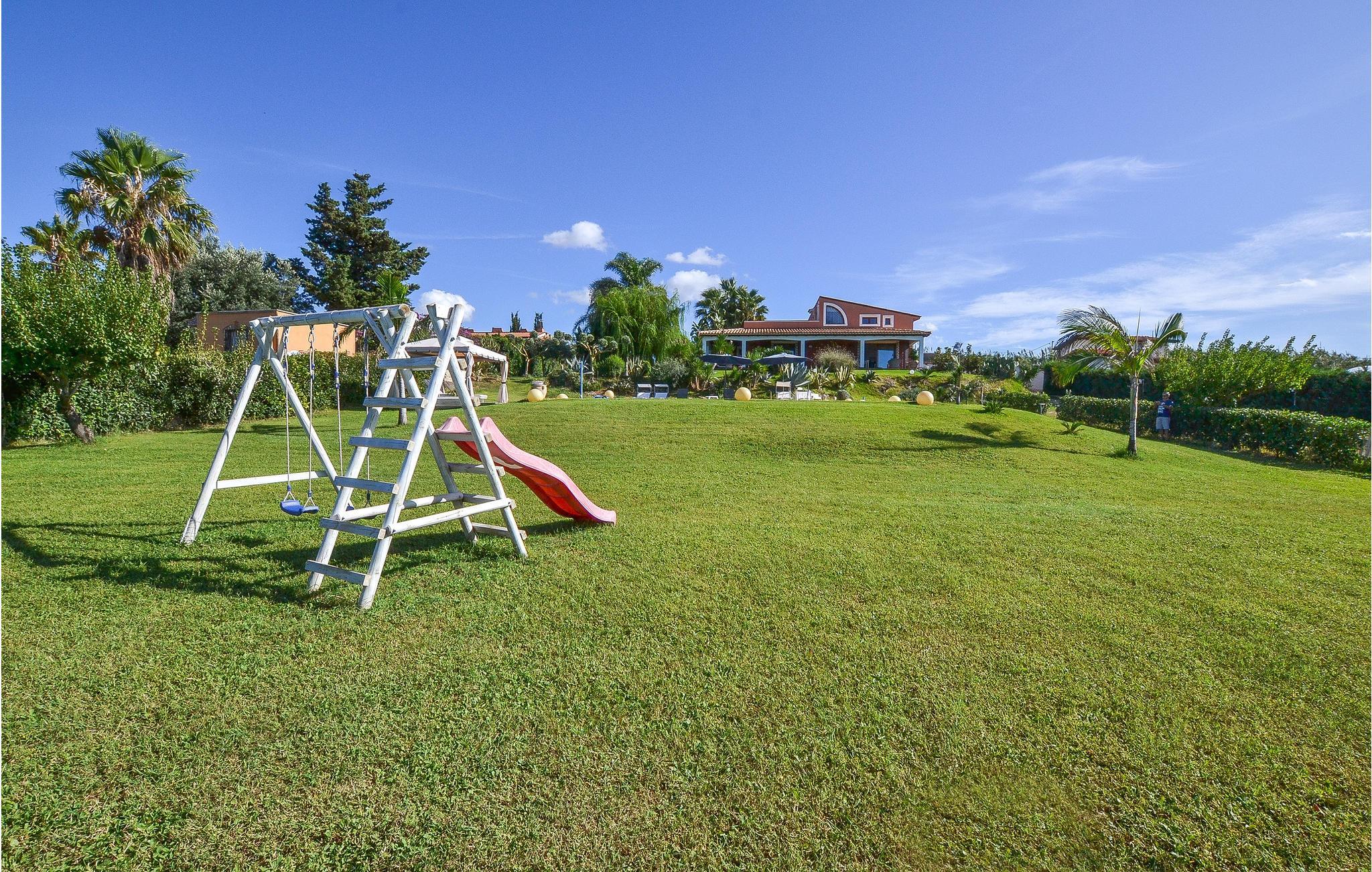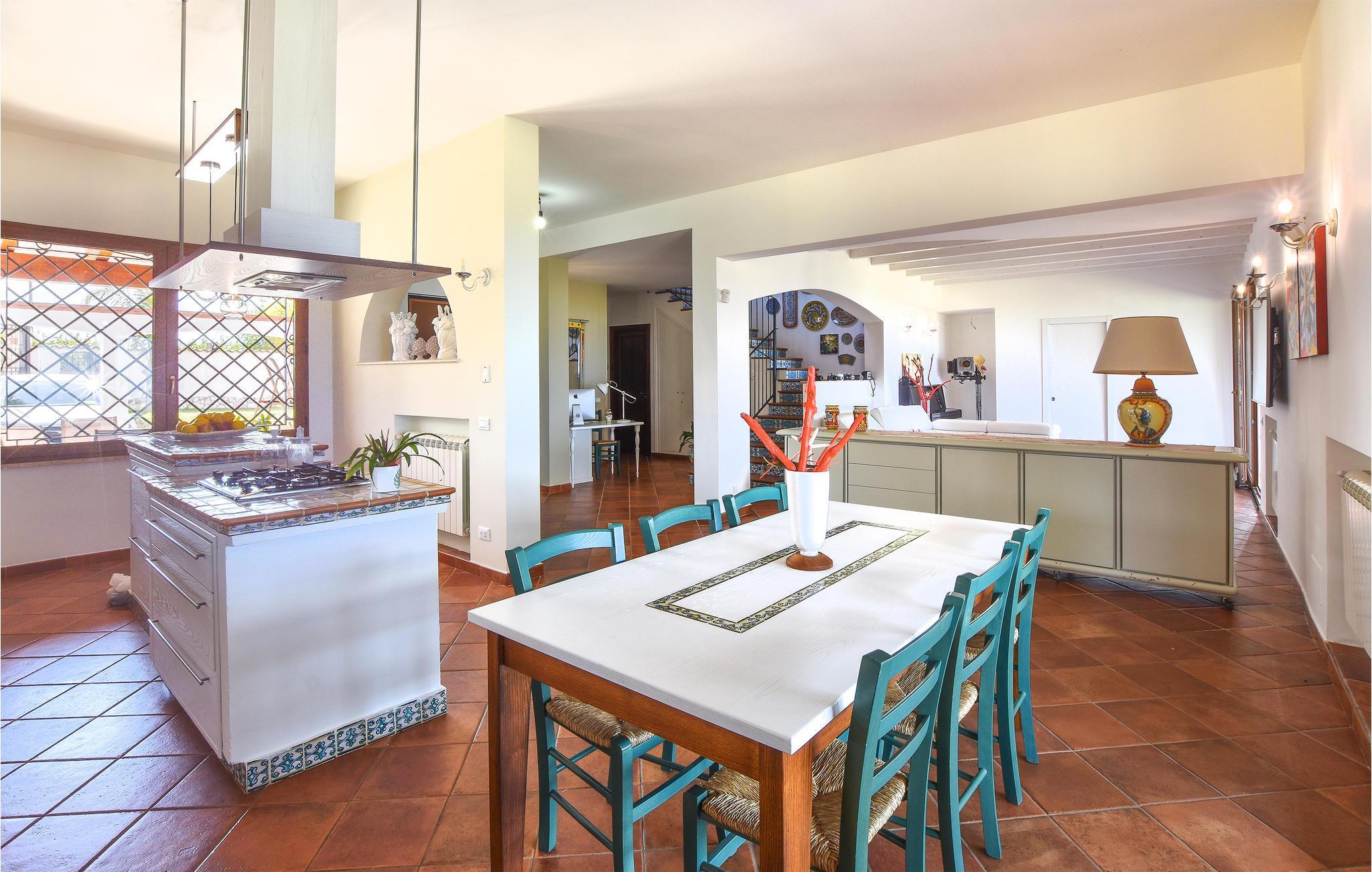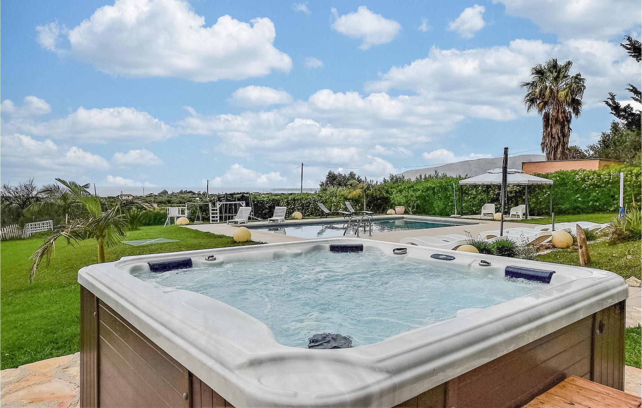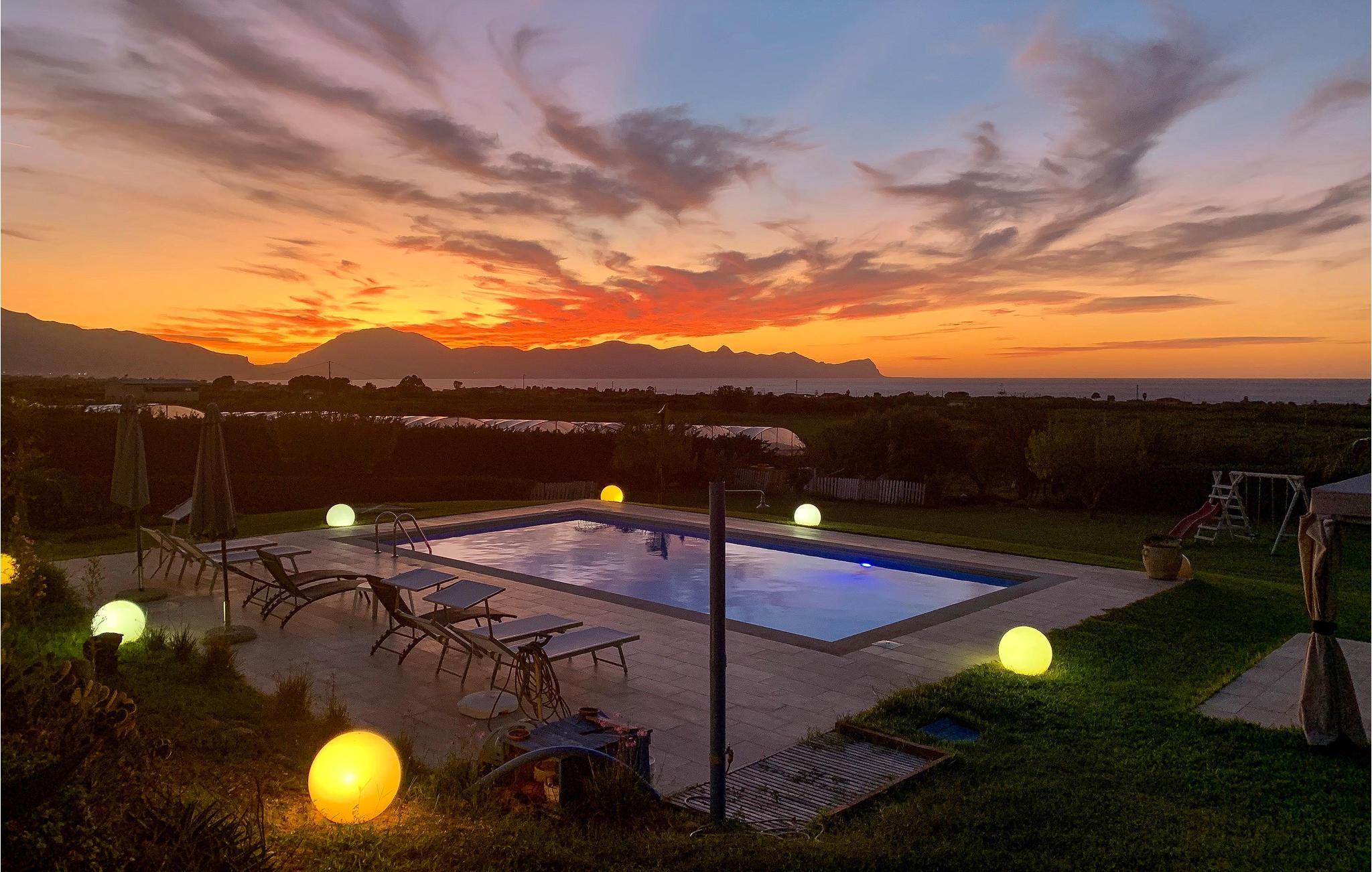 Cirka 2,5 km fra Trappeto, i den storslåede natur i Castellammare Golf, finder du dette store sommerhus med pool og raffineret atmosfære. Huset er omgivet af en smuk have (4000 m²) med græsplæne, damme og masser af plads til leg for børnene. Den panoramiske pool er ideel til afkøling på de utallige solrige, sicilianske dage. Ejendommen er omgivet af vinmarker og landlige omgivelser på en lille bakke, hvorfra du kan beundre smukke solnedgange og det vidunderlige panorama, der strækker sig fra klipperne i Cala Rossa til San Vito lo Capo. Til din rådighed er en smuk og stor overdækket terrasse, hvor du kan spise med smuk udsigt, et stort lysthus og liggestole til afslapning. Med sin privilegerede beliggenhed lige ved Palermo og Trapani kan du nemt komme til de smukkeste steder i det vestlige Sicilien: Palermo, Monreale, Segesta, Selinunte, Egadi-øerne og mange andre. I stueetagen af huset er en stor opholdsstue med kogeø.