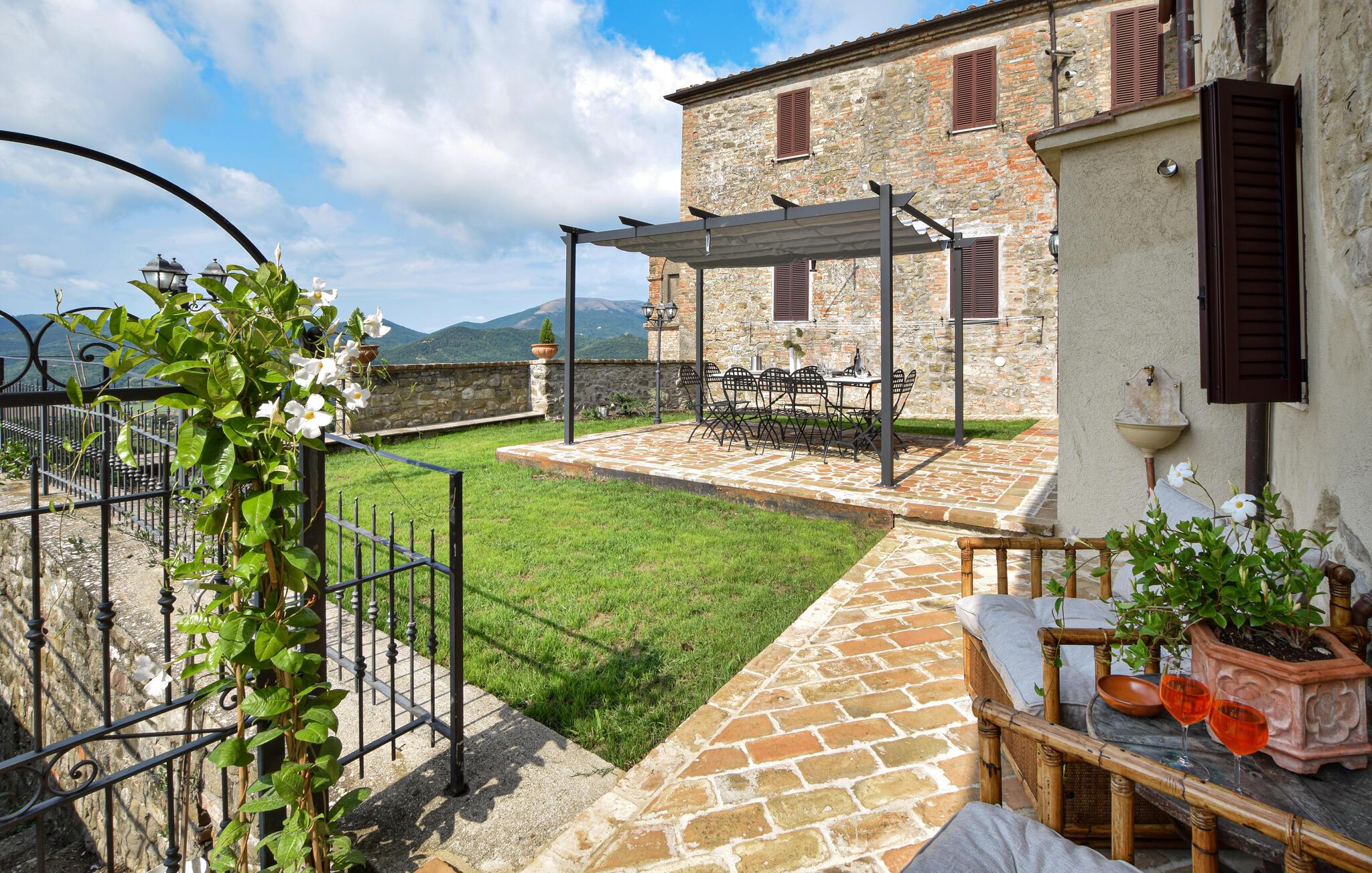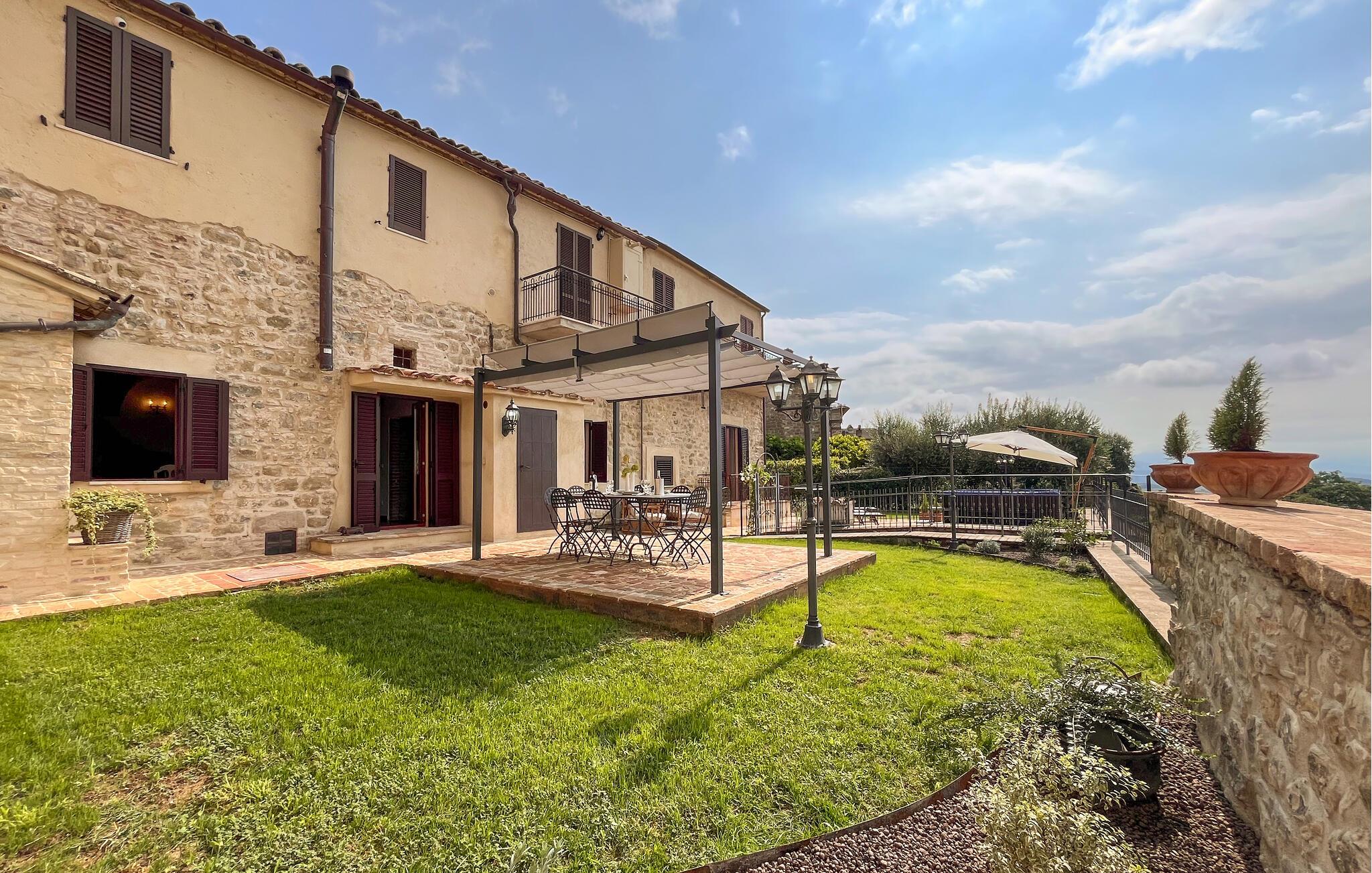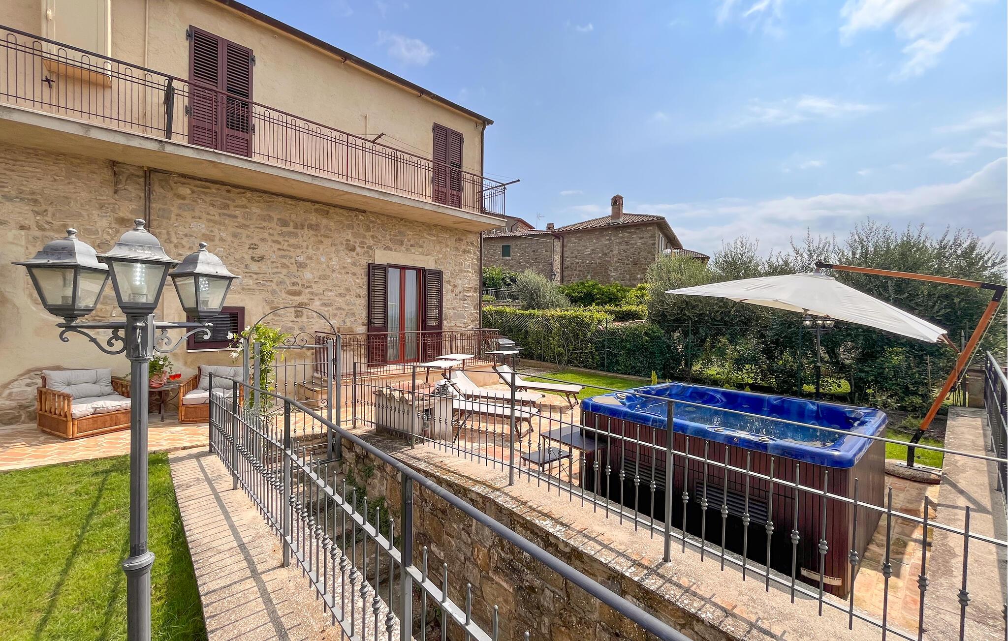 Takket være den højt beliggende beliggenhed tilbyder det velholdte udendørsområde en storslået panoramaudsigt over det maleriske landskab. Her kan I nyde afslappende øjeblikke i spabadet og afslappende siestaer på behagelige liggestole. Tænd op i grillen og nyd stemningsfulde måltider på den indbydende terrasse.