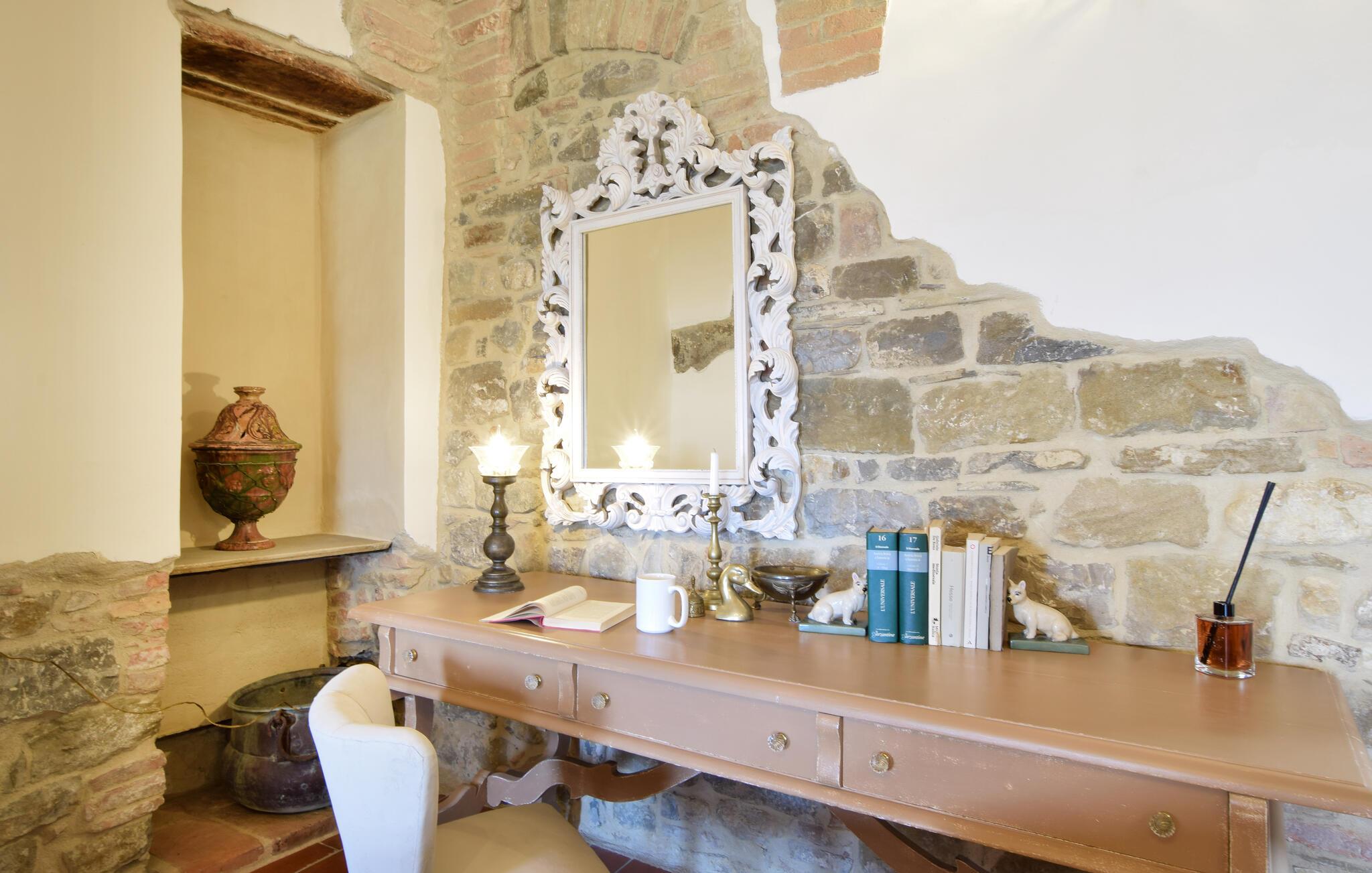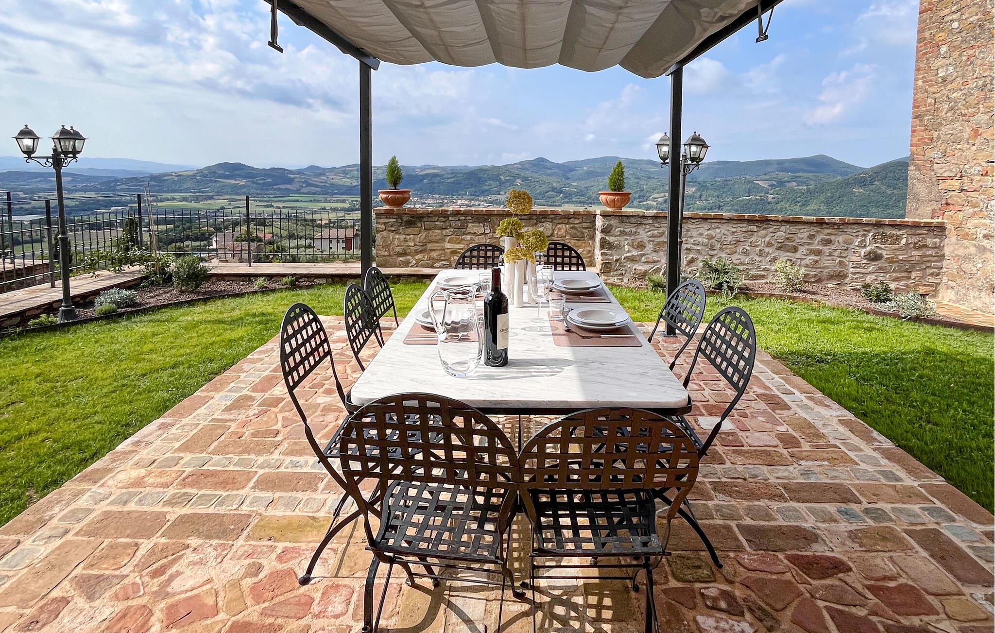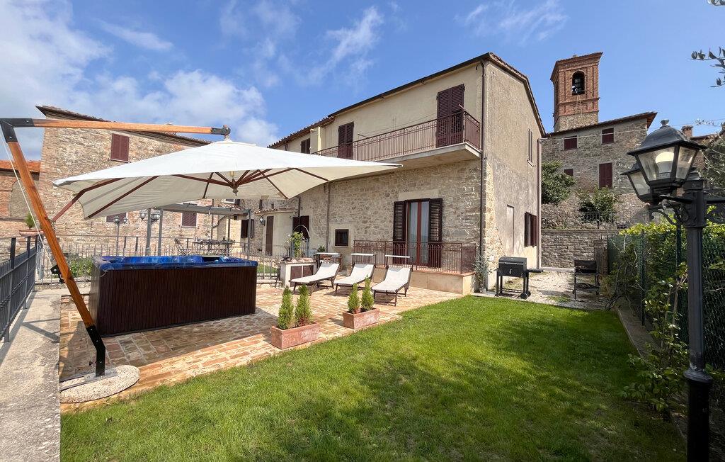 Takket være den højt beliggende beliggenhed tilbyder det velholdte udendørsområde en storslået panoramaudsigt over det maleriske landskab. Her kan I nyde afslappende øjeblikke i spabadet og afslappende siestaer på behagelige liggestole. Tænd op i grillen og nyd stemningsfulde måltider på den indbydende terrasse.