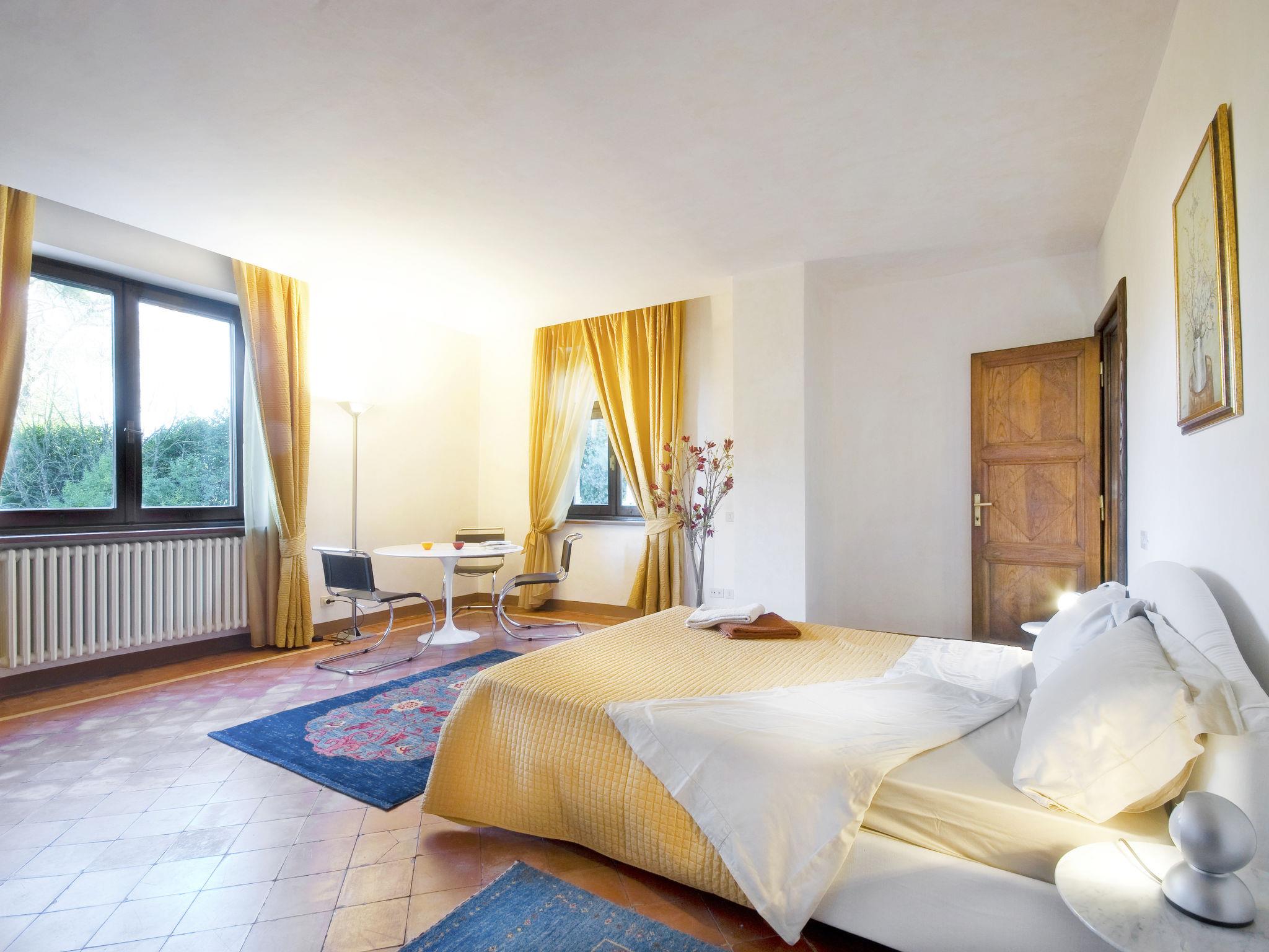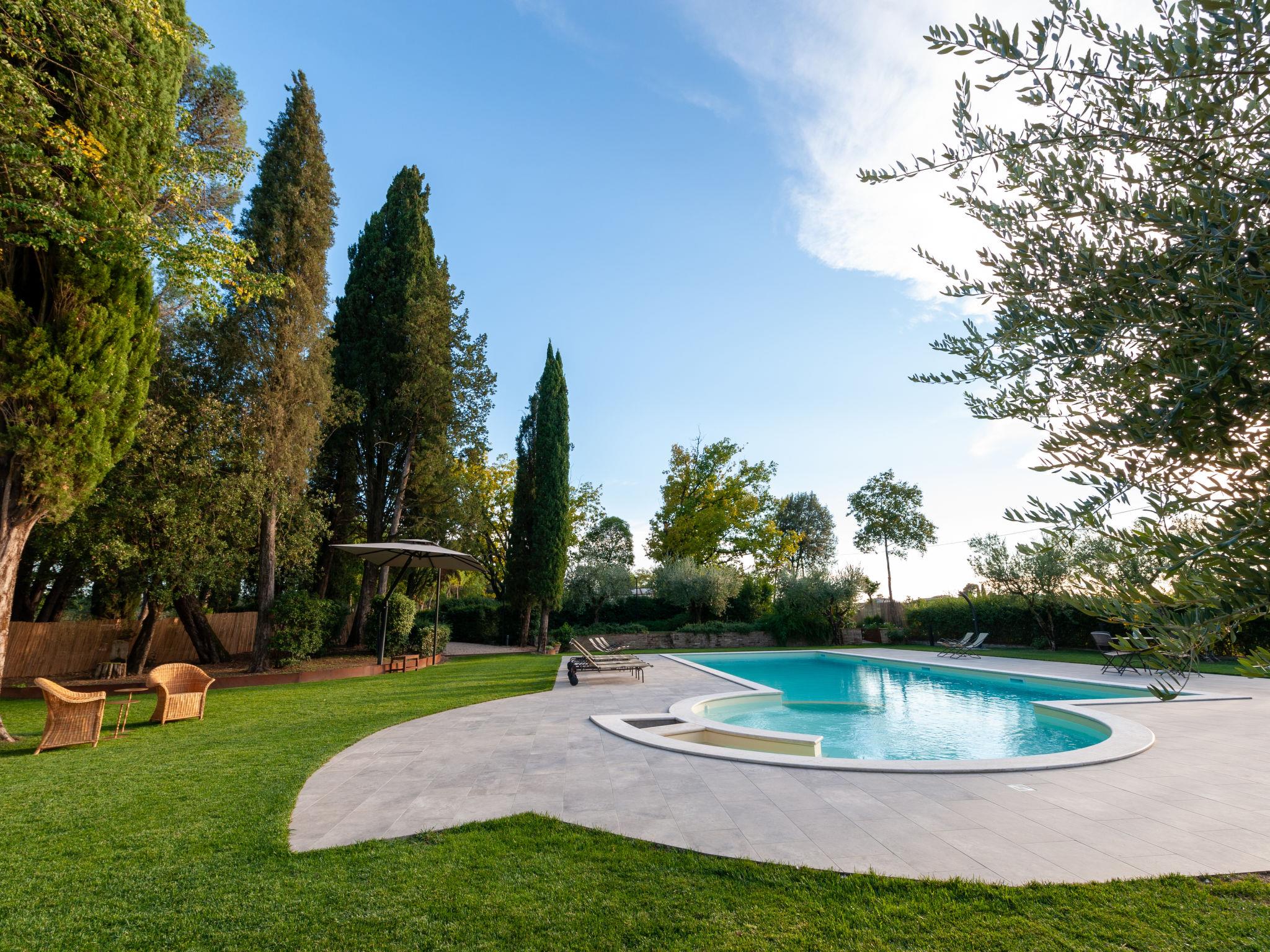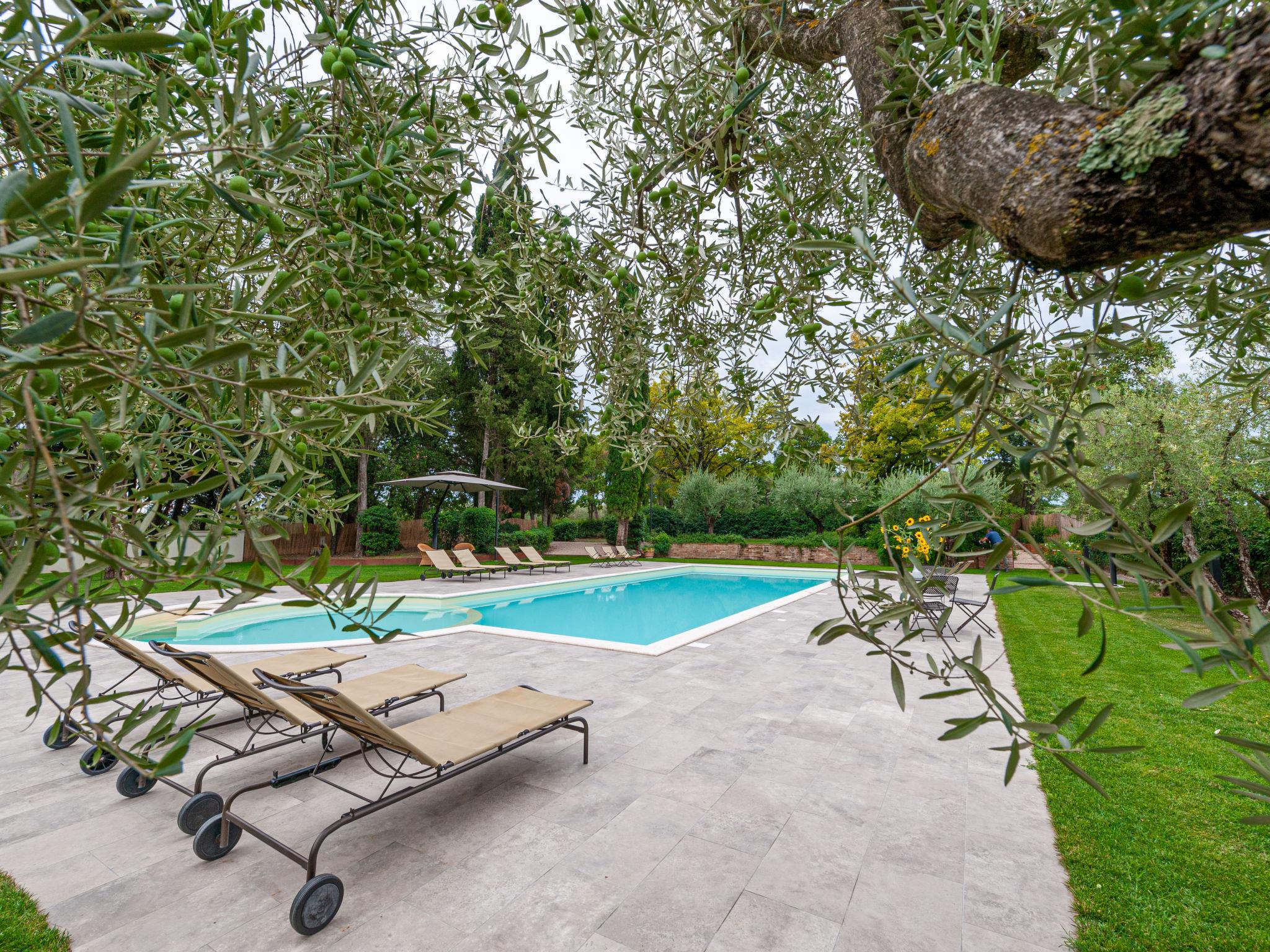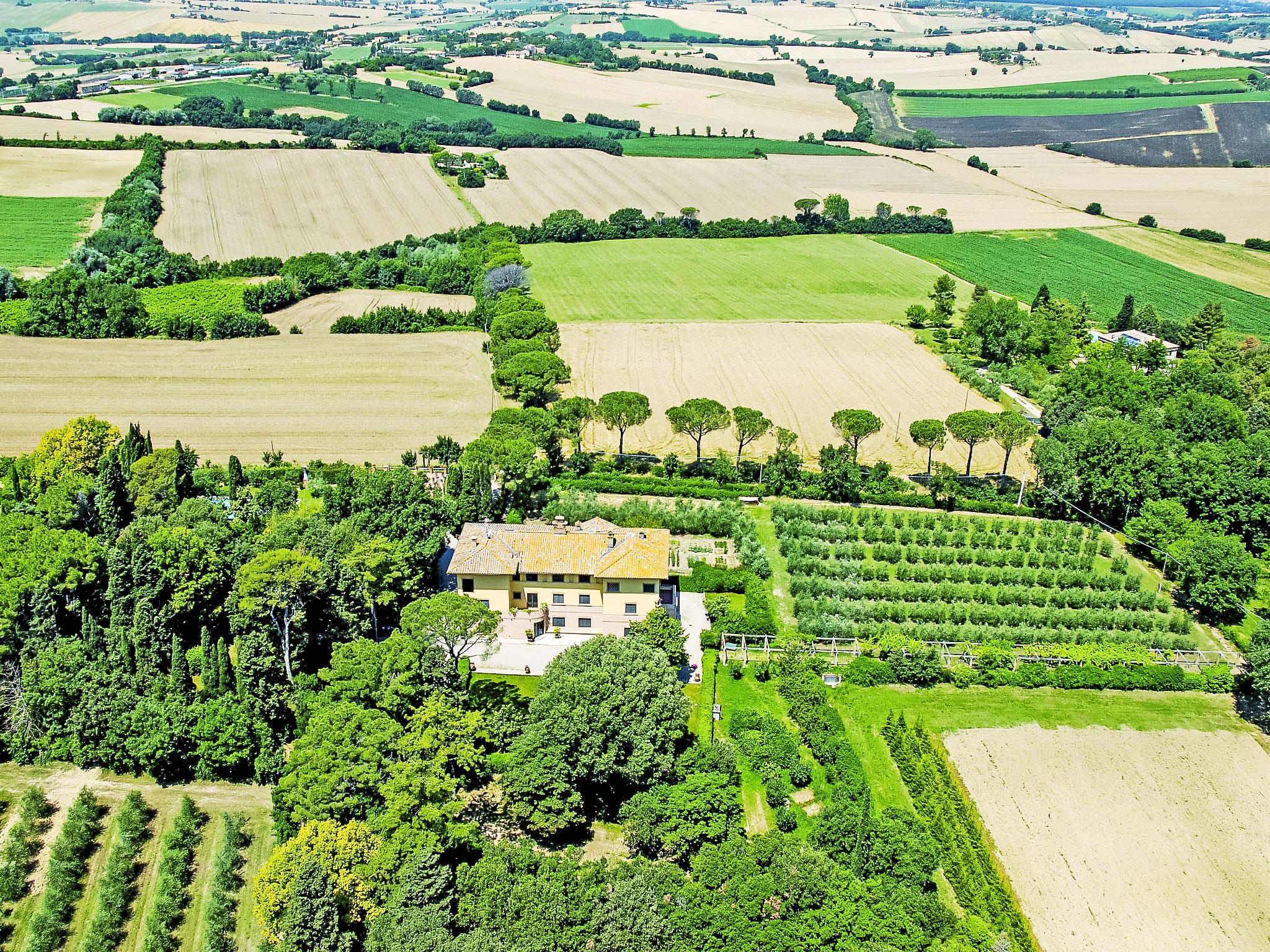 Exclusive 18th century villa immersed in a wonderful park luxurious villa "Angeli", renovated, surrounded by trees. In the hamlet Sant'Enea 10 km from the centre of Perugia, in a quiet, sunny position, 24 km from the lake, in the countryside. Private: property 17 ha (fenced), park, beautiful garden to relax, swimming pool with privacy (6 x 14 m, depth 120 - 140 cm, seasonal availability: 01.May. - 30.Sep.). Unconventional pool shape. Shower/WC in the pool area, outdoor shower, pergola, garden furniture, barbecue house. In the house: WiFi, solarium, washing machine, tumble dryer, heating available only from 15.Oct. - 15.Apr. (extra). Linen change weekly (suppl. charge extra). Room cleaning (extra). Cook on request. Breakfast on request. Pre-arrival grocery service. Motor access (500 m via unmade road). Parking. Grocery 1 km, supermarket 8 km, restaurant 1 km, bathing lake "Trasimeno" 24 km. Golf course (18 hole) 13 km, tennis 10 km, riding stable 10 km. Nearby attractions: Panicale 27 km, Bevagna 30 km, Todi 33 km, Passignano sul Trasimeno 35 km, Assisi 35 km, Città Della Pieve 37 km. Groups of teenagers on request only. Suitable for events. The Villa has its own chapel, covered barbecue area equipped with wood-burning brazier, pizza oven, gas hob, sink and refrigerator.