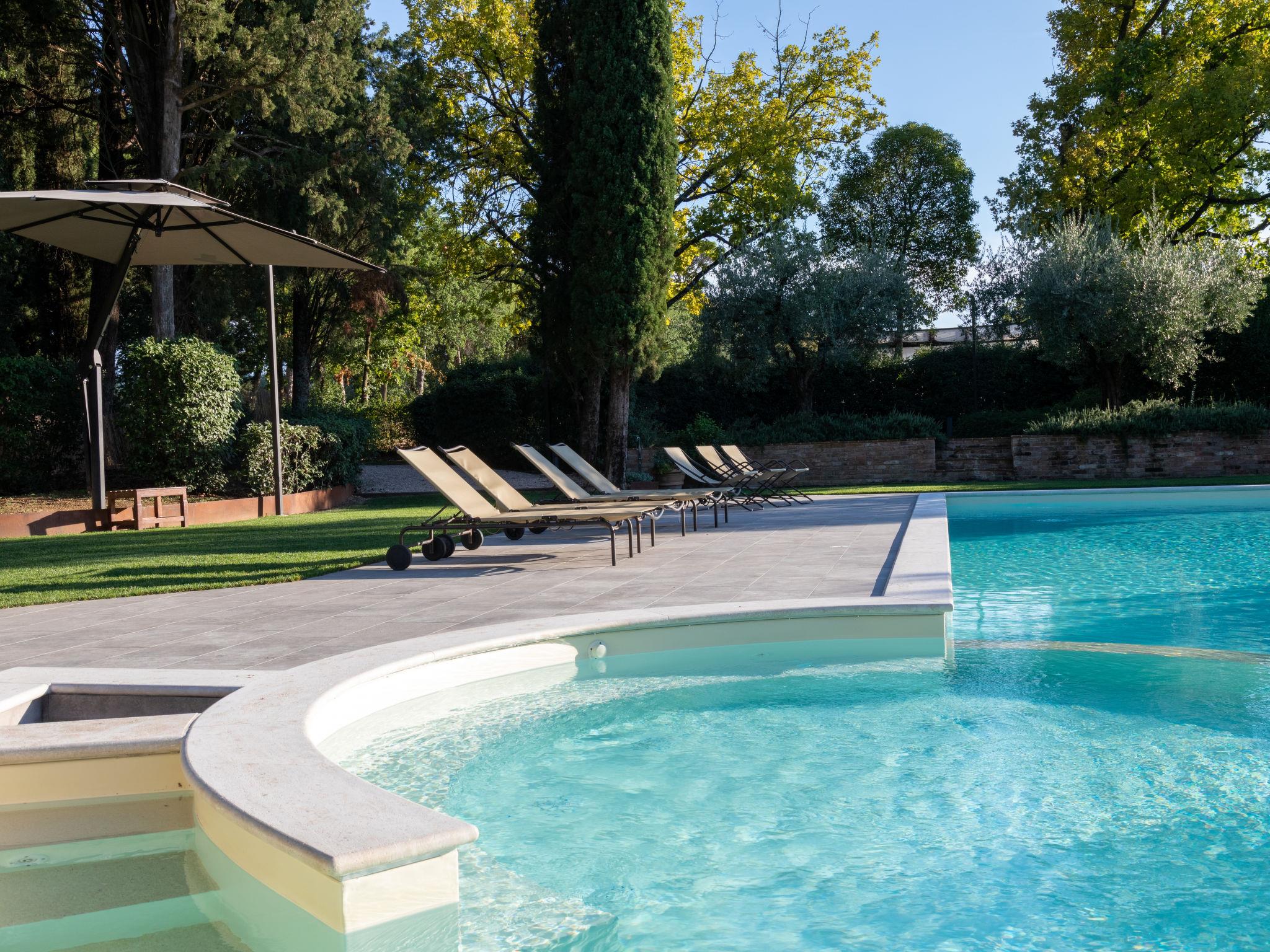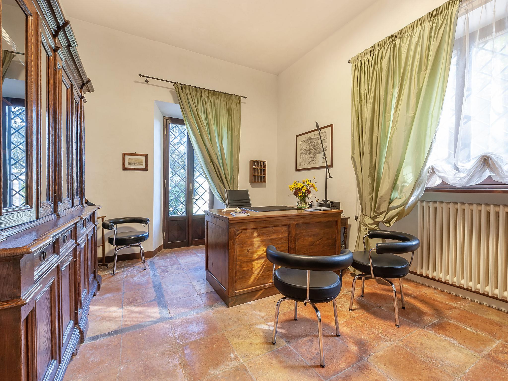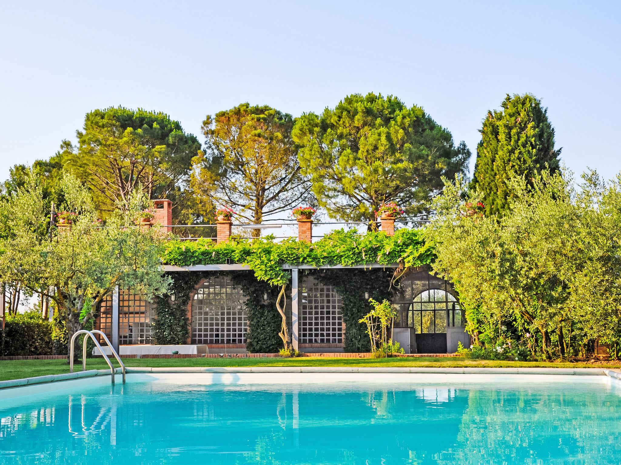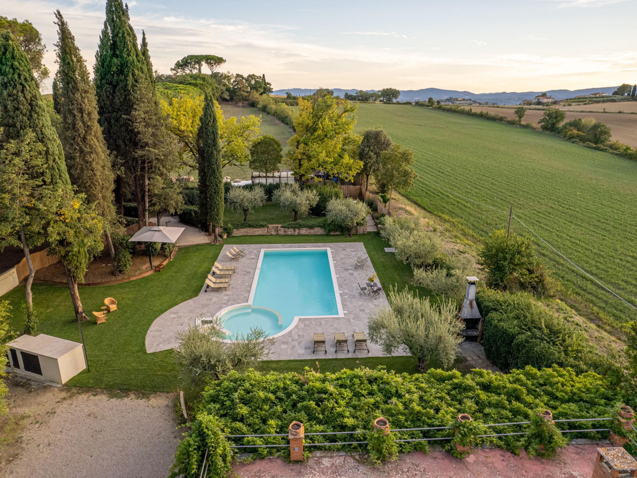 Exclusive 18th century villa immersed in a wonderful park luxurious villa "Angeli", renovated, surrounded by trees. In the hamlet Sant'Enea 10 km from the centre of Perugia, in a quiet, sunny position, 24 km from the lake, in the countryside. Private: property 17 ha (fenced), park, beautiful garden to relax, swimming pool with privacy (6 x 14 m, depth 120 - 140 cm, seasonal availability: 01.May. - 30.Sep.). Unconventional pool shape. Shower/WC in the pool area, outdoor shower, pergola, garden furniture, barbecue house. In the house: WiFi, solarium, washing machine, tumble dryer, heating available only from 15.Oct. - 15.Apr. (extra). Linen change weekly (suppl. charge extra). Room cleaning (extra). Cook on request. Breakfast on request. Pre-arrival grocery service. Motor access (500 m via unmade road). Parking. Grocery 1 km, supermarket 8 km, restaurant 1 km, bathing lake "Trasimeno" 24 km. Golf course (18 hole) 13 km, tennis 10 km, riding stable 10 km. Nearby attractions: Panicale 27 km, Bevagna 30 km, Todi 33 km, Passignano sul Trasimeno 35 km, Assisi 35 km, Città Della Pieve 37 km. Groups of teenagers on request only. Suitable for events. The Villa has its own chapel, covered barbecue area equipped with wood-burning brazier, pizza oven, gas hob, sink and refrigerator.