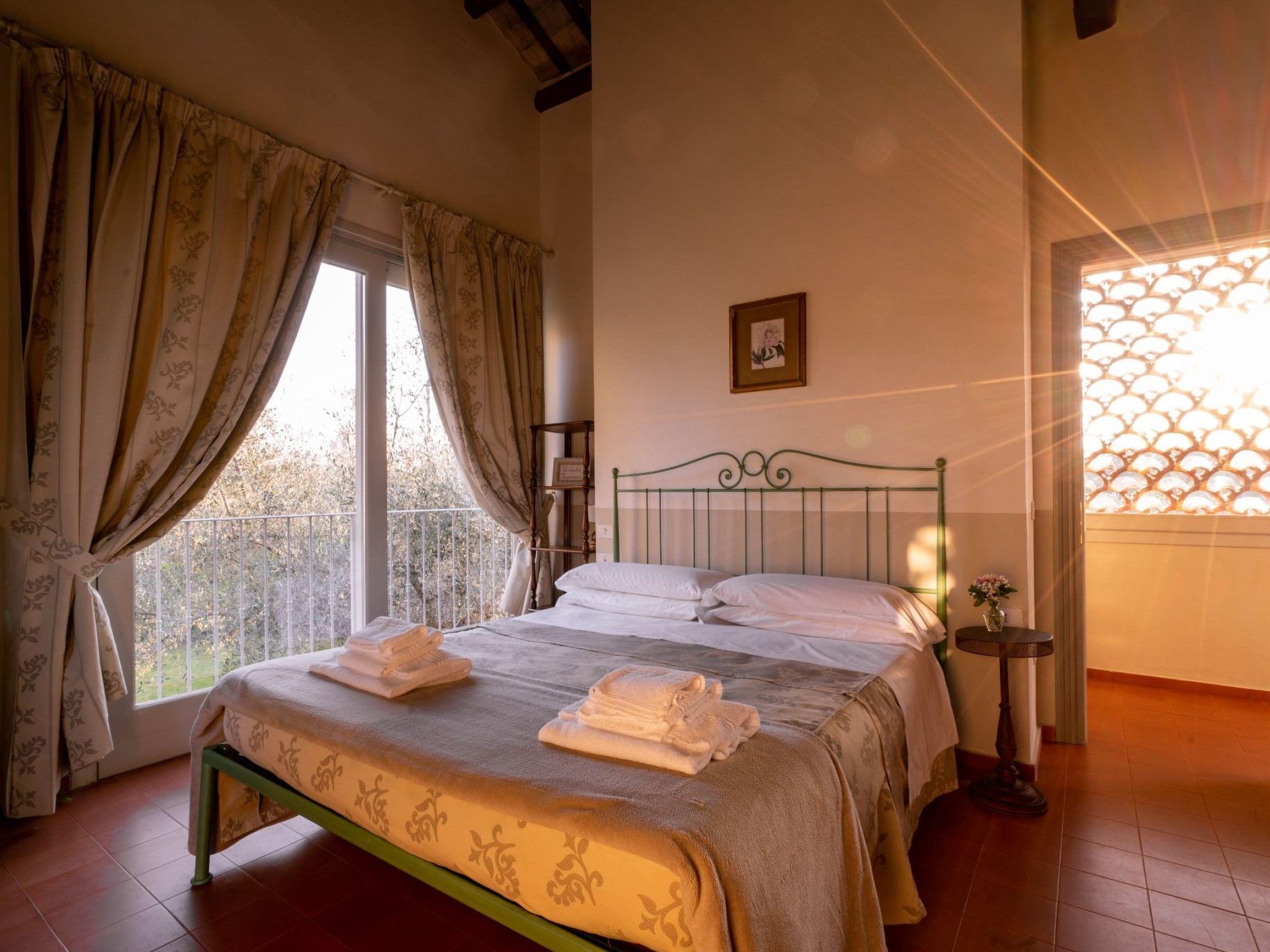 The flat is on the first floor of the farmhouse barn and has an independent entrance and panoramic terrace. The living area is bright and welcoming, with a full kitchen, wooden dining table, corner cabinet and a burgundy red sofa. An antique crystal chandelier, suspended from the high ceiling, illuminates the room while the many windows offer views of the garden, olive grove and surrounding countryside.