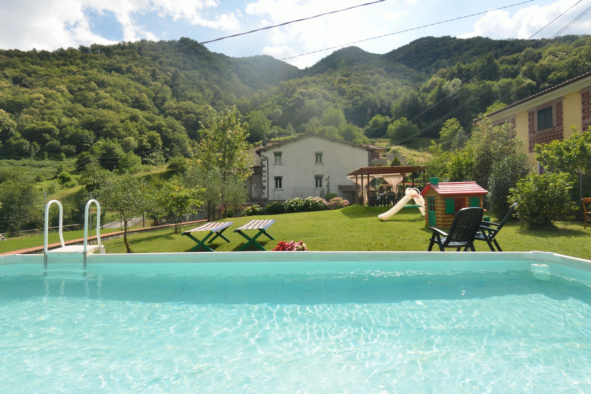 Denne charmerende villa i stueetagen har et stort køkken med komfur, ovn, køleskab med fryser og en dekorativ pejs; en hyggelig stue/spisestue med satellit-tv; og et funktionelt vaskerum. Ovenpå er der tre komfortable soveværelser (to dobbeltværelser, en tvilling) og et moderne badeværelse. Udenfor kan du nyde en overdækket privat terrasse og fuldt indhegnet have. Hjemmet er kæledyrsvenligt og udstyret med varme, aircondition, en barneseng, gratis Wi-Fi, parkering på stedet og en privat pool (6×3 m, åben juni-september). Villaen blander rustik karakter med moderne bekvemmeligheder: nyd al fresco-måltider på den møblerede terrasse, slap af i poolen, slap af ved pejsen og nyd den sikre have. Dette er et perfekt valg for familier, der rejser med kæledyr, og tilbyder privatliv og gennemtænkte faciliteter overalt. Beliggende kun 1,3 km fra lokale restauranter og kun 27 km fra den historiske by Lucca, er villaen omgivet af Serchio-dalen og de apuanske alper. Gæster kan besøge kastanjemuseet i det nærliggende Colognora for at udforske det traditionelle liv på landet og kastanjekulturen.