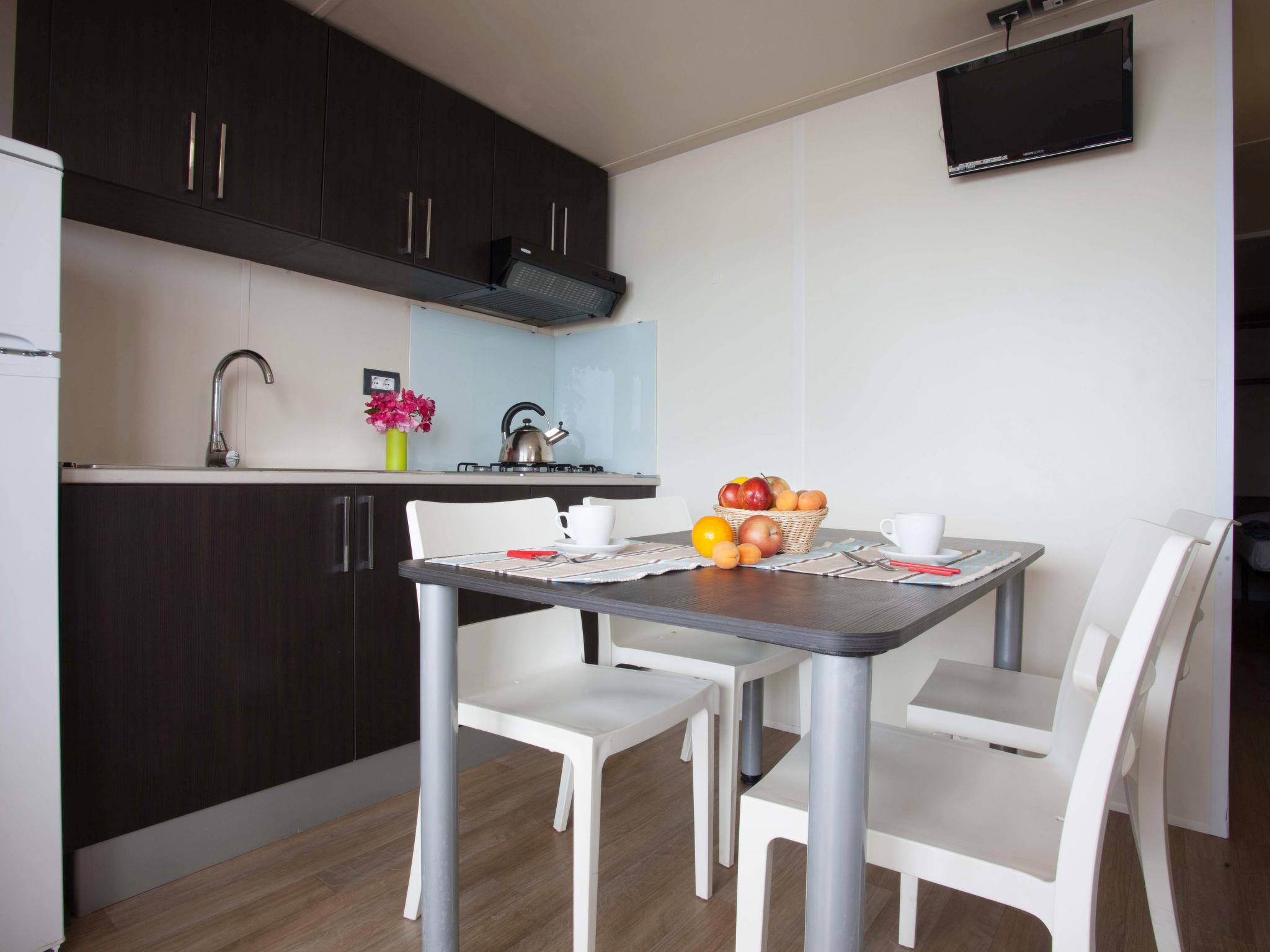 "Baia Relax New Plus", 3-room mobile home 25 m2. Modern furnishings: living/dining room with dining table and satellite TV. 1 room with 1 french bed (140 cm). 1 room with 2 beds (70 cm), 1 x 1 bunk beds (65 cm, length 180 cm). Kitchenette (4 gas rings, freezer). Shower/WC. Air-conditioning, forced-air heating (extra). Terrace roofed. Terrace furniture. Parking (1 car). Please note: non-smokers only. Maximum 2 small pets/ dogs allowed. Bed layout is flexible. There are more sleeping options available than the maximum number of people allowed which may, however, not be exceeded. IT071038B100103452