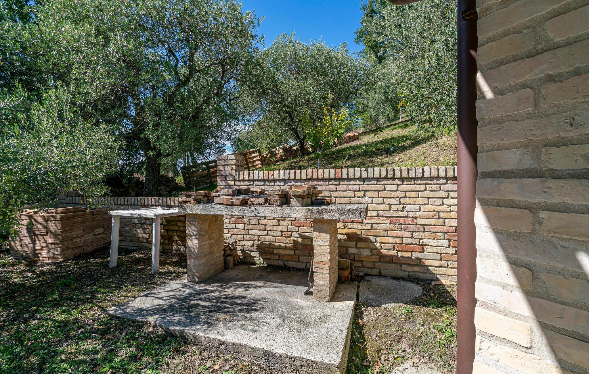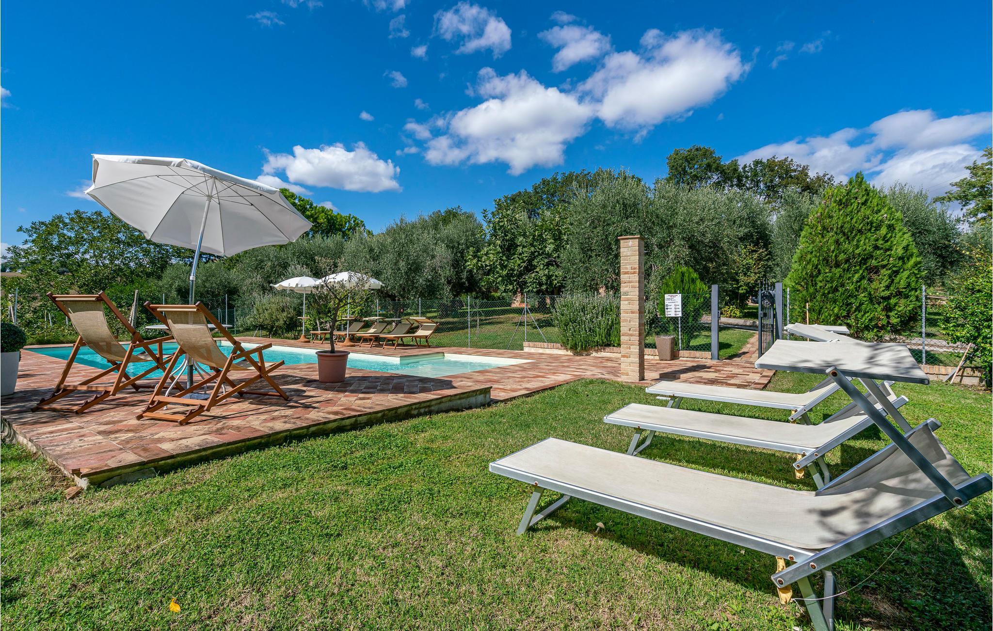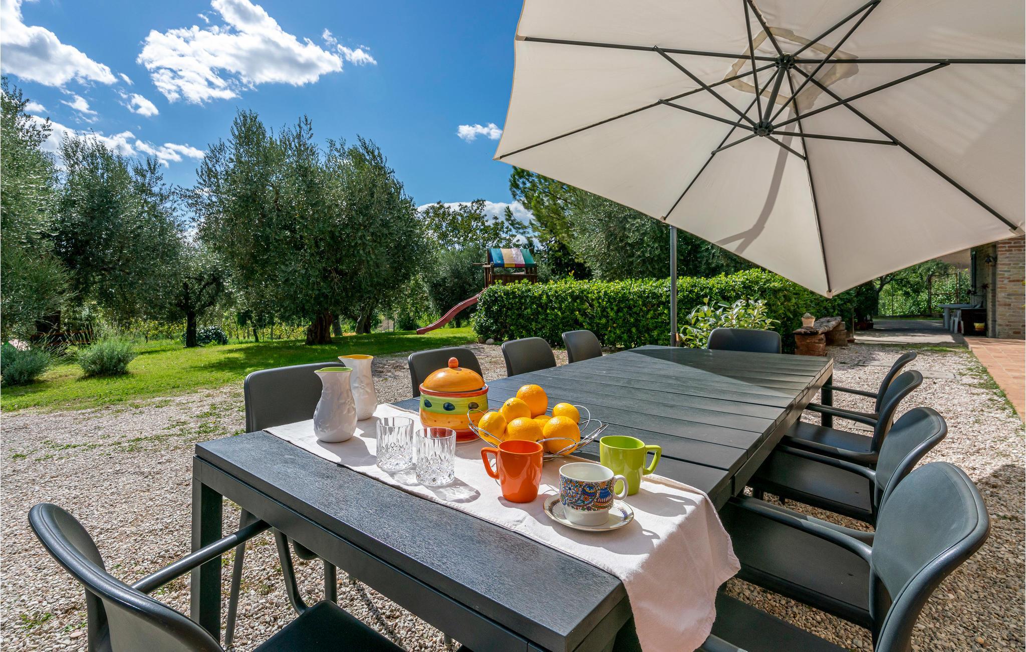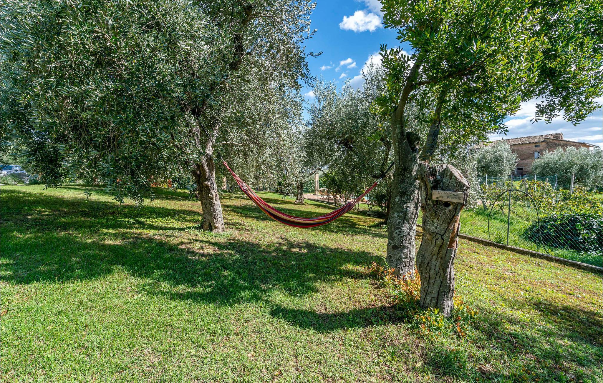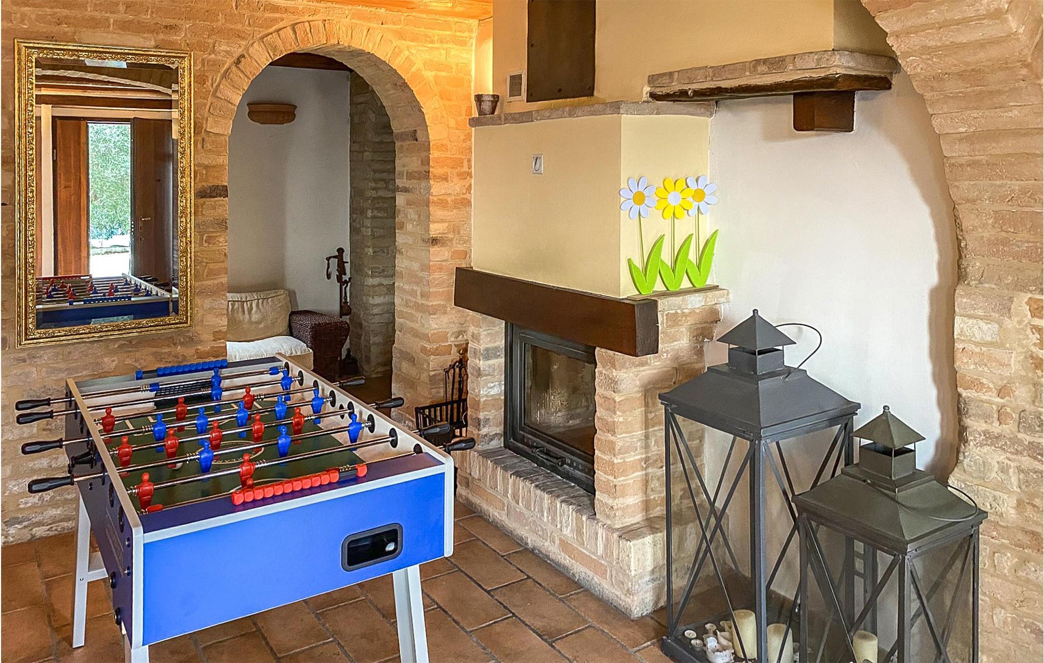 Udendørsområdet byder på en velplejet have, en privat pool og hyggelige siddeområder, der indbyder til afslapning. Nyd jeres måltider under åben himmel, slap af på en solseng, eller find ro i hængekøjerne under de århundredegamle oliventræer. Til underholdning er der et bordfodboldhjørne og masser af plads til børnene at lege.