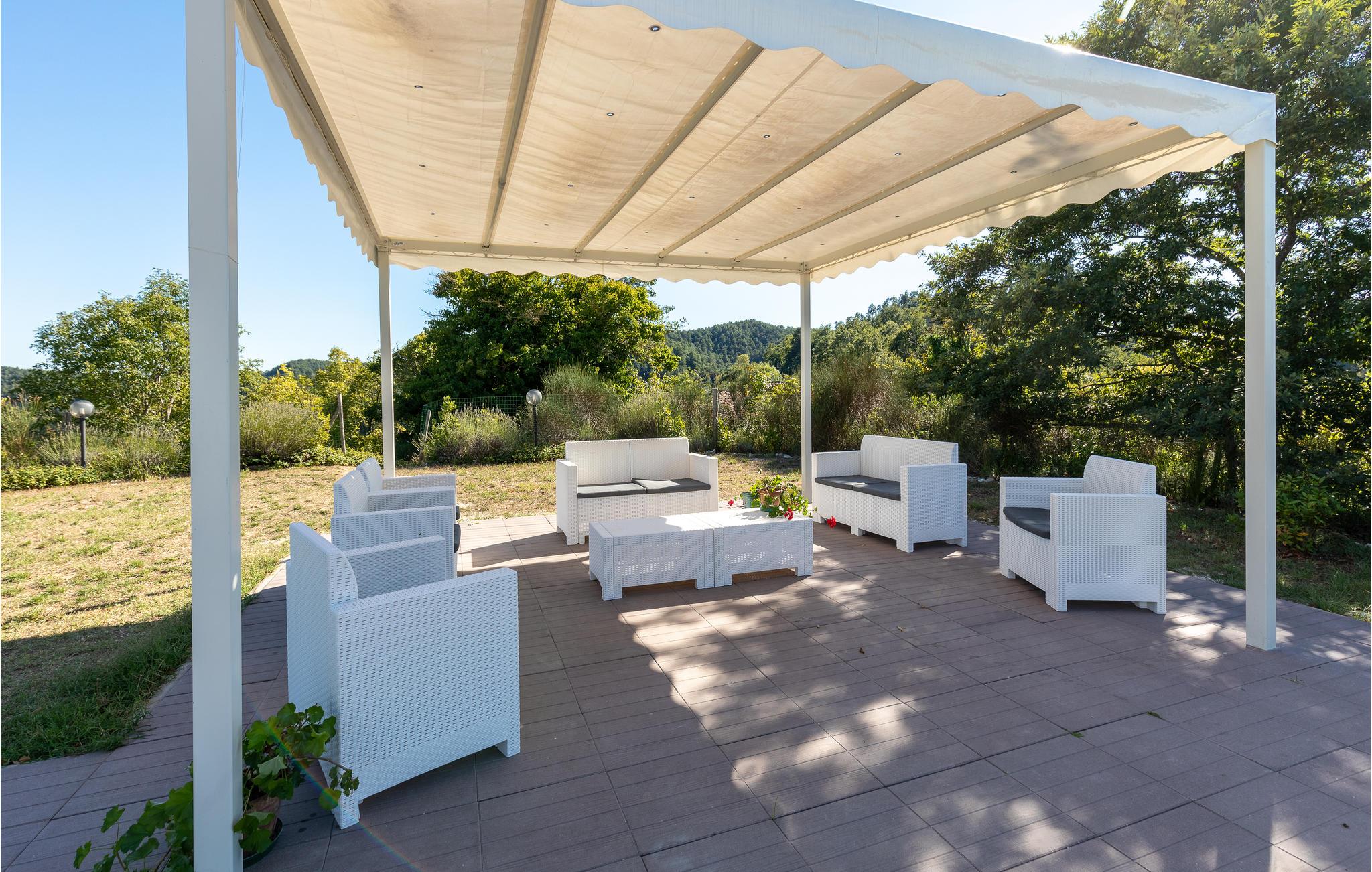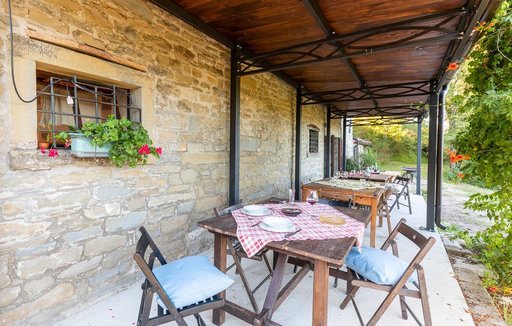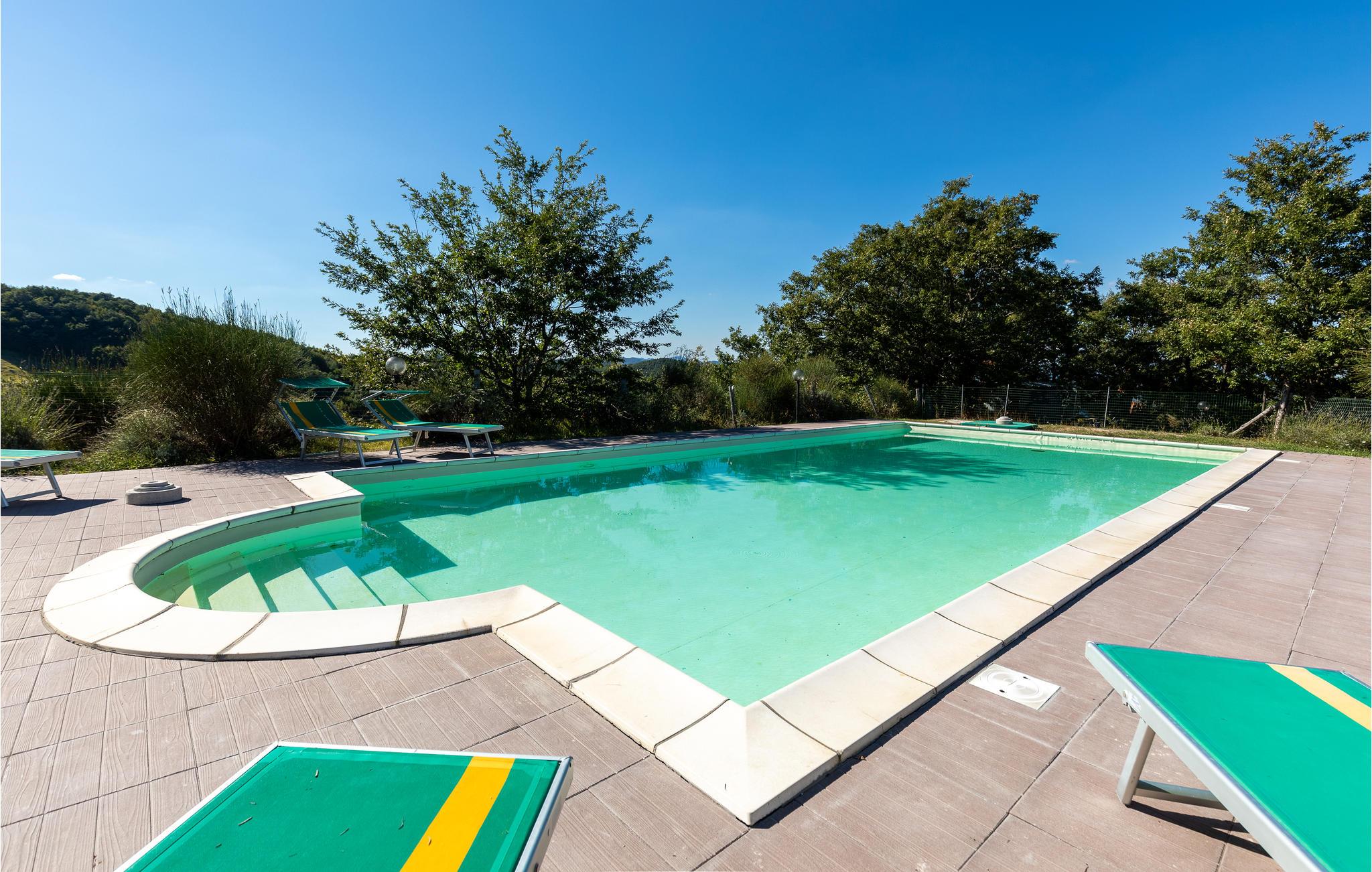 Dette komfortable landhus er ideelt for grupper, der gerne vil tilbringe ferien midt i naturen. Ca. 5 km fra byen Apecchio ligger det i rolige omgivelser på en bakke med smuk udsigt over dalen. Feriehuset består af 5 separate boliger, der kan lejes samlet. I den store spisestue med åben pejs, kan gæsterne spise sammen, ligesom i haven hvor der er stor siddeplads med udsigt over dalen. Boligerne er møbleret i smagfuld landlig stil. Poolområdet ligger 30 meter væk, forhøjet, med en sensationel udsigt til Monte Nerone (1.525 m). Både hus og poolområdet er indrettet med henblik på handicappede men kontakt os og hør nærmere om hvordan. Der kan bestilles kok fra en nærliggende restaurant - på forespørgsel og mod betaling. Feriehuser er et godt udgangspunkt for vandreture og ture på mountainbikes i de omkringliggende bjerge, men også til udflugter i de meget seværdige umbriske små byer. Det kan også anbefales at tage en tur til vandet ved Adriaterhavskysten ved Pesaro/Fano. Ikke-asfalteret tilkørsel til huset (1 km).