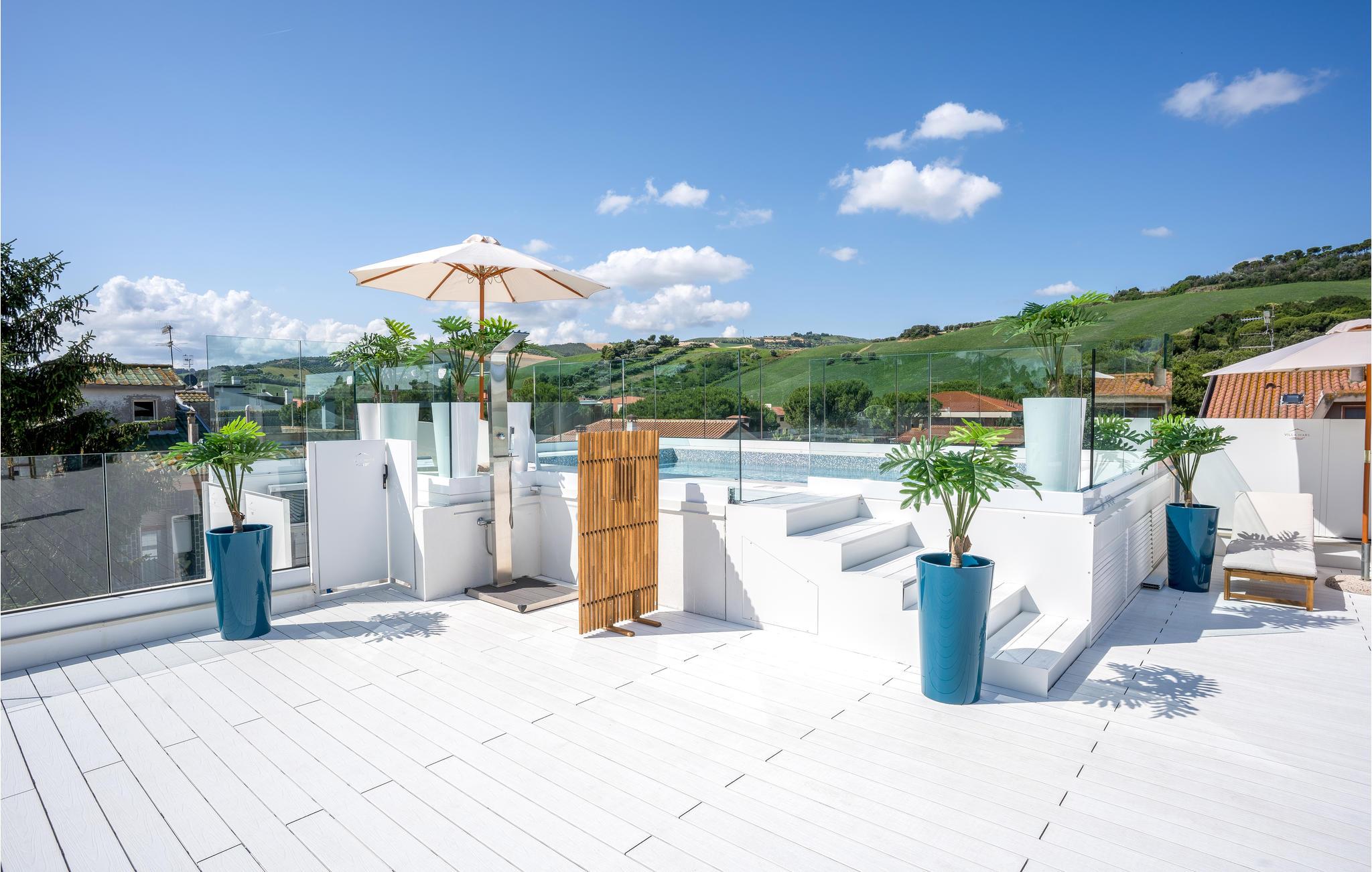 Tag til Pineto og nyd en drømmeferie i denne attraktive lejlighed. Designet i maritime farver og udvalgte materialer danner boligen en vidunderlig ramme for afslappende dage i sydens sol. Hyg jer med fælles madlavning over et glas vin og spis lækkerierne på balkonen. Ud over lejligheden har I også adgang til den luksuriøse tagterrasse, som giver lejligheden et ekstra nøk opad. Læn jer tilbage i loungemøblerne og nyd feriestemningen og den smukke udsigt over omgivelserne og havet. Når I har brug for afkøling, kan I tage en dukkert i poolen. I kan også gå til den nærliggende sandstrand, hvor I kan lytte til lyden af bølgerne fra jeres liggestol. En strandservice med en parasol, en liggestol og en liggestol er tilgængelig pr. lejlighed et par hundrede meter fra boligen.