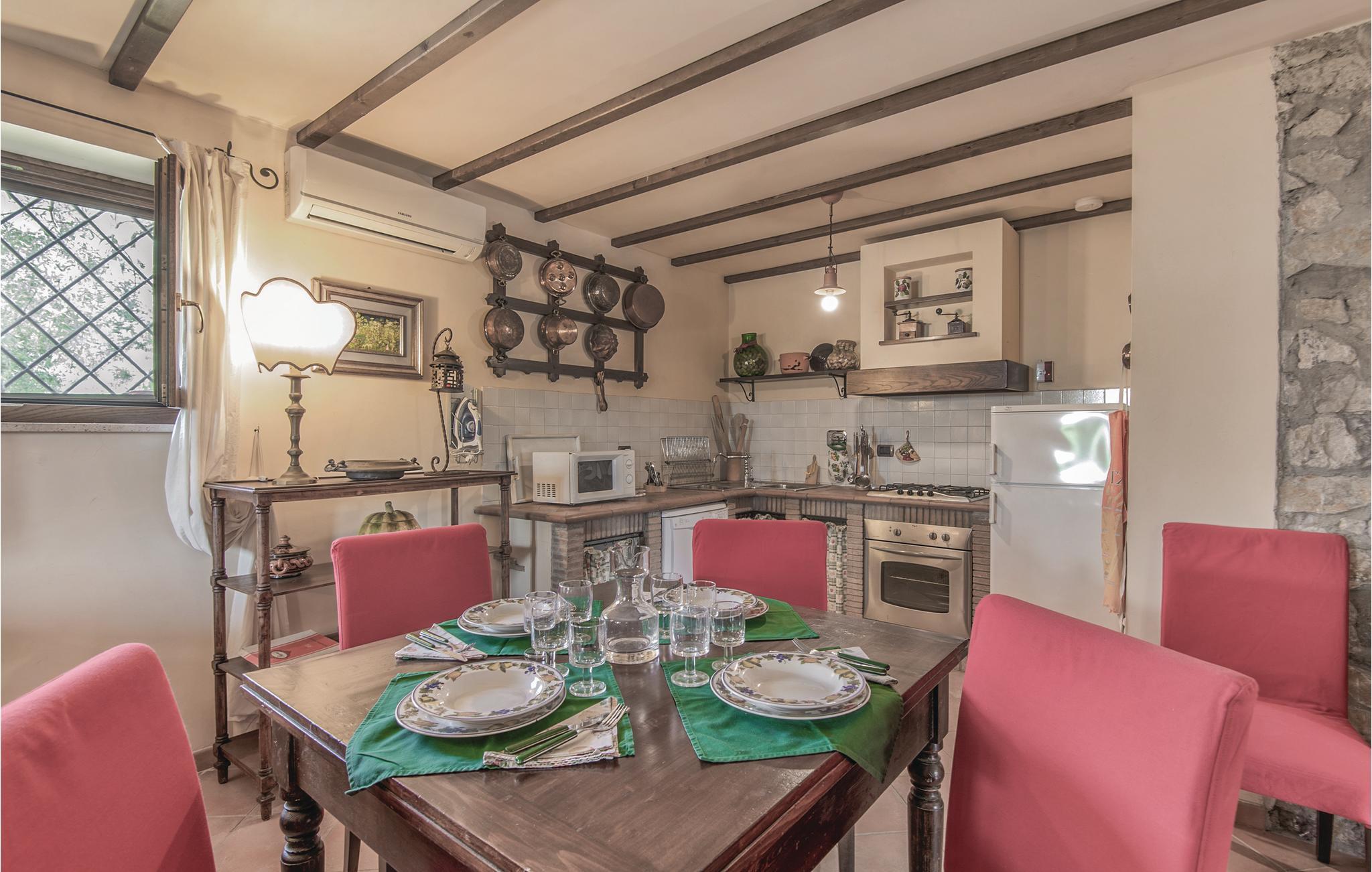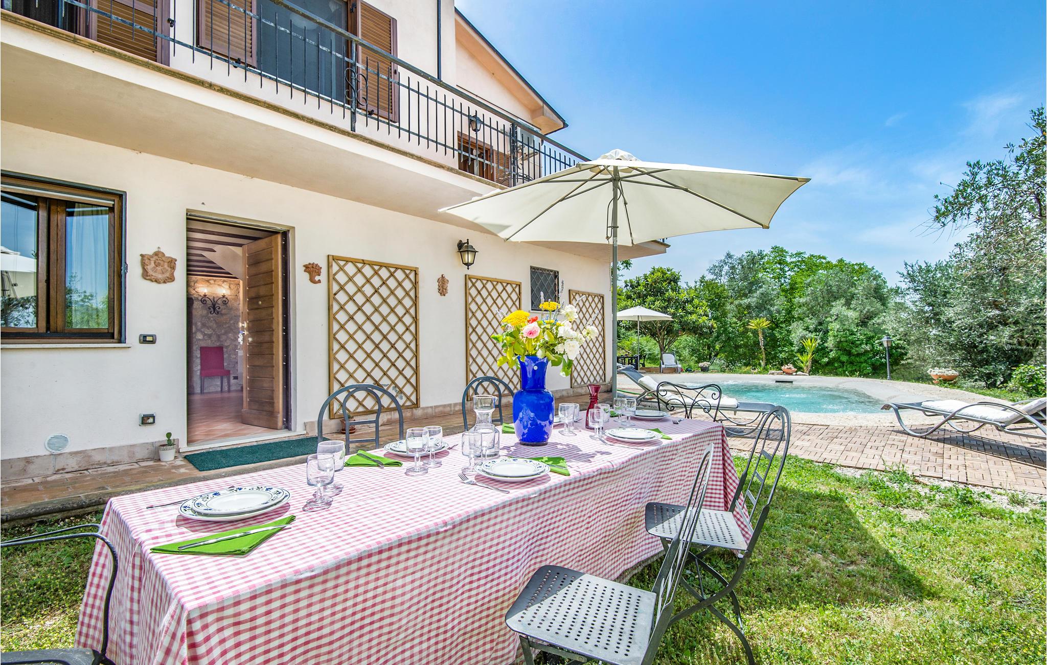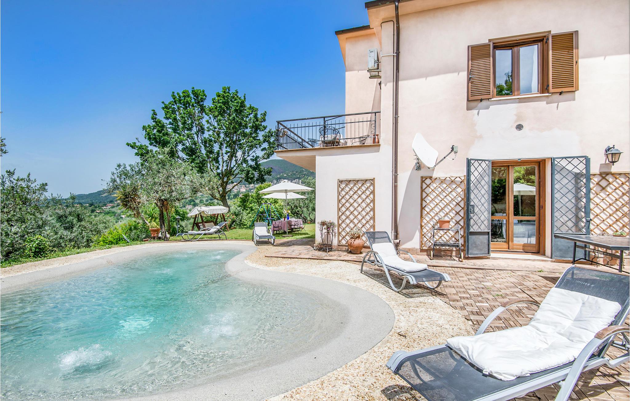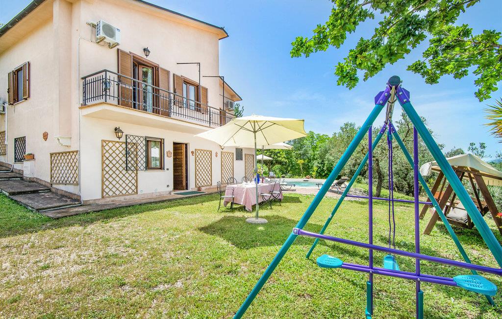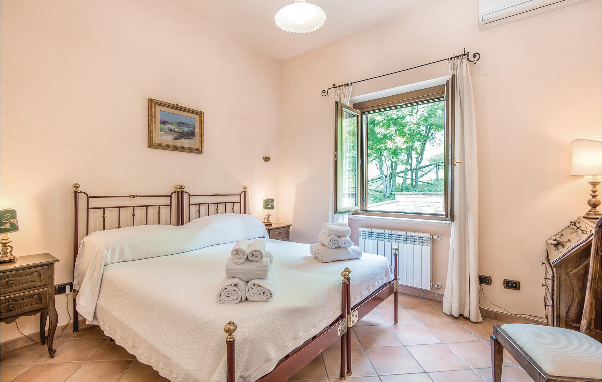 Dette pæne feriehus i det dejlige landskab omkring Rieti, 1,3 km fra Poggio Mirteto og 2,5 km fra Poggio Catino, ligger panoramisk på grunden af et landbrug. Ud over frugttræer, palmetræer og hasselnødder dyrker ejerne også en uforlignelig olivenolie, olio extra vergine d’oliva. I når Rom på kun en times kørsel eller nemt med toget, da en lille station ligger kun ti minutters kørsel herfra. Her er I på rette sted til at nå det nordlige Lazio, den antikke region Tuscia med Viterbo (71 km) eller det nære Umbrien (Orvieto 87 km, Narni 50 km). Huset ligger på godsets grund, men med egen indkørsel og privat indgang, der lover absolut privatsfære. En have med oliven- og frugttræer omgiver huset. Til rådighed for jer står også en pool, hvis vand er lyserødt af himalayasalt, og som har boblefunktion over det hele. Dertil råder I over en grill og havemøbler på en patio med udsigt over bakkerne og poolen.