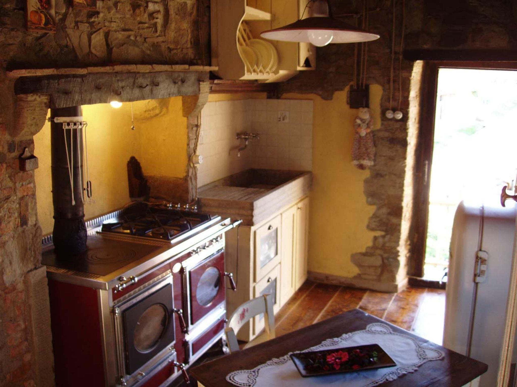 The accommodation consists of a single room of about 20 square meters on the upper floor of a former mule shed; it consists of a kitchen with bedroom and bathroom. The furnishings are simple and well-kept in typical Tuscan style. The kitchen consists of a wood stove and 4-burner gas stove, electric oven, coffee maker, necessary utensils and dishes. The bedroom has a French double bed in wrought iron; the bathroom consists of a large shower, toilet, sink and hairdryer. Heating is present throughout and can be with a wood stove or LPG, flat-screen TV. Laundry room available for a fee (detergents included in the price).