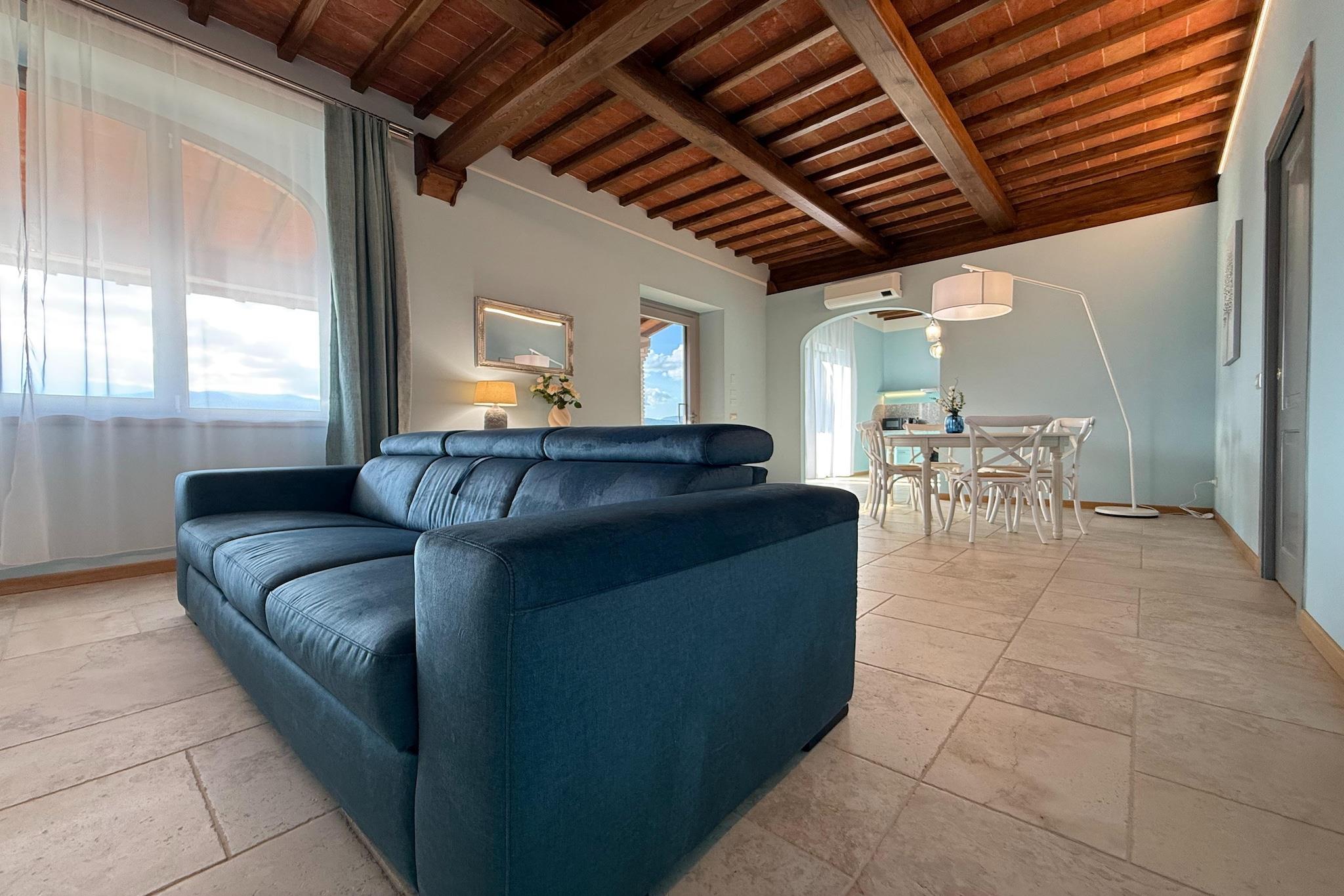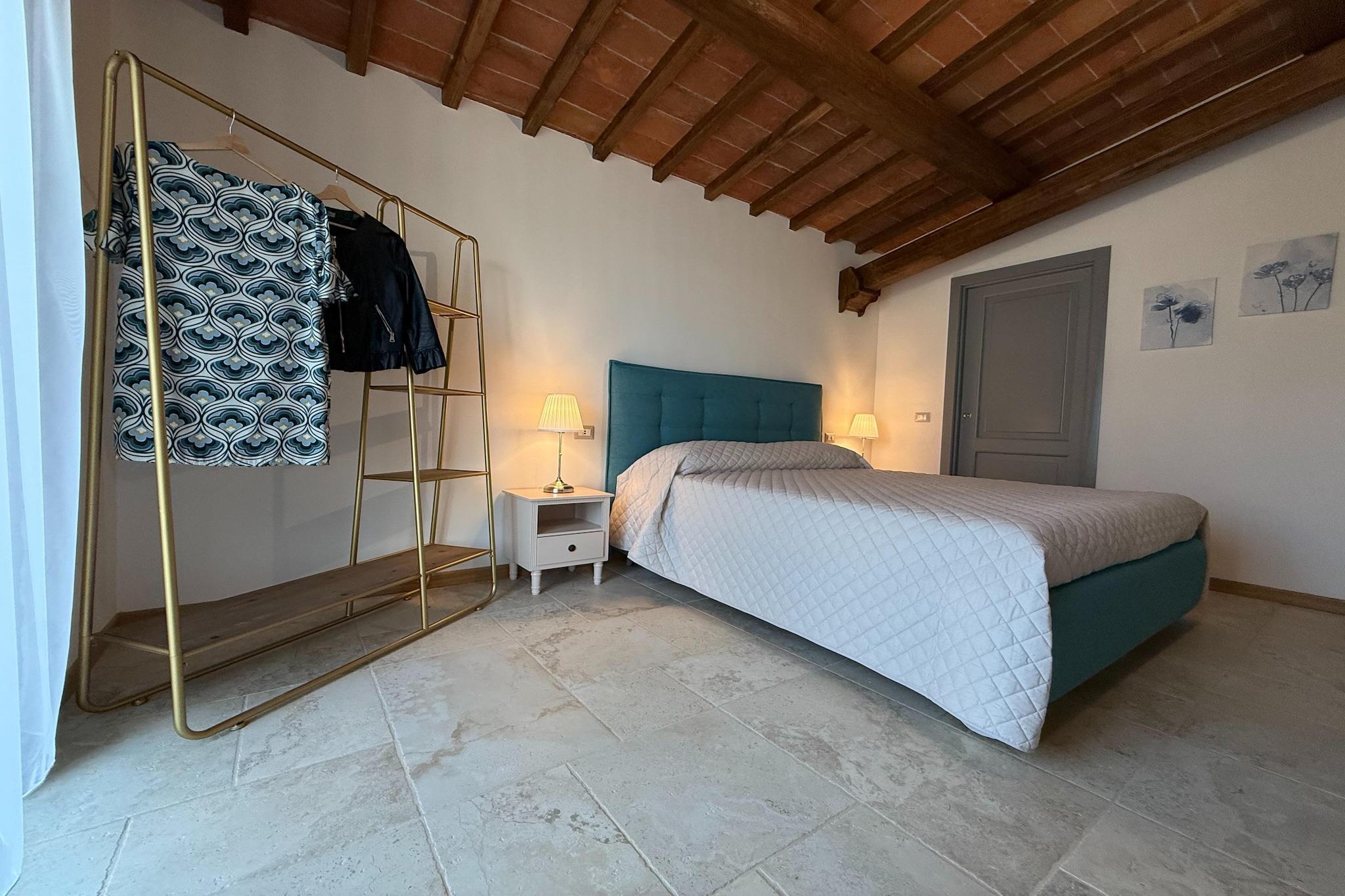 Denne raffinerede lejlighed, helt ny og møbleret med kvalitetsmaterialer, er det ideelle valg til en ferie i det mest autentiske og stemningsfulde Toscana. Omgivet af grønne områder og en betagende udsigt tilbyder den gæsterne rummelige udendørsområder og en pragtfuld infinity-pool, der synes at falde i ét med landskabet nedenfor. Beliggende i Poppi kommune er det det perfekte udgangspunkt for at udforske de vidunderlige byer Arezzo og Firenze, Val di Chiana og de mange landsbyer rige på kunst, historie, natur, god mad og underholdning. Lejligheden ligger i stueetagen med en privat terrasse, hvor du kan spise udendørs, mens du nyder udsigten over poolen og den smukke dal. Hvert soveværelse har et privat badeværelse, og det ene har også et spabad, mens stuen tilbyder en komfortabel sovesofa med plads til to personer mere. Hele lejligheden har aircondition, hvilket sikrer maksimal komfort selv på de varmeste dage. Ejendommen tilbyder også privat, indhegnet parkering og store grønne områder, hvor du kan slappe af udendørs i alle årstider.