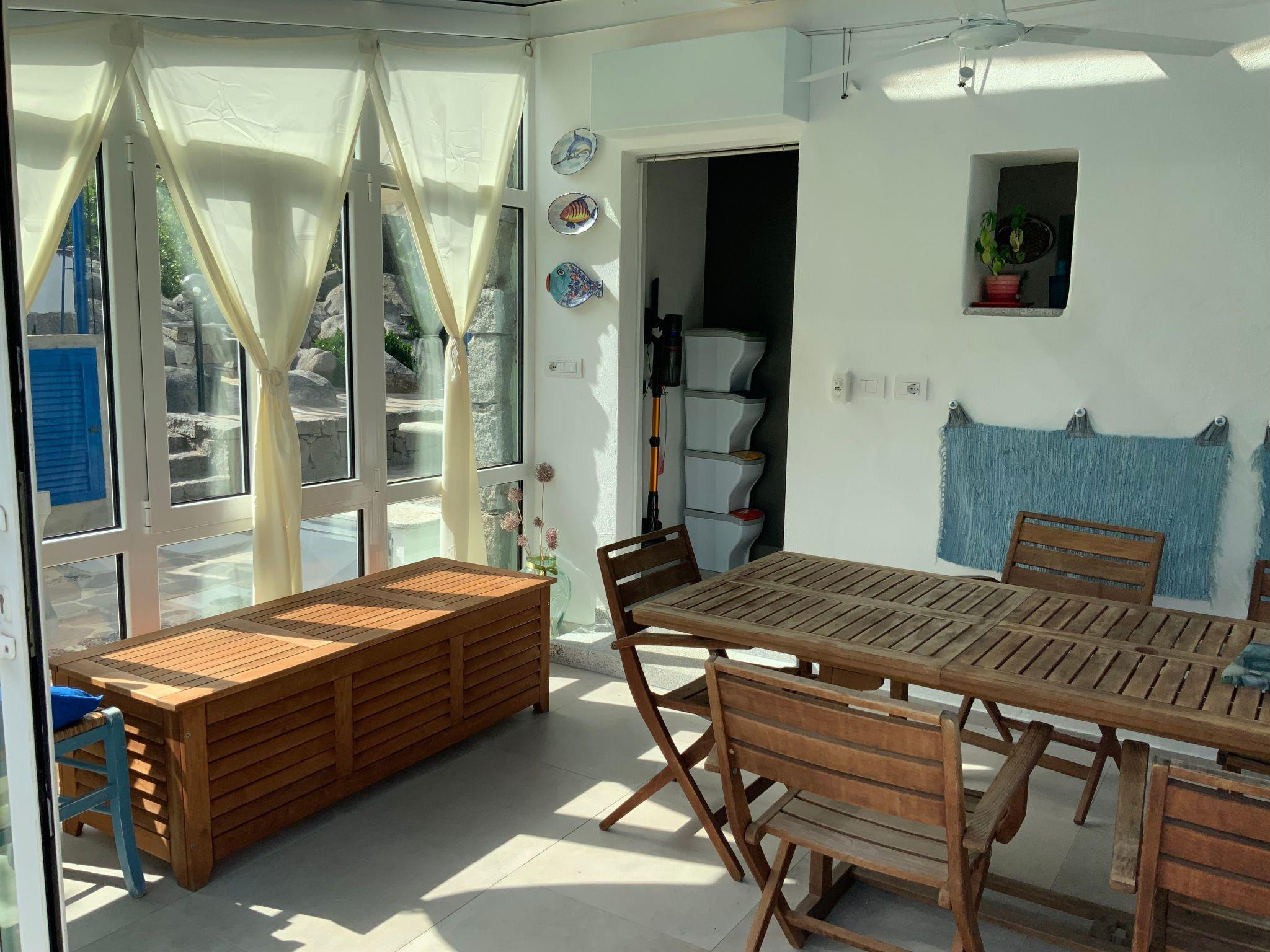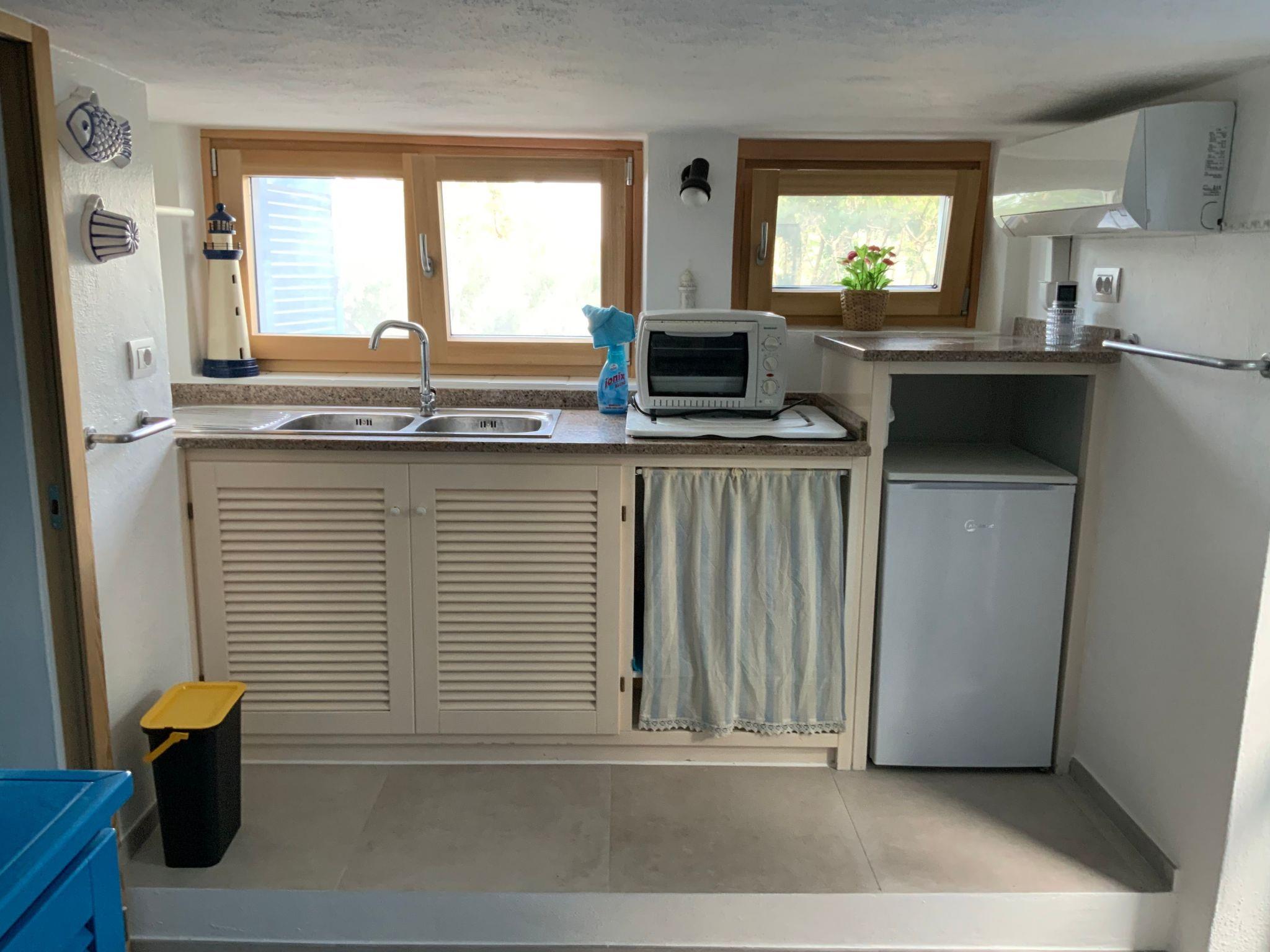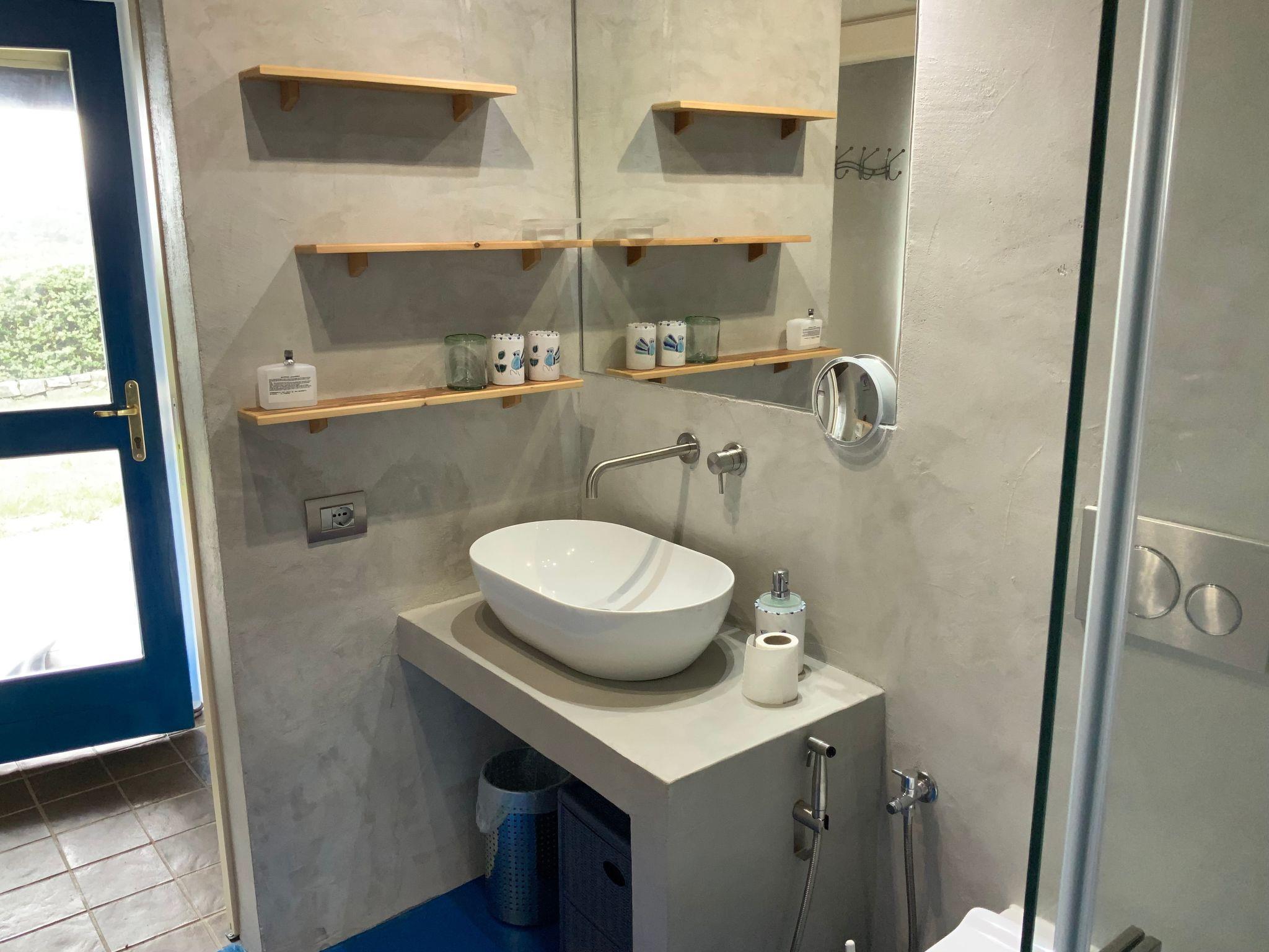 This holiday house enjoys a quiet location above a sea bay, offering guests an ideal setting for a relaxing holiday. The holiday accommodation comprises a ground floor and a light basement floor. These two floors provide guests with three bedrooms, three bathrooms, a kitchen and a living room. The living room can be cooled with fans on hot days. The three bedrooms, one of which is in the basement, each have a double bed. Two further beds are provided either by a bunk bed (suitable for children) or a pull-out double sofa bed in the living room. As there are three bathrooms, all with a shower and a toilet, it is no problem for eight people to be accommodated. The kitchen provides the standard kitchen appliances such as a stove, oven, fridge with freezer compartment, dishwasher, coffee machine and microwave. In the basement one can find a washing machine, as well as a second, small, full-equipped kitchen.