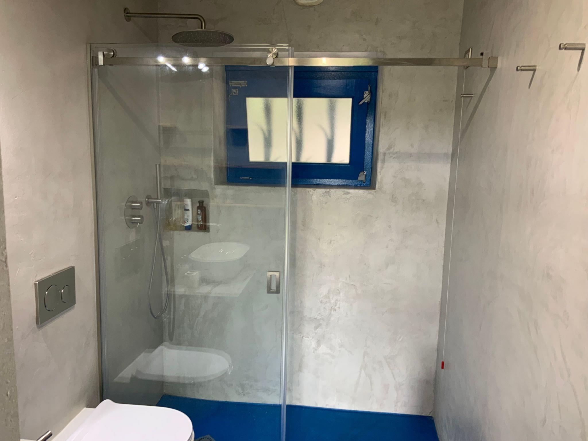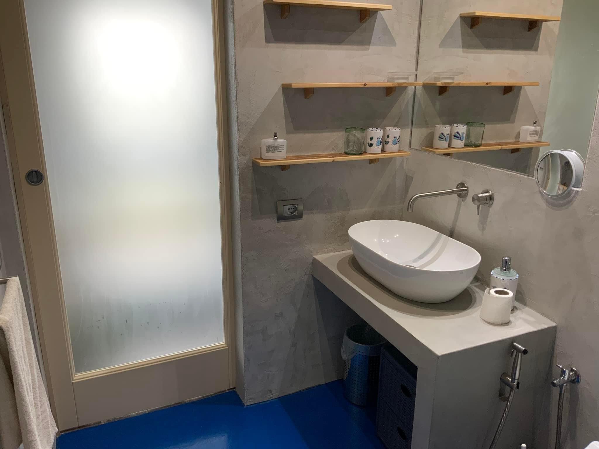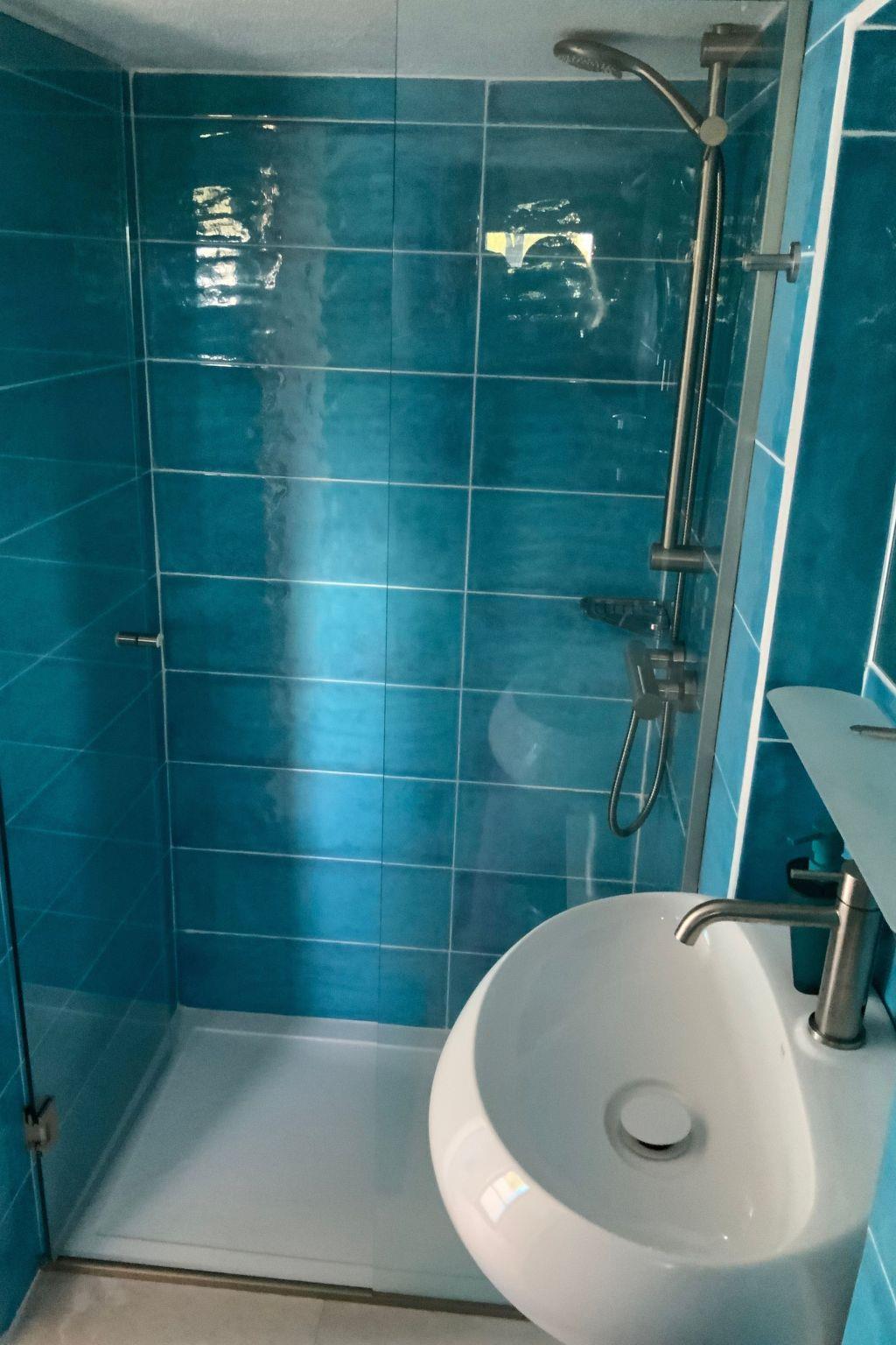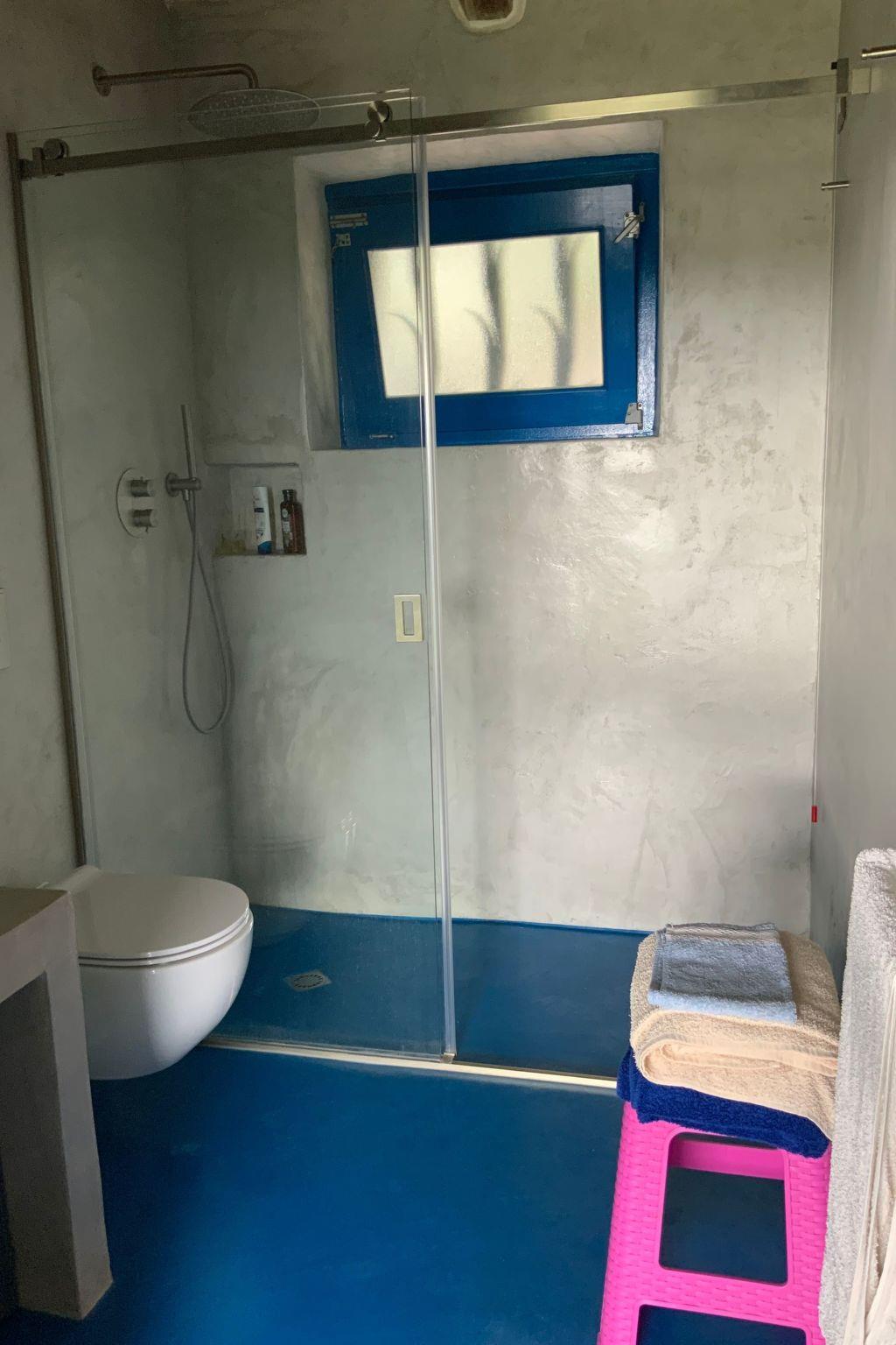 This holiday house enjoys a quiet location above a sea bay, offering guests an ideal setting for a relaxing holiday. The holiday accommodation comprises a ground floor and a light basement floor. These two floors provide guests with three bedrooms, three bathrooms, a kitchen and a living room. The living room can be cooled with fans on hot days. The three bedrooms, one of which is in the basement, each have a double bed. Two further beds are provided either by a bunk bed (suitable for children) or a pull-out double sofa bed in the living room. As there are three bathrooms, all with a shower and a toilet, it is no problem for eight people to be accommodated. The kitchen provides the standard kitchen appliances such as a stove, oven, fridge with freezer compartment, dishwasher, coffee machine and microwave. In the basement one can find a washing machine, as well as a second, small, full-equipped kitchen.
