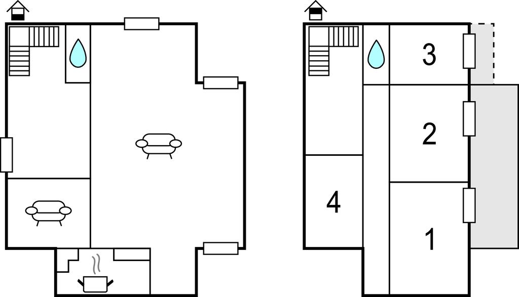 Huset fordeler sig over et stueplan og første sal og rummer en stor stue, køkken og badeværelse (håndvask, wc, bidet og bruseniche) i stueplan og tre soveværelser med dobbeltsenge, et soveværelse med to enkeltsenge og et badeværelse med håndvask, wc og bidet (men ikke bad) på første sal.