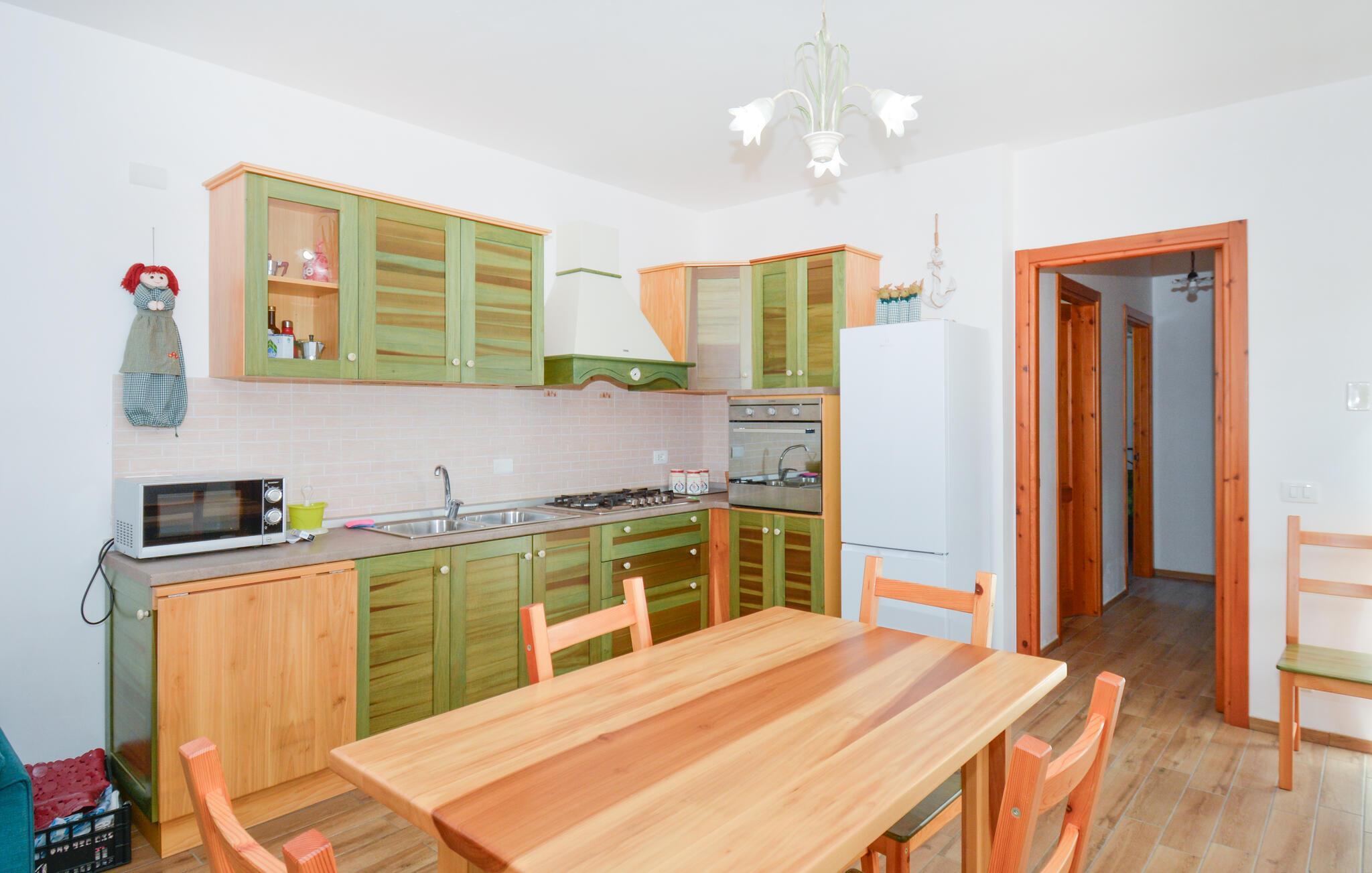 Træd ind i jeres midlertidige hjem og lad den venlige atmosfære sørge for, at alle sænker skuldrene. Det åbne, veludstyrede køkken med grønne træelementer og moderne apparater lægger op til at tilberede sicilianske specialiteter som Pasta alla Norma. Føl jer godt tilpas i det hyggelige sofahjørne og glæd jer til selskabelige spilleaftener eller stille timer med god læsning.