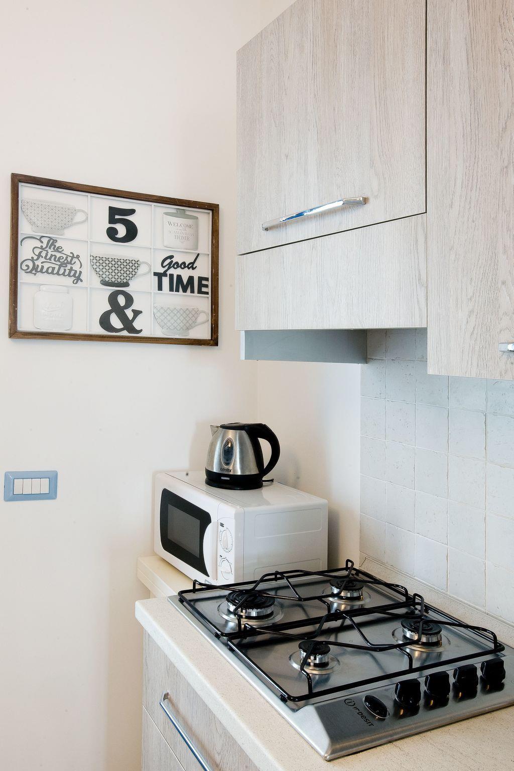 The kitchen, complete with refrigerator, dishwasher, microwave oven, kettle and coffee maker, is equipped with everything needed for cooking (crockery, dishes, cutlery, glasses, cups, etc.) and there is also a safe, phone, washing machine, ironing board and iron.