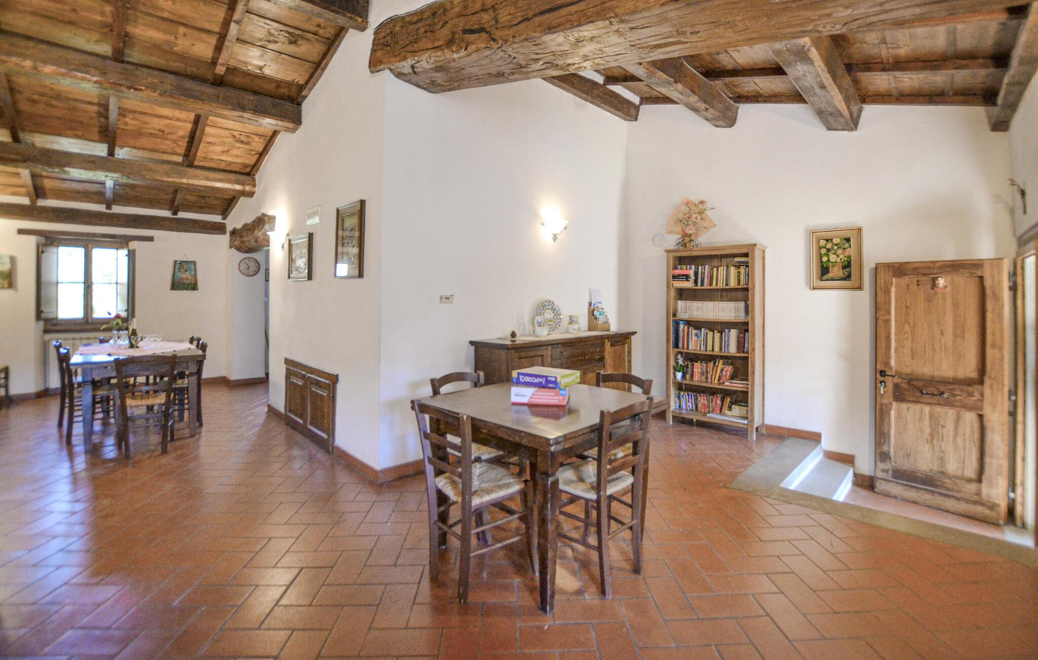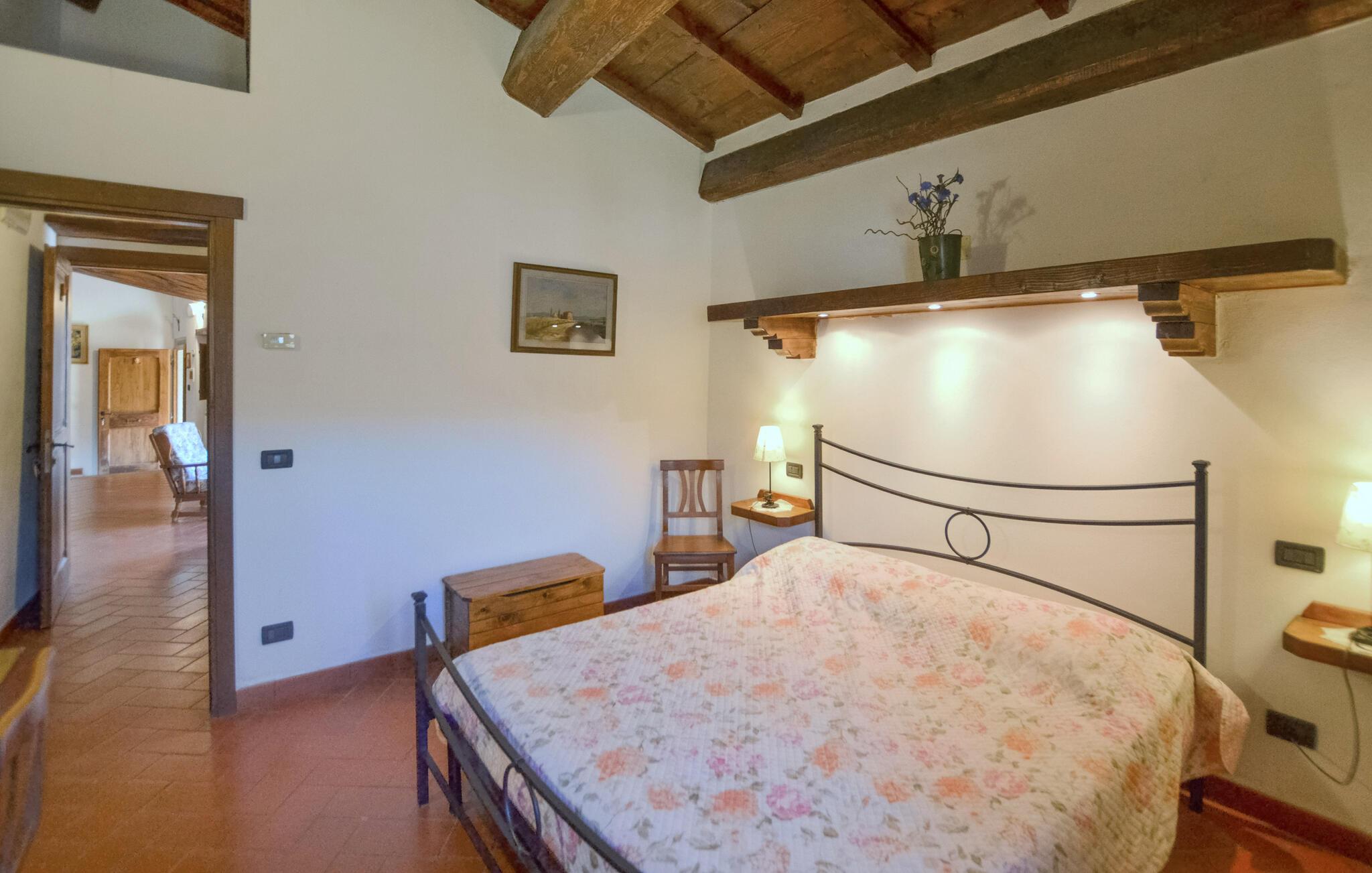 Lad batterierne op midt i det toscanske landskab, hvor dette charmerende feriehus med masser af plads, privatliv og autentisk landstedsstemning venter på jer. Nyd den varme atmosfære af de traditionelle materialer indeni. De fritlagte træbjælker, den store brændeovn og møblerne med et rustikt præg skaber en indbydende atmosfære. Slap af i stuen på de komfortable møbler eller tilbring omgængelige aftener med et glas vin.