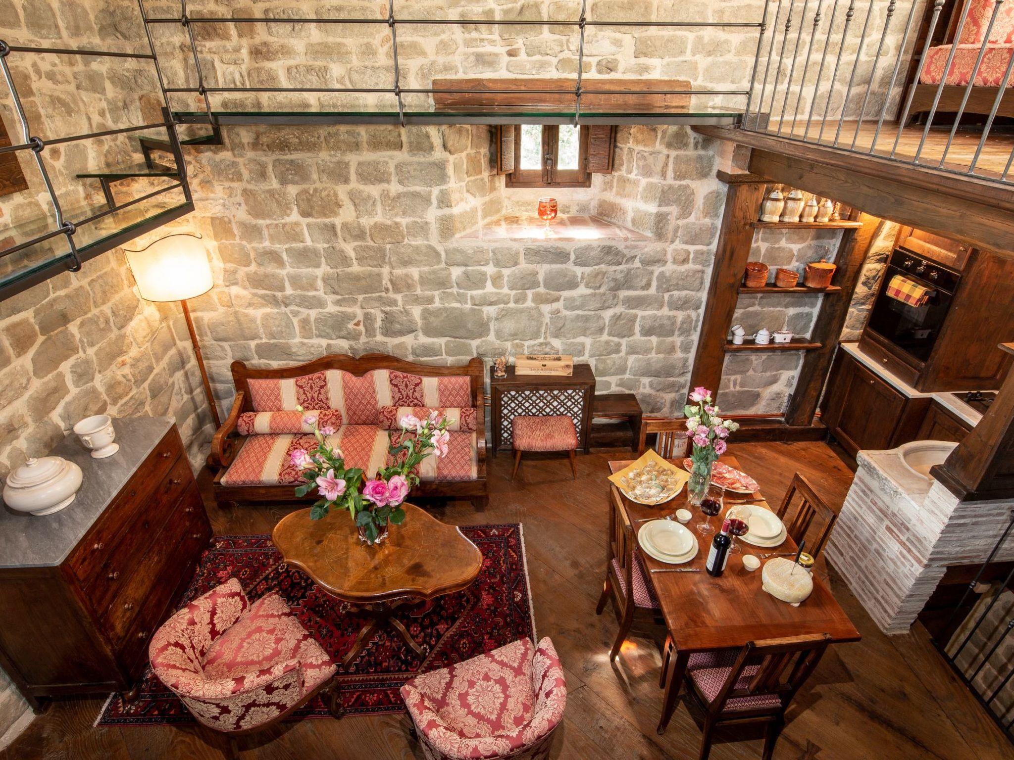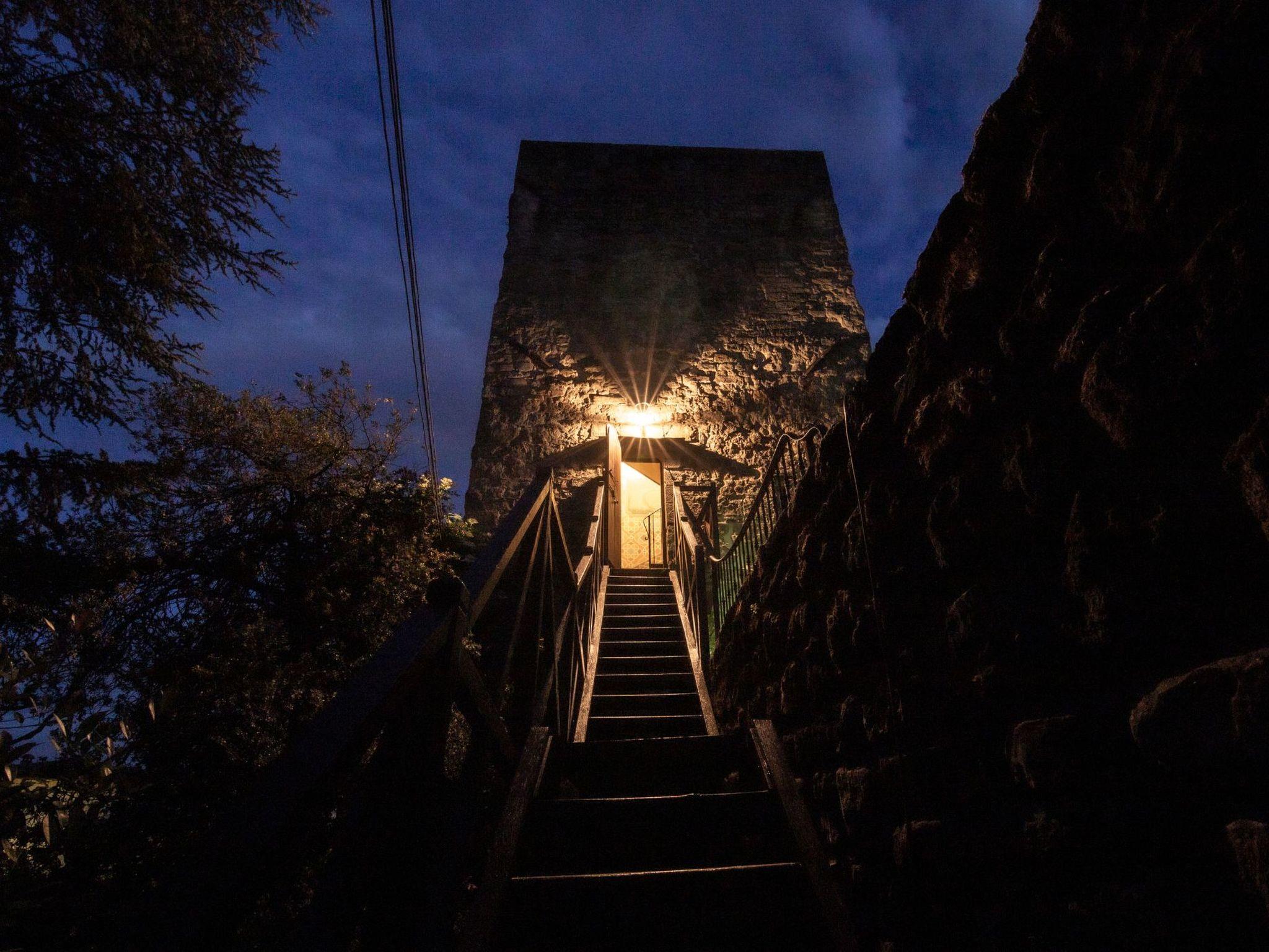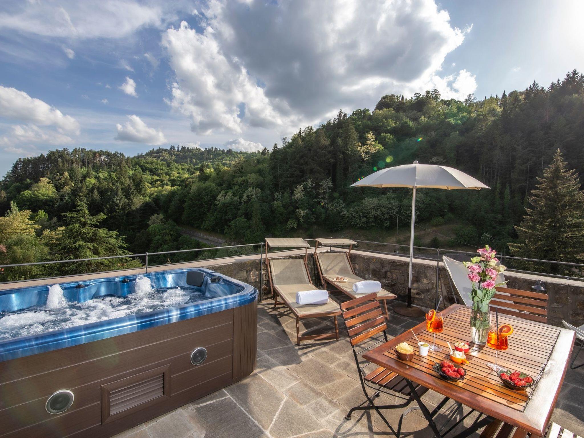 The jewel in the crown of the medieval tower is undoubtedly the enchanting panoramic terrace (35 sq m) with views over the Casentino Valley and the medieval castles of Poppi, Romena and Porciano. The terrace is equipped with a Jacuzzi, solarium, night lighting, roof garden, lava stone barbecue, drinking water, dining table and chairs. Enchanting romantic candlelight dinners under the stars can be organised here.