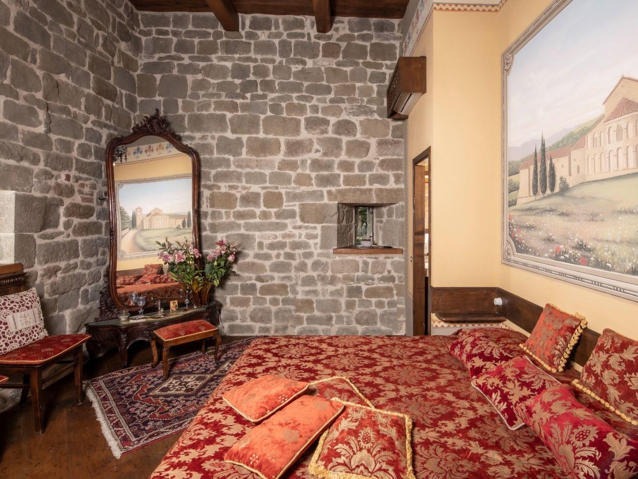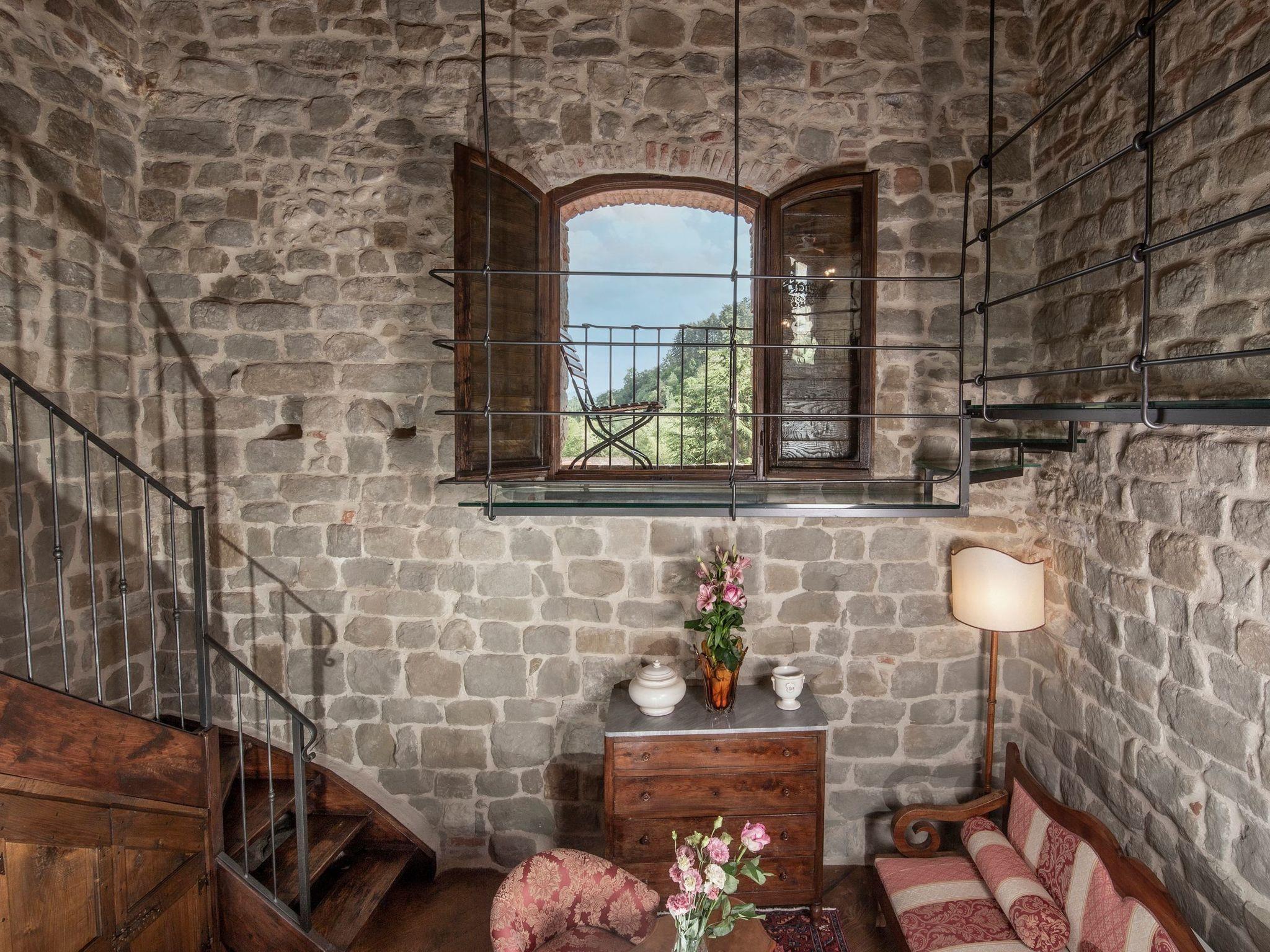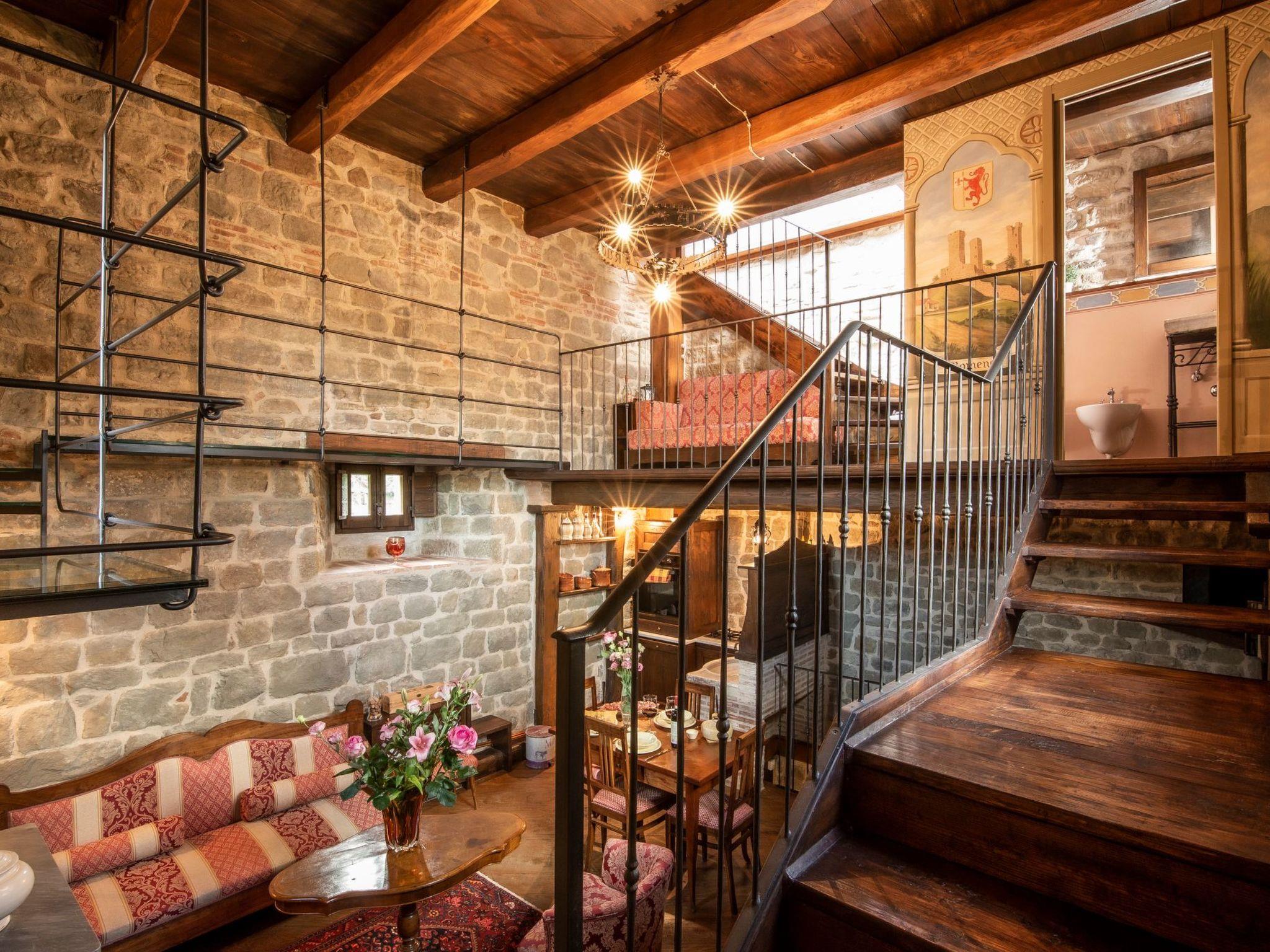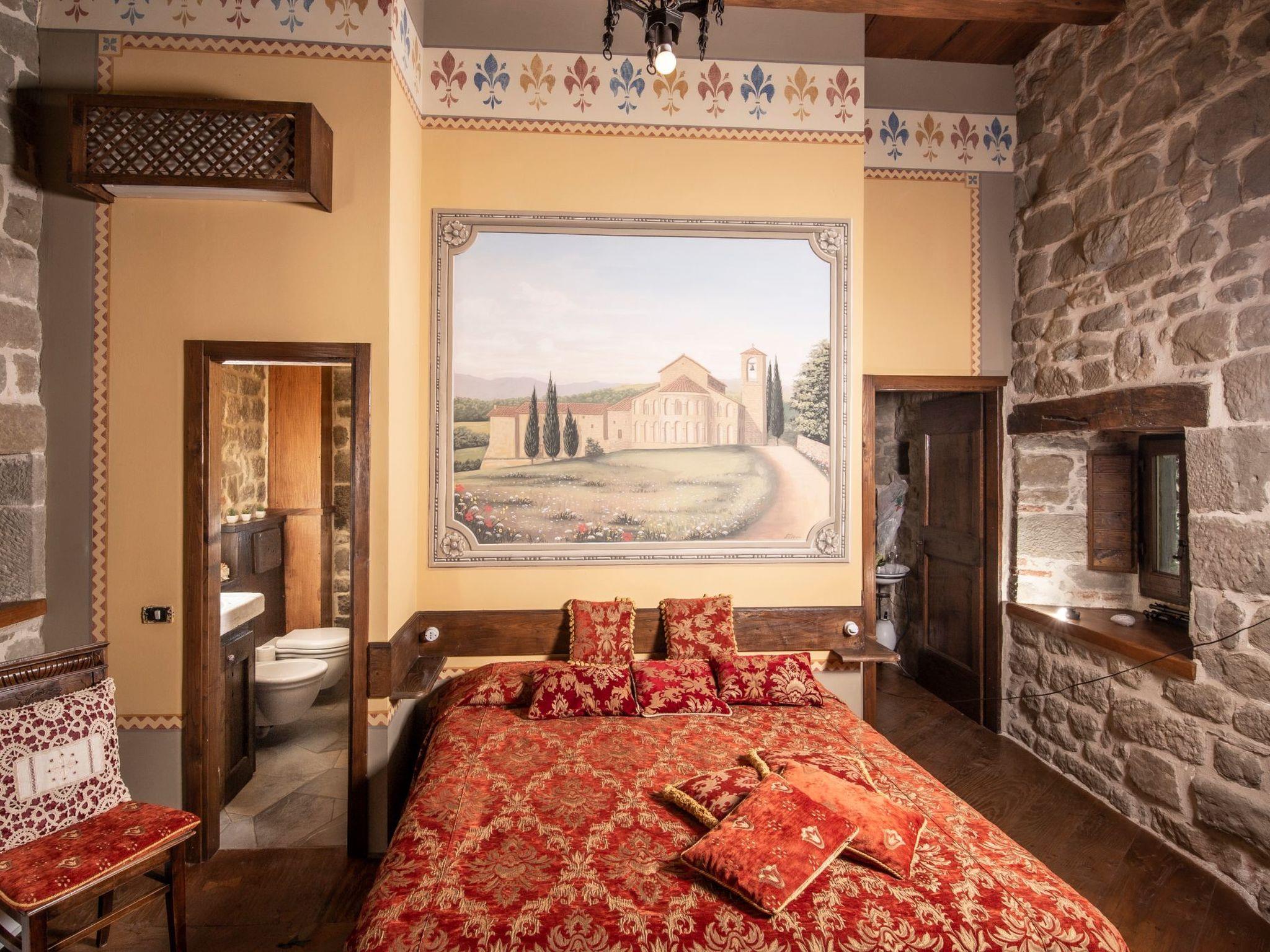 Here, you can spend an enchanting stay and also organise your wedding immersed in history: after careful restoration, a beautiful independent residence with every comfort and air conditioning has been created. The medieval tower is spread over three floors over an area together with the terrace of approximately 100 square metres. Access is on the 1st level via the typical wooden staircase (33 steps) and leads into the hallway equipped with a clothes hanger and entrance to the master bedroom (20 sq m) with majestic walls that have been skilfully built and restored, enriched with decorations reminiscent of the feudal period. In each wall of the cosy room there are typical slits overlooking the Arno river and the garden. Inside the room there is access to the private bathroom (4 sq. m.), created in keeping with the architectural forms of the structure and equipped with WC, bidet, shower and antique marble washbasin. From the hallway a staircase leads to the bright living room (28 sqm) with antique sofa, armchairs, satellite TV, dining table with four chairs, storage room and characteristic wooden kitchen equipped with: fridge-freezer, dishwasher, oven, two burners and antique marble sink. From the living room, a staircase with nine steps leads to the loft (10 sq. m.) with a comfortable single bed and a second bathroom enriched with external decorations showing the various castles of the Valley and equipped with WC, bidet and washbasin. From the loft a few steps lead to the panoramic terrace. Internet access must be booked (for a fee).