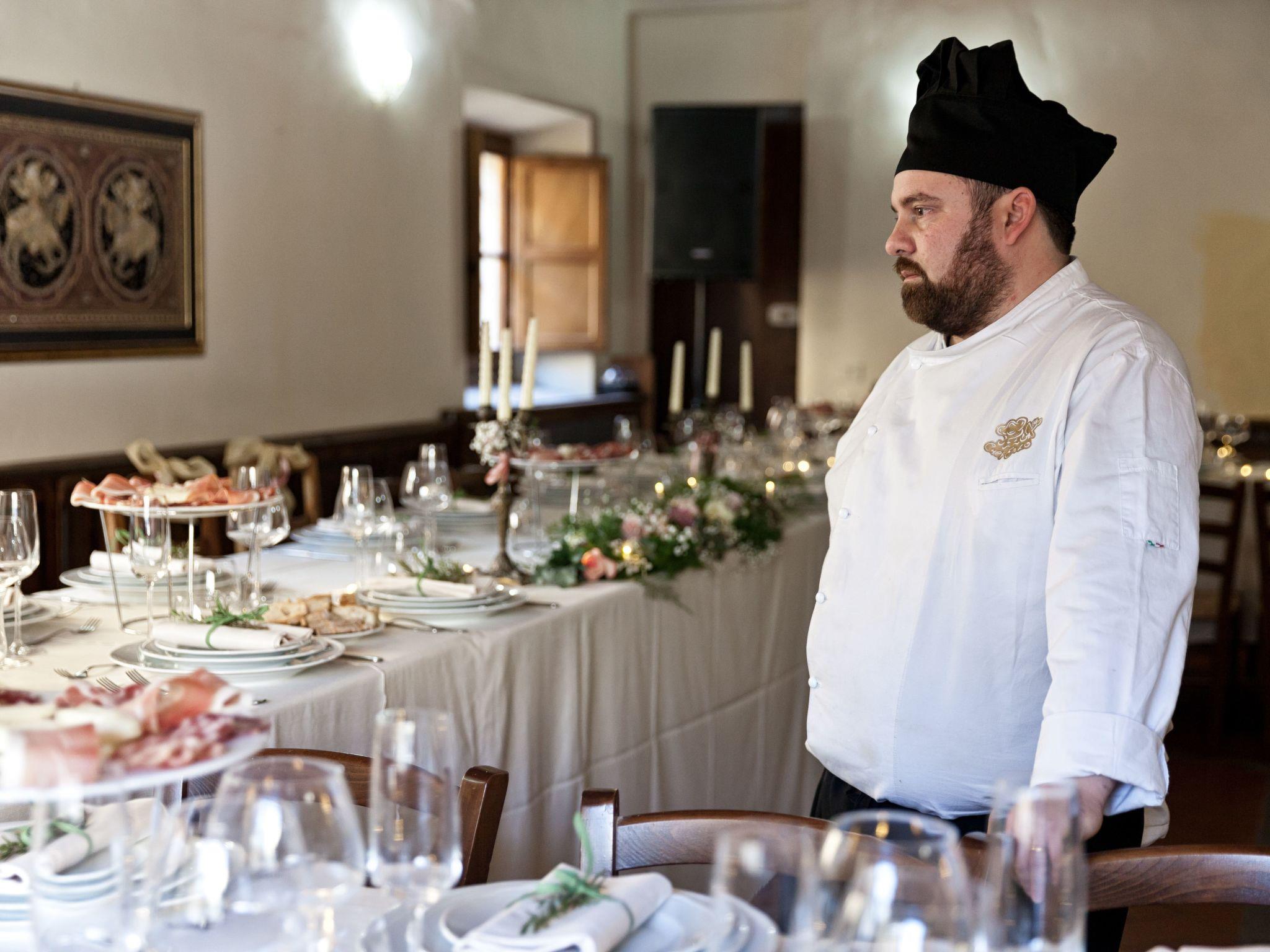 During the renovation of the villa in 2003, the decorations on the walls, the wood-beamed ceilings and the terracotta floors (some of which are still the original antique floors) were restored to their former glory. The villa is partially furnished with antiques. Single beds can be joined to form double beds. Bread can be delivered on request (Monday, Wednesday, Friday, price depends on local order). A surprise awaits guests every week. The villa is ideal for family reunions, reunions of friends or clubs, courses (painting, music, yoga, etc.), sports clubs and much more. It is also the perfect backdrop for weddings, as Casalino has a church where religious weddings can be celebrated and Poppi has a beautiful medieval castle where civil weddings can be held. In the event that wedding celebrations cannot be held outdoors due to bad weather, it is possible to use the premises in the basement (blue area in exposé).