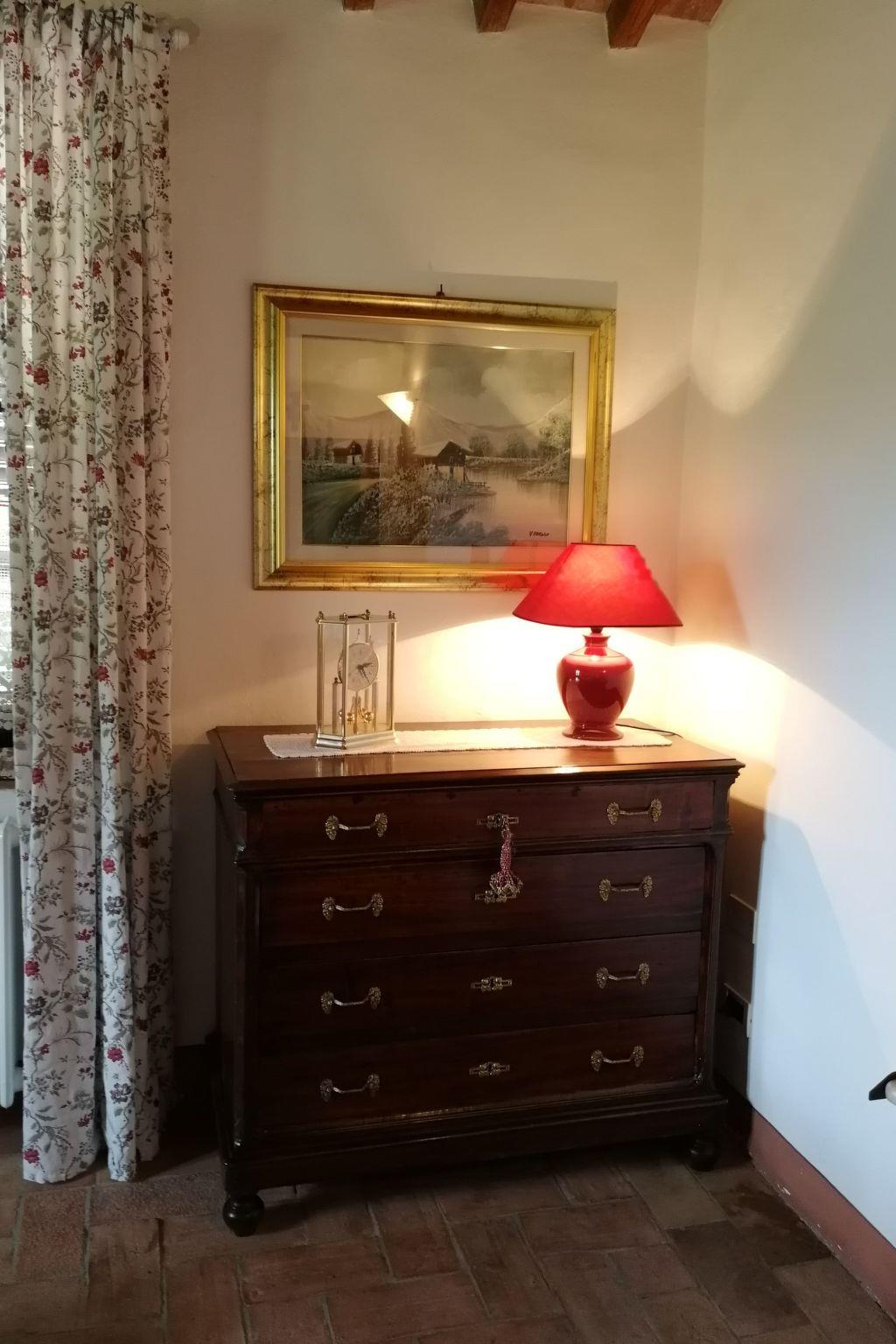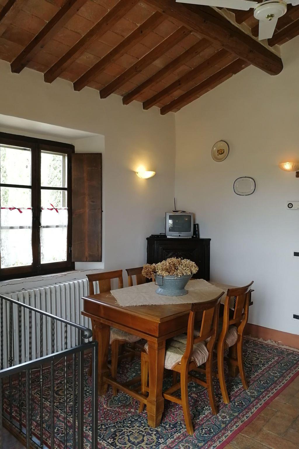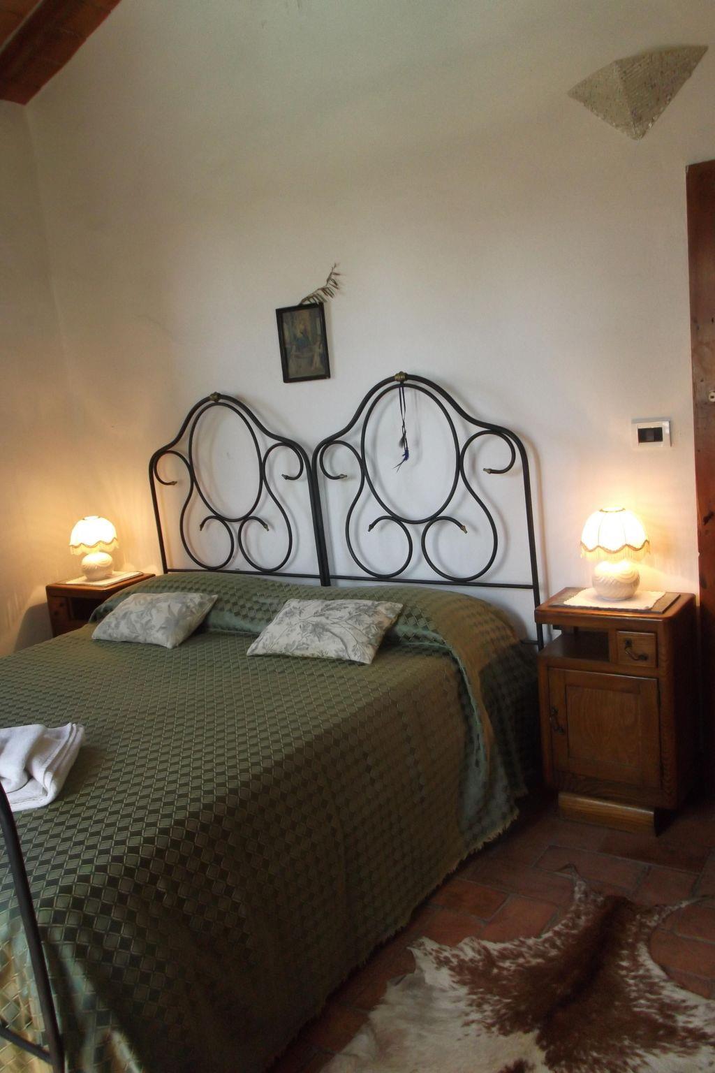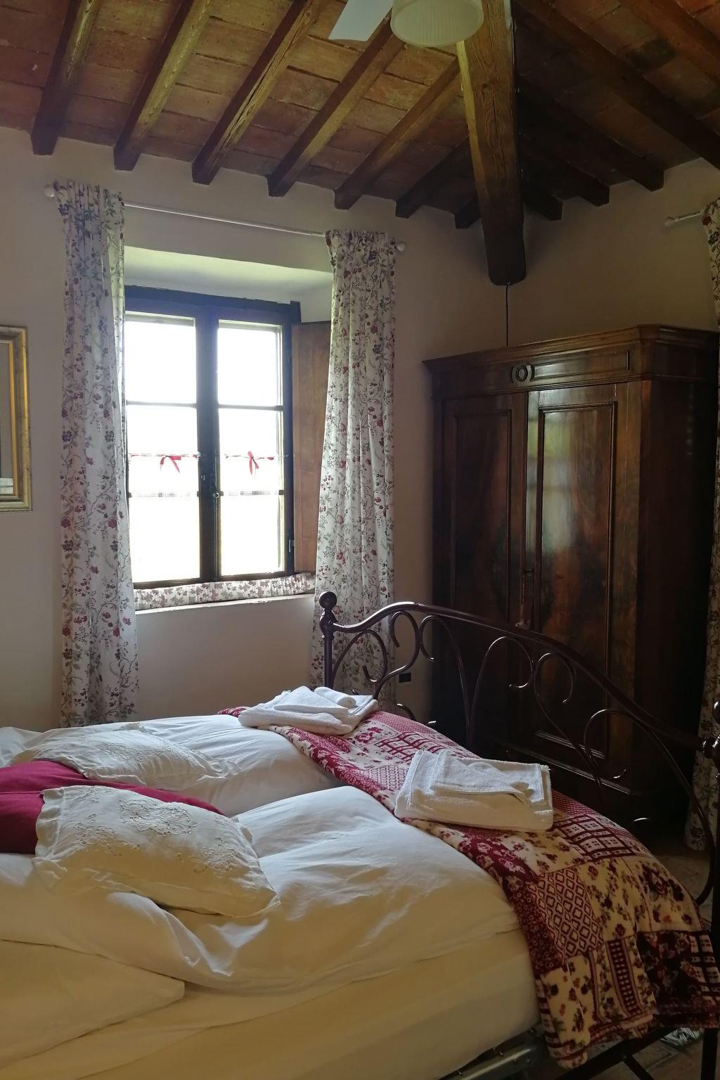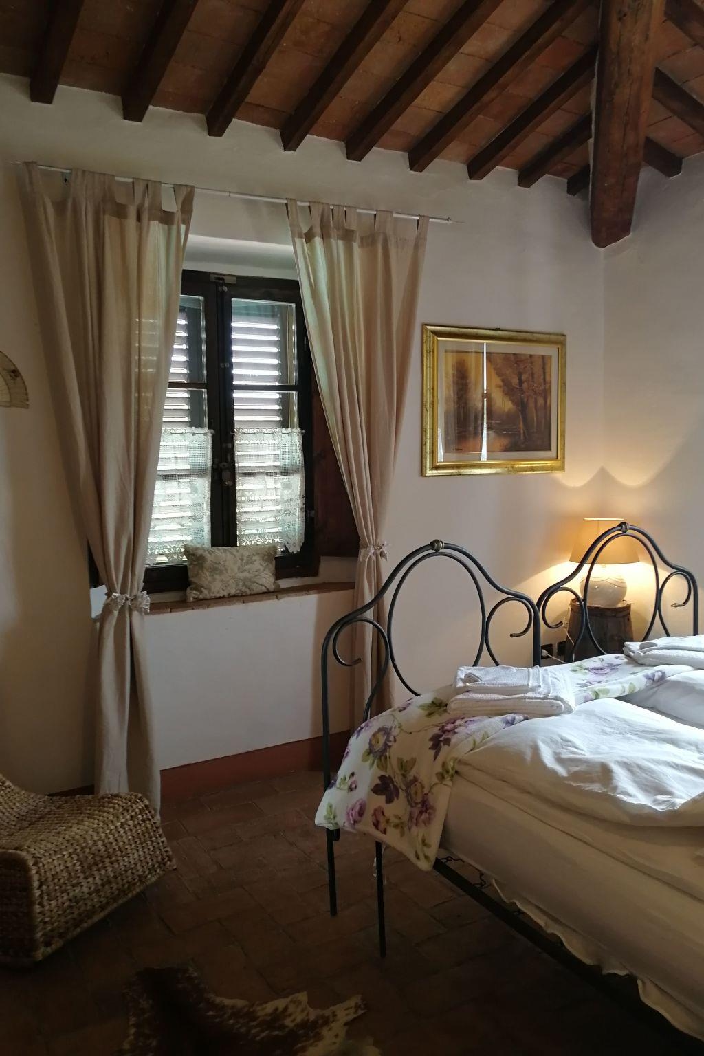 The holiday home offers a unique ambience with tasteful furnishings and three bedrooms on two floors. On the ground floor there is a large living area with a sofa bed for two persons (1.60 x 1.90 m), a spacious bedroom with a double bed, a small but fully equipped kitchen and a bathroom with shower. From this bathroom you can exit directly into the garden through a glass door. A wooden staircase leads to the upper floor, which can also be accessed via an outside staircase. In the living area on the upper floor, the large original fireplace is the focal point on cold days and provides warmth and comfort. In the spacious, fully masonry kitchen, you will find everything you need for cooking, as well as a collection of antique pots and pans, lovingly assembled from various farms and second-hand shops. There are also two cosy and bright bedrooms, each with a double bed, and a bathroom with bathtub, from whose window you can admire Monte Cetona. Another small bathroom with shower is located on the loggia; since it can be reached directly via external stairs, it is often used for showering after a bath. A total of eight beds are available; the double beds each measure 1.60 x 1.90 m. Upon request, the owner can provide a baby bed in the ground floor bedroom. The property offers free internet access.