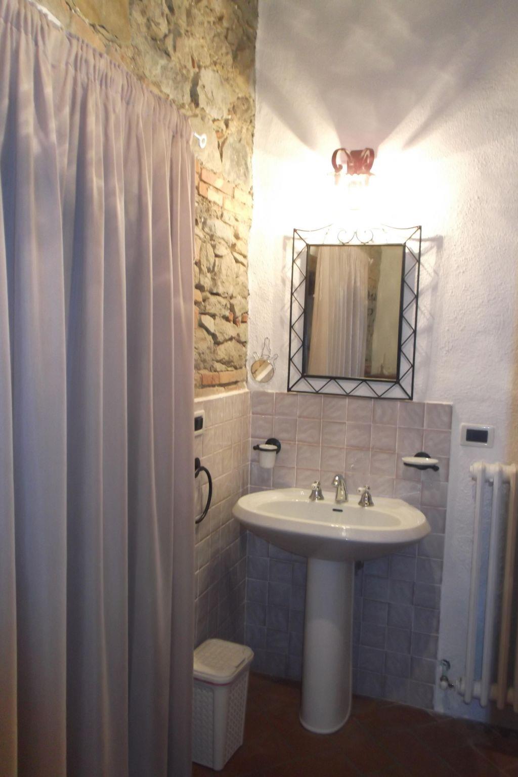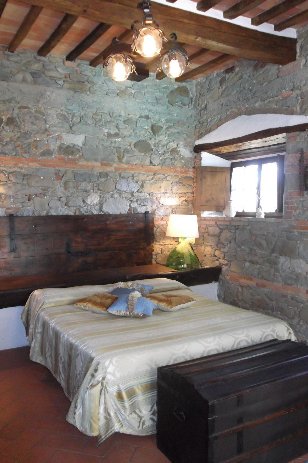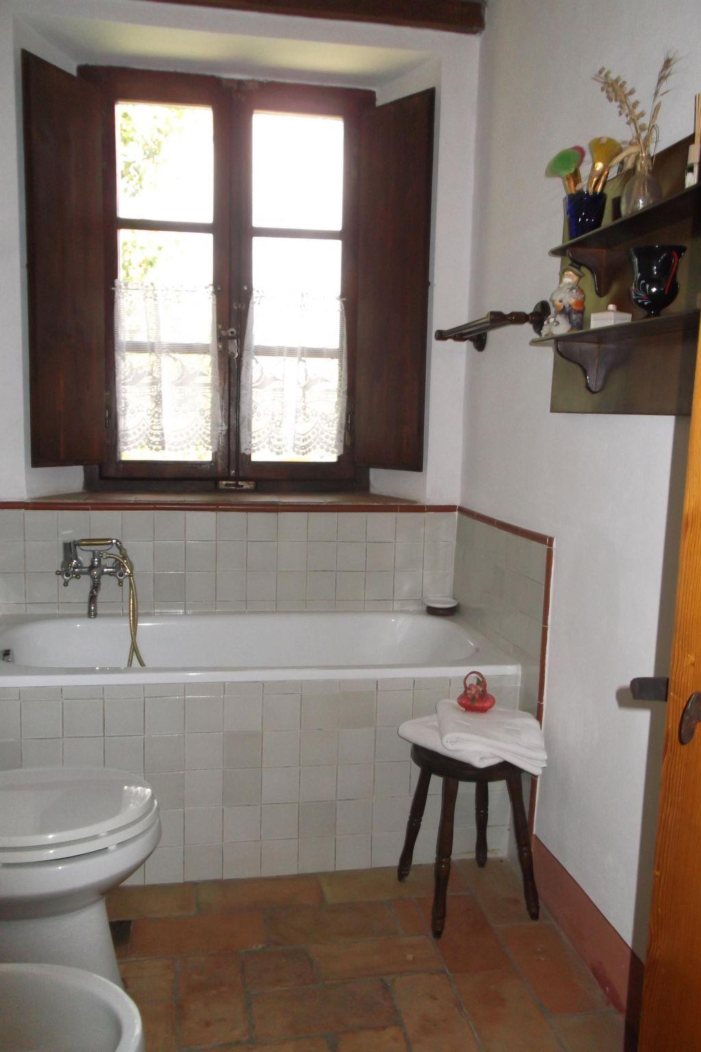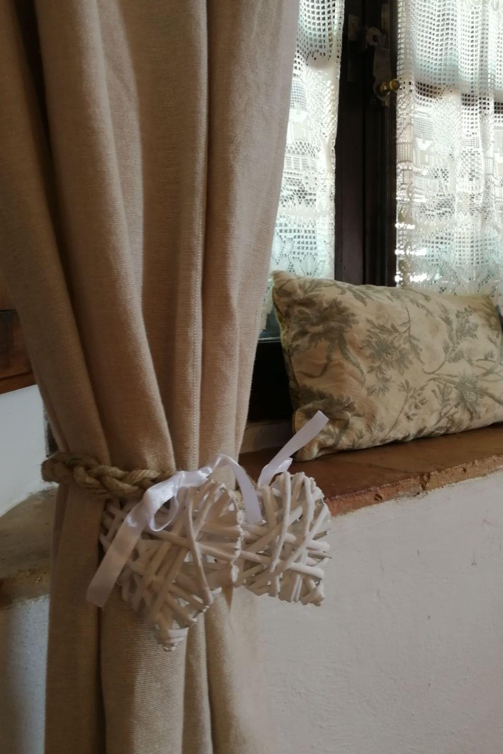 The holiday home offers a unique ambience with tasteful furnishings and three bedrooms on two floors. On the ground floor there is a large living area with a sofa bed for two persons (1.60 x 1.90 m), a spacious bedroom with a double bed, a small but fully equipped kitchen and a bathroom with shower. From this bathroom you can exit directly into the garden through a glass door. A wooden staircase leads to the upper floor, which can also be accessed via an outside staircase. In the living area on the upper floor, the large original fireplace is the focal point on cold days and provides warmth and comfort. In the spacious, fully masonry kitchen, you will find everything you need for cooking, as well as a collection of antique pots and pans, lovingly assembled from various farms and second-hand shops. There are also two cosy and bright bedrooms, each with a double bed, and a bathroom with bathtub, from whose window you can admire Monte Cetona. Another small bathroom with shower is located on the loggia; since it can be reached directly via external stairs, it is often used for showering after a bath. A total of eight beds are available; the double beds each measure 1.60 x 1.90 m. Upon request, the owner can provide a baby bed in the ground floor bedroom. The property offers free internet access.