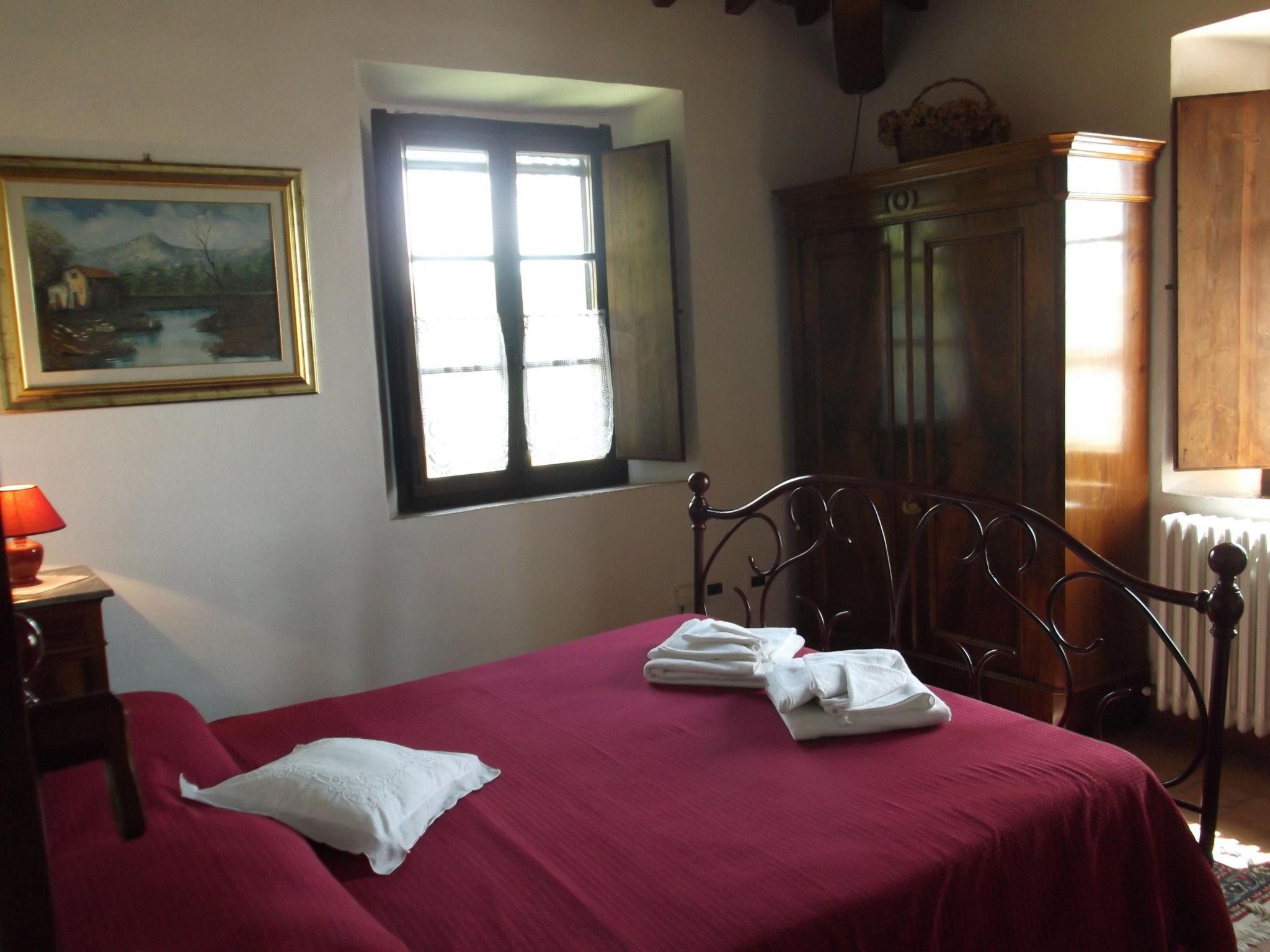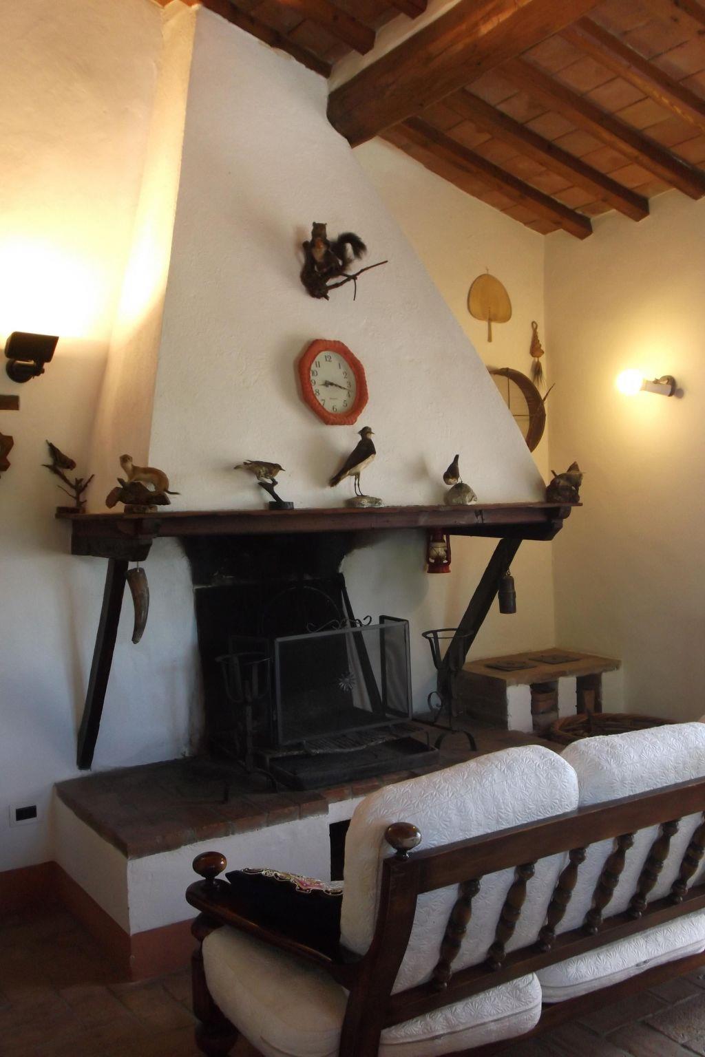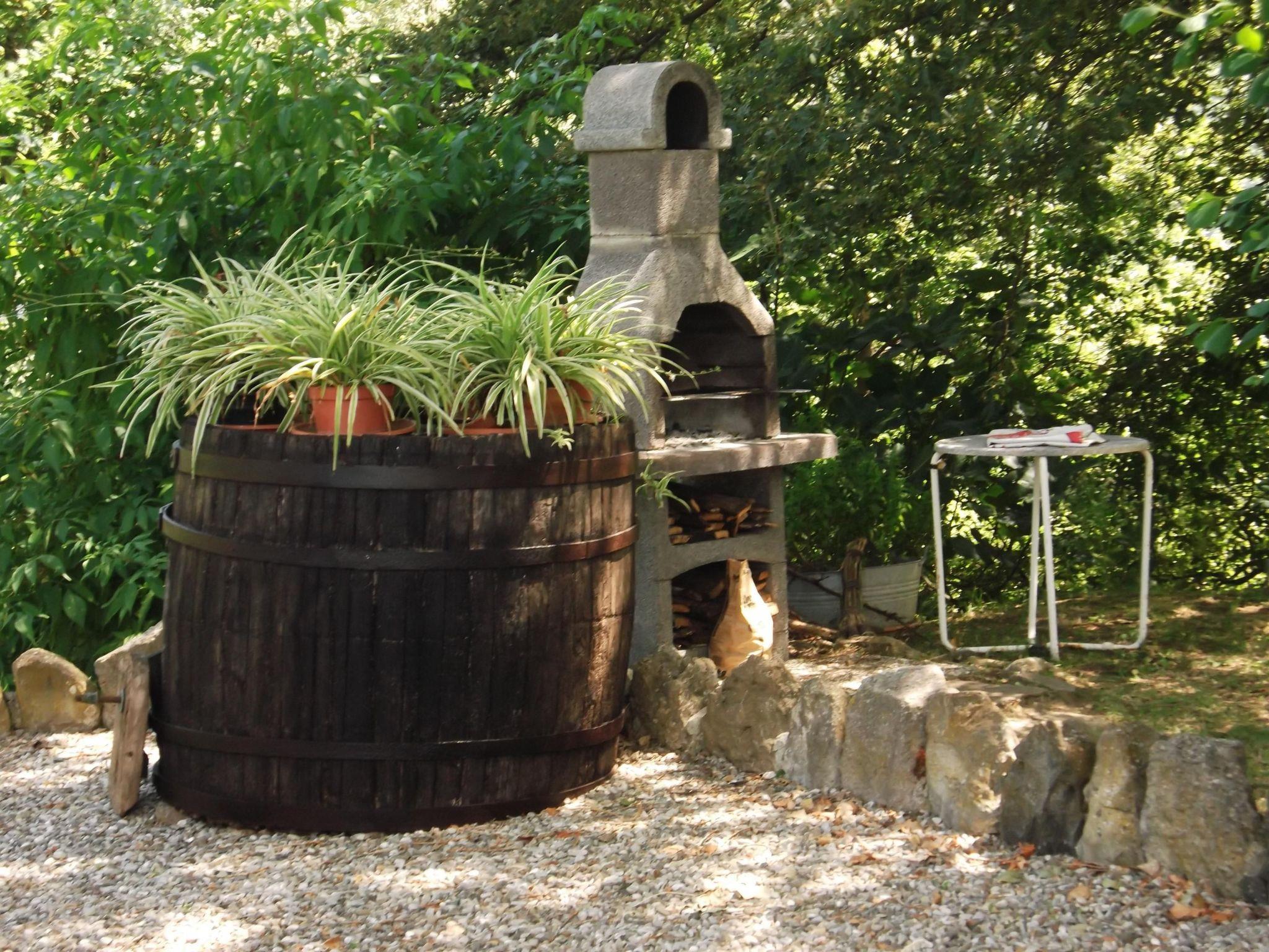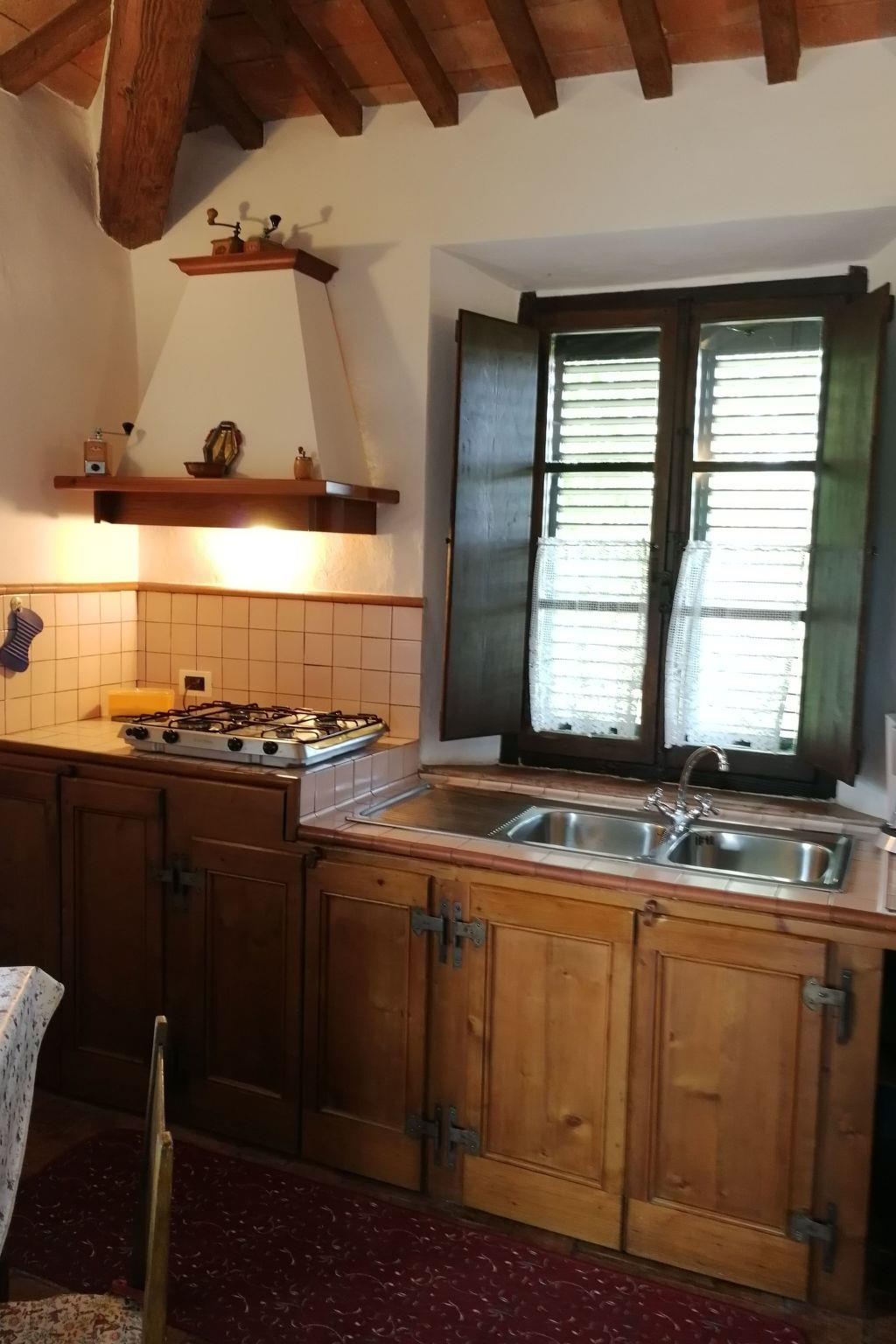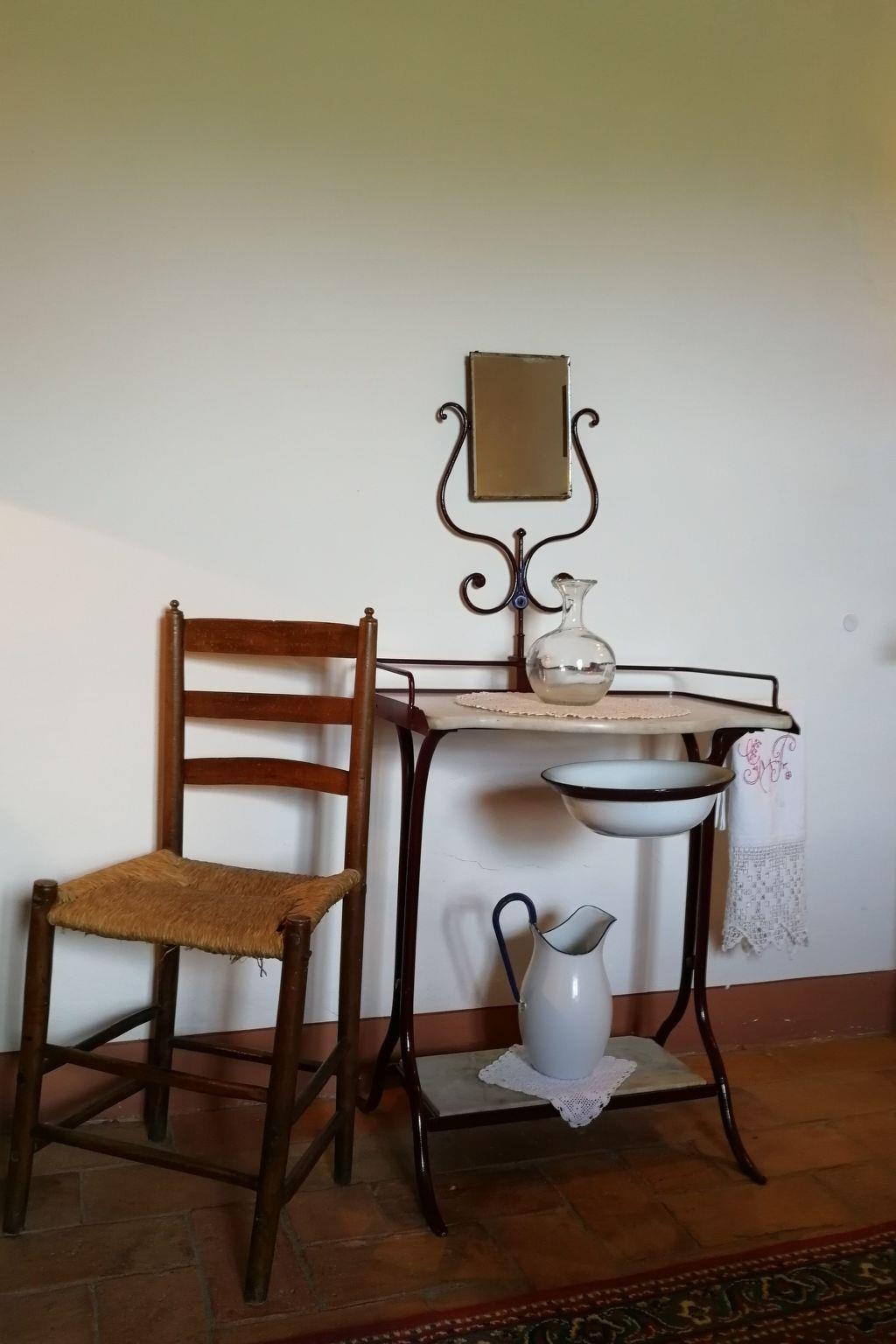 The holiday home offers a unique ambience with tasteful furnishings and three bedrooms on two floors. On the ground floor there is a large living area with a sofa bed for two persons (1.60 x 1.90 m), a spacious bedroom with a double bed, a small but fully equipped kitchen and a bathroom with shower. From this bathroom you can exit directly into the garden through a glass door. A wooden staircase leads to the upper floor, which can also be accessed via an outside staircase. In the living area on the upper floor, the large original fireplace is the focal point on cold days and provides warmth and comfort. In the spacious, fully masonry kitchen, you will find everything you need for cooking, as well as a collection of antique pots and pans, lovingly assembled from various farms and second-hand shops. There are also two cosy and bright bedrooms, each with a double bed, and a bathroom with bathtub, from whose window you can admire Monte Cetona. Another small bathroom with shower is located on the loggia; since it can be reached directly via external stairs, it is often used for showering after a bath. A total of eight beds are available; the double beds each measure 1.60 x 1.90 m. Upon request, the owner can provide a baby bed in the ground floor bedroom. The property offers free internet access.