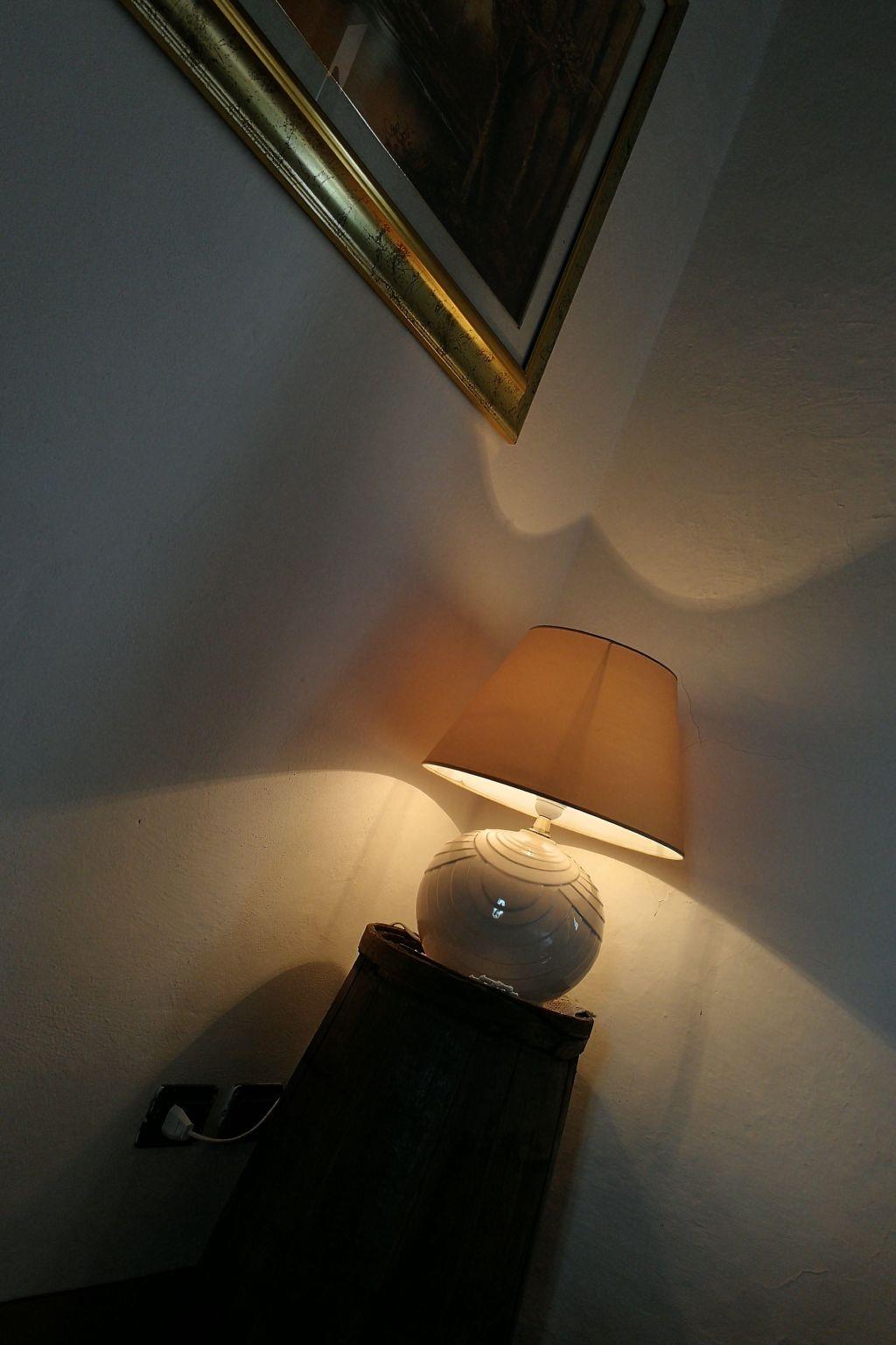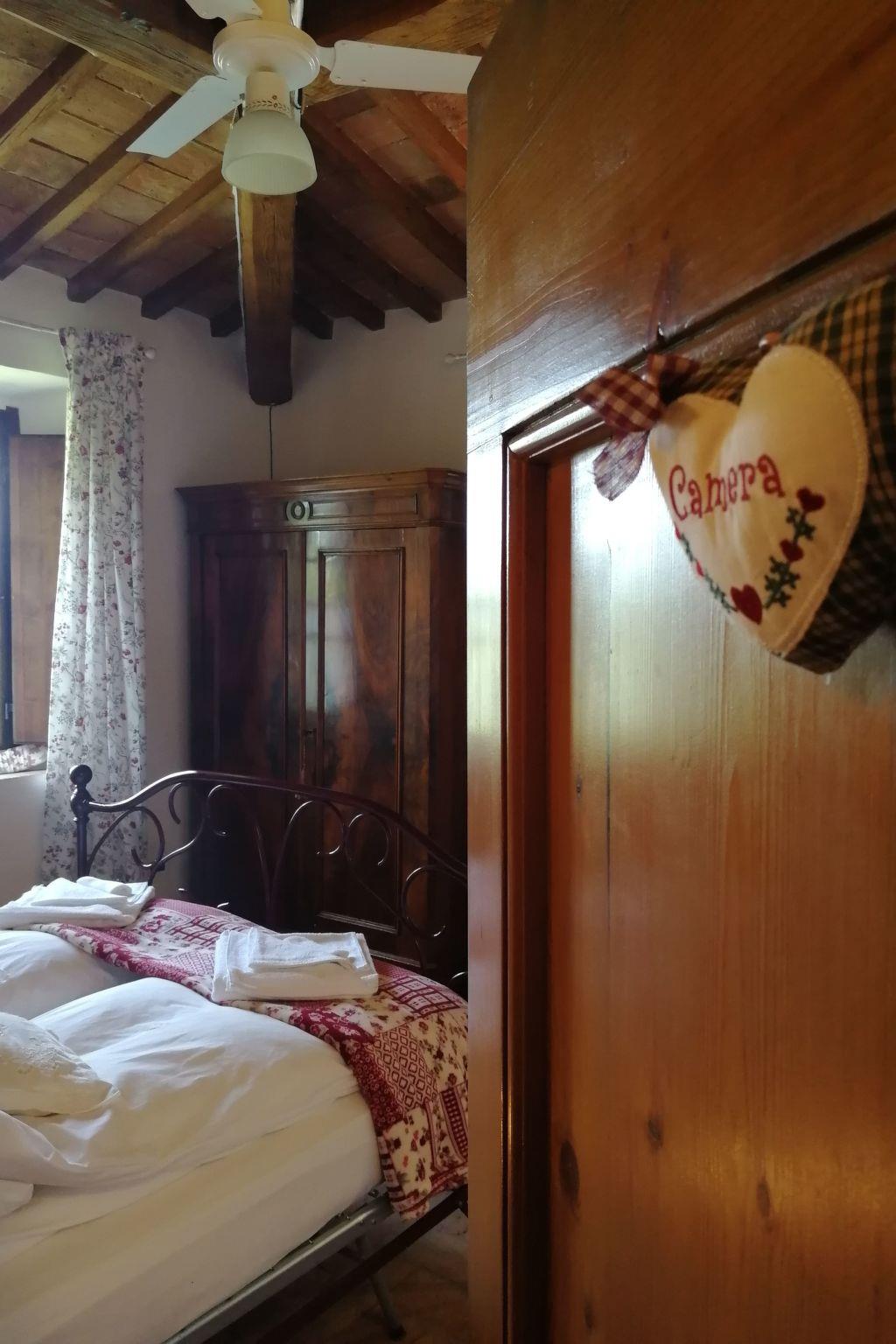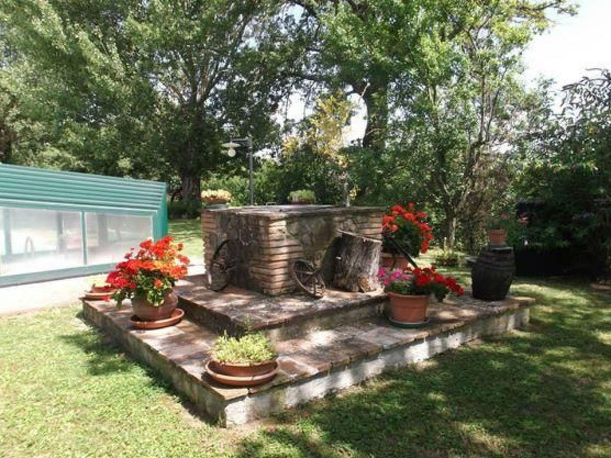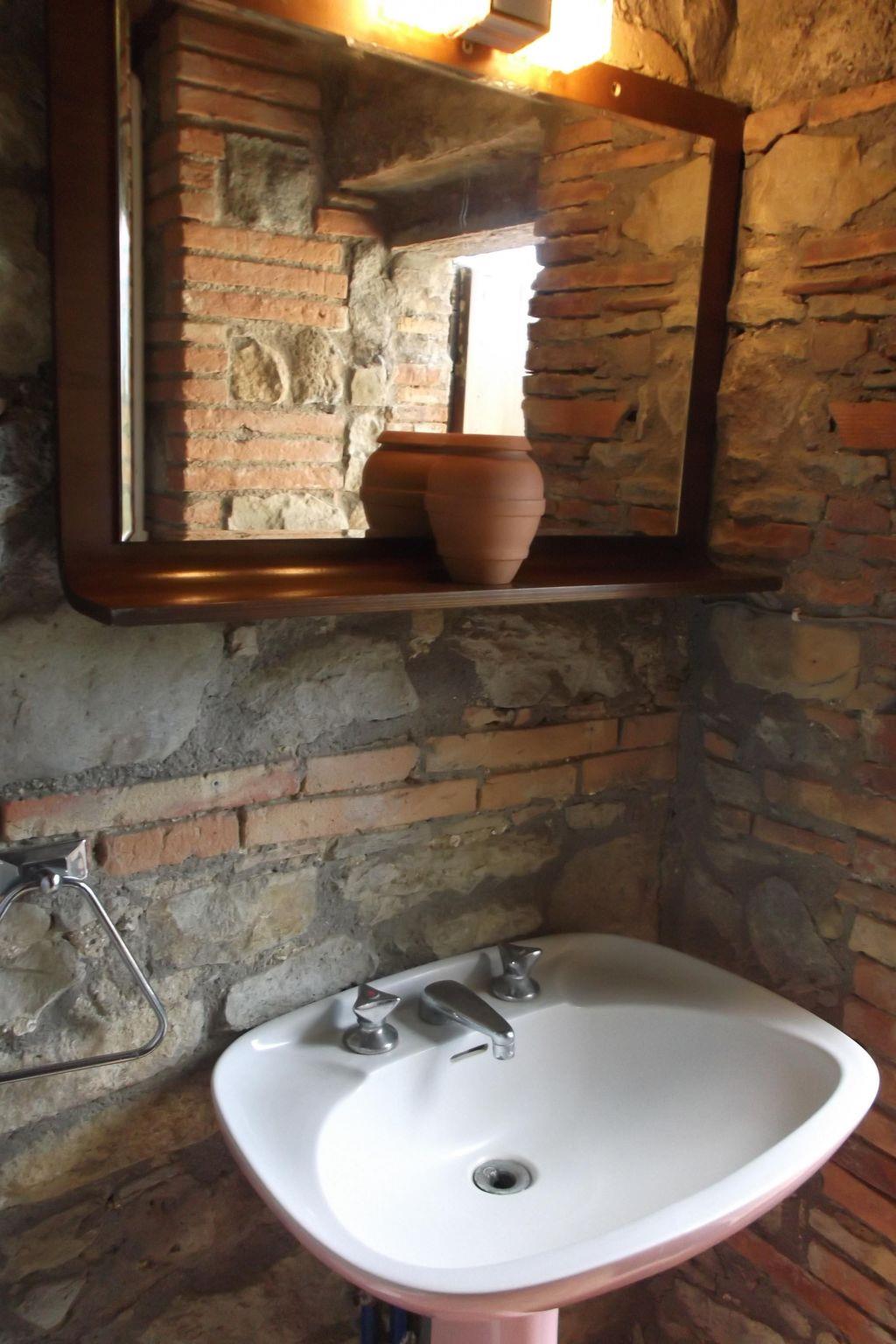 The holiday home offers a unique ambience with tasteful furnishings and three bedrooms on two floors. On the ground floor there is a large living area with a sofa bed for two persons (1.60 x 1.90 m), a spacious bedroom with a double bed, a small but fully equipped kitchen and a bathroom with shower. From this bathroom you can exit directly into the garden through a glass door. A wooden staircase leads to the upper floor, which can also be accessed via an outside staircase. In the living area on the upper floor, the large original fireplace is the focal point on cold days and provides warmth and comfort. In the spacious, fully masonry kitchen, you will find everything you need for cooking, as well as a collection of antique pots and pans, lovingly assembled from various farms and second-hand shops. There are also two cosy and bright bedrooms, each with a double bed, and a bathroom with bathtub, from whose window you can admire Monte Cetona. Another small bathroom with shower is located on the loggia; since it can be reached directly via external stairs, it is often used for showering after a bath. A total of eight beds are available; the double beds each measure 1.60 x 1.90 m. Upon request, the owner can provide a baby bed in the ground floor bedroom. The property offers free internet access.
