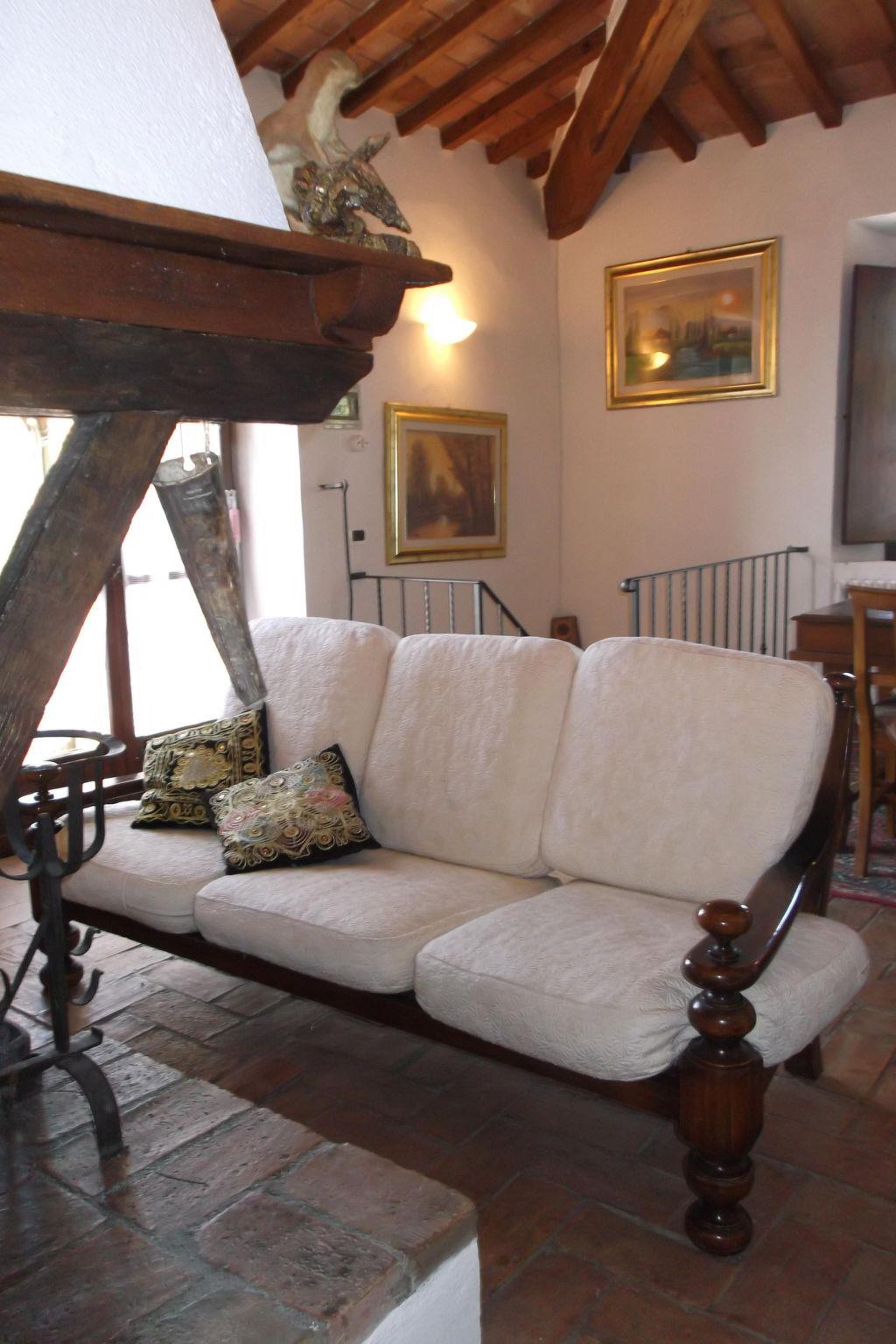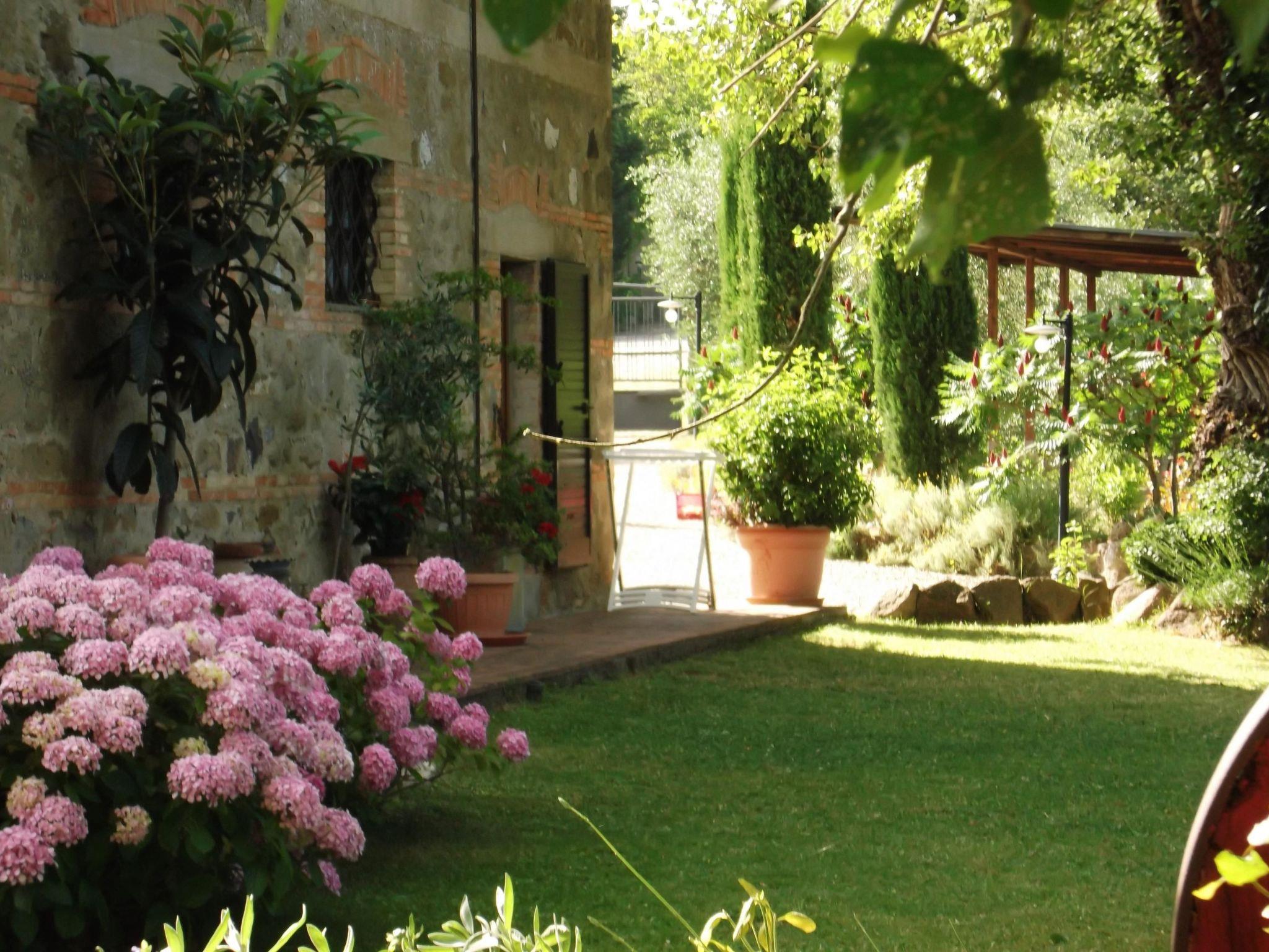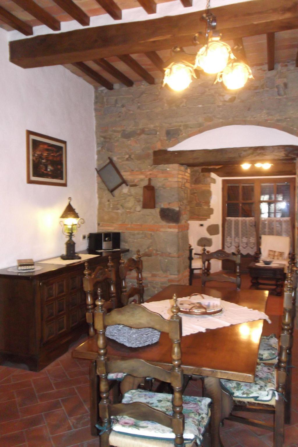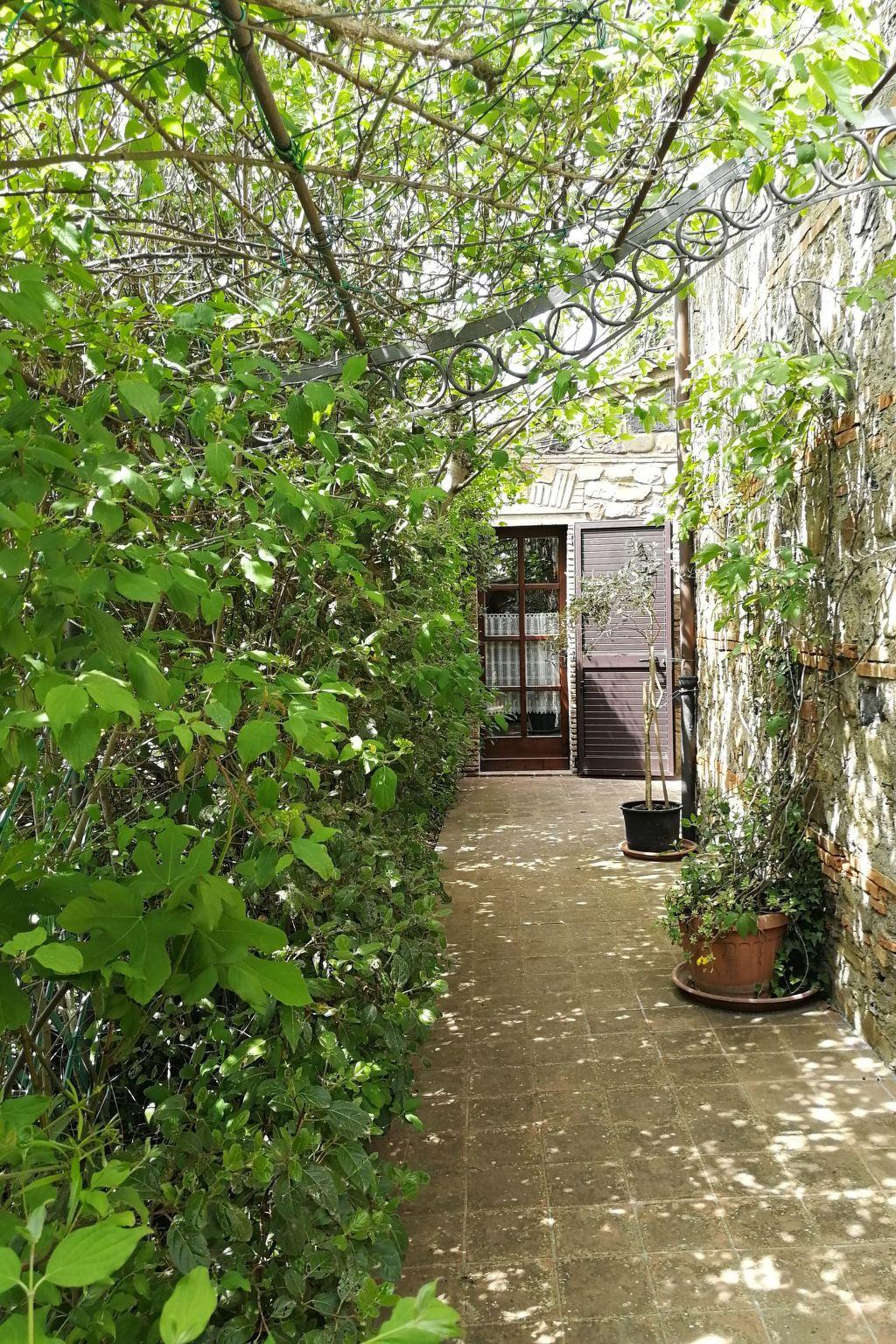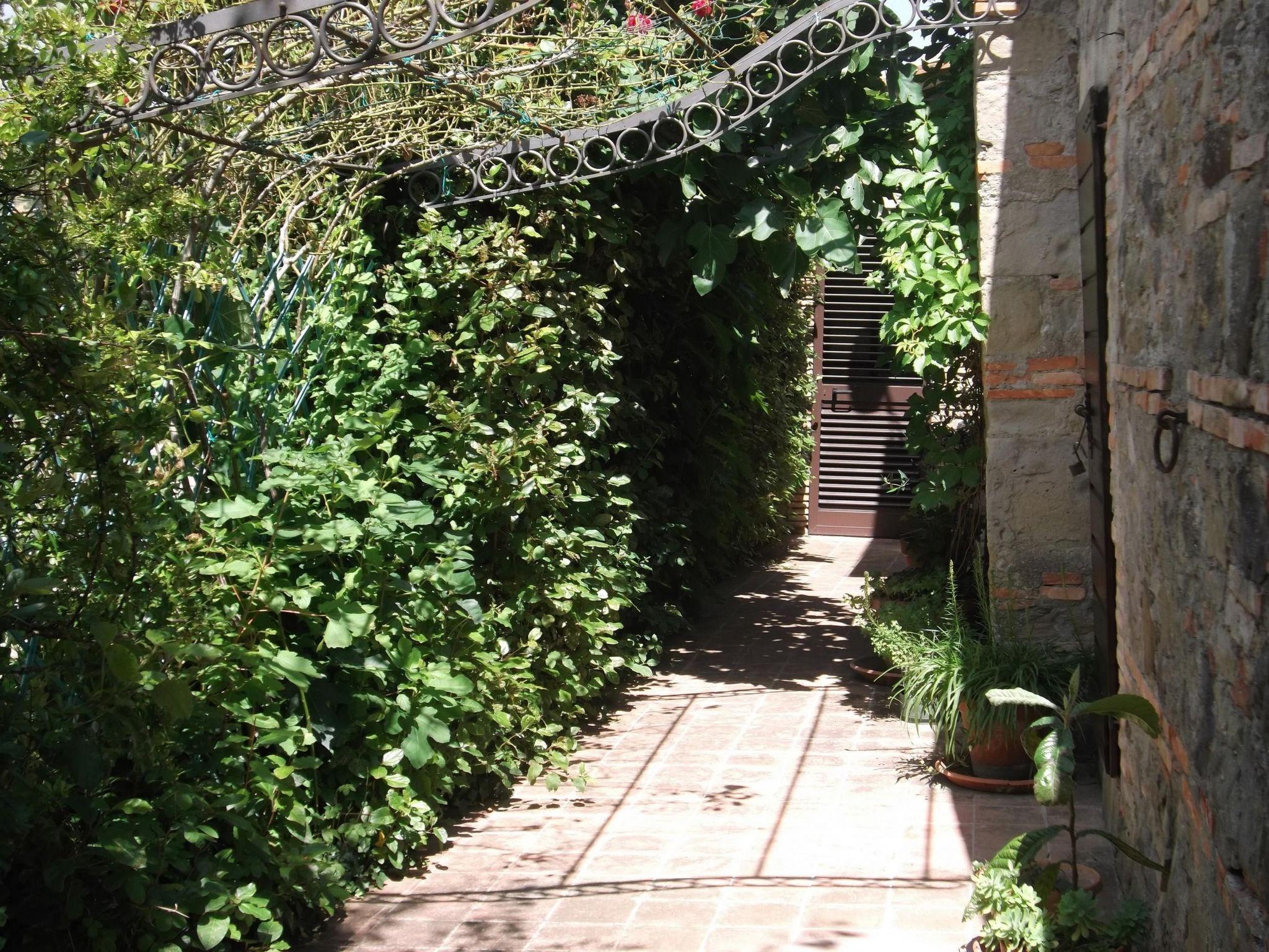 The holiday home offers a unique ambience with tasteful furnishings and three bedrooms on two floors. On the ground floor there is a large living area with a sofa bed for two persons (1.60 x 1.90 m), a spacious bedroom with a double bed, a small but fully equipped kitchen and a bathroom with shower. From this bathroom you can exit directly into the garden through a glass door. A wooden staircase leads to the upper floor, which can also be accessed via an outside staircase. In the living area on the upper floor, the large original fireplace is the focal point on cold days and provides warmth and comfort. In the spacious, fully masonry kitchen, you will find everything you need for cooking, as well as a collection of antique pots and pans, lovingly assembled from various farms and second-hand shops. There are also two cosy and bright bedrooms, each with a double bed, and a bathroom with bathtub, from whose window you can admire Monte Cetona. Another small bathroom with shower is located on the loggia; since it can be reached directly via external stairs, it is often used for showering after a bath. A total of eight beds are available; the double beds each measure 1.60 x 1.90 m. Upon request, the owner can provide a baby bed in the ground floor bedroom. The property offers free internet access.
