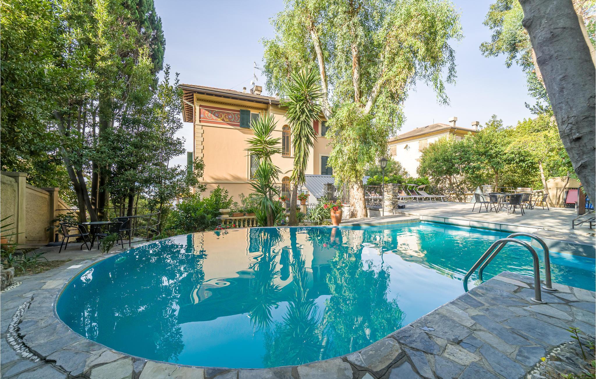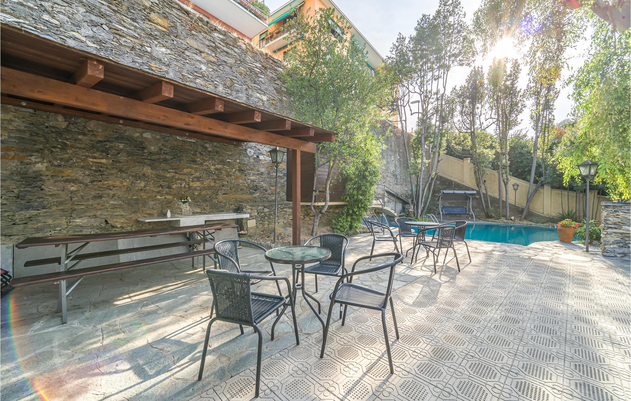 Elegant ferielejlighed hvis gæster har adgang til fælles pool og have med havemøbler. Den ligger i en historisk villa ca. 10 minutters gang fra de nærmeste strand i den skønne by Rapallo ved Tigulliobuten og kun få minutter i bil fra Santa Margherita Ligure og det berømte Portofino. I bor i et perfekt udgangspunkt til uforglemmelige oplevelser. Fx til Genua med sit historiske center og Europas største akvarium, 30 km væk. Her er utallige vandrestier og desuden en nærliggende meget berømt golf- og tennisbane. Lejligheden ligger i stueplan og rummer en stor stue med sovesofa, spisestue med udsigt over haven, et køkken, soveværelse med dobbeltsgen og badeværelse med spa. I stuen er der også en gæsteseng til en. Prvat pavillon på 7 m². Cinque Terres fortryllende landskaber og småbyer nås enten i bil, med tog eller færge (havn ca. 700 m væk). I samme hus som ILL260-264-265-266-267-300-398-793 og lejligheden hvor ejer bor.