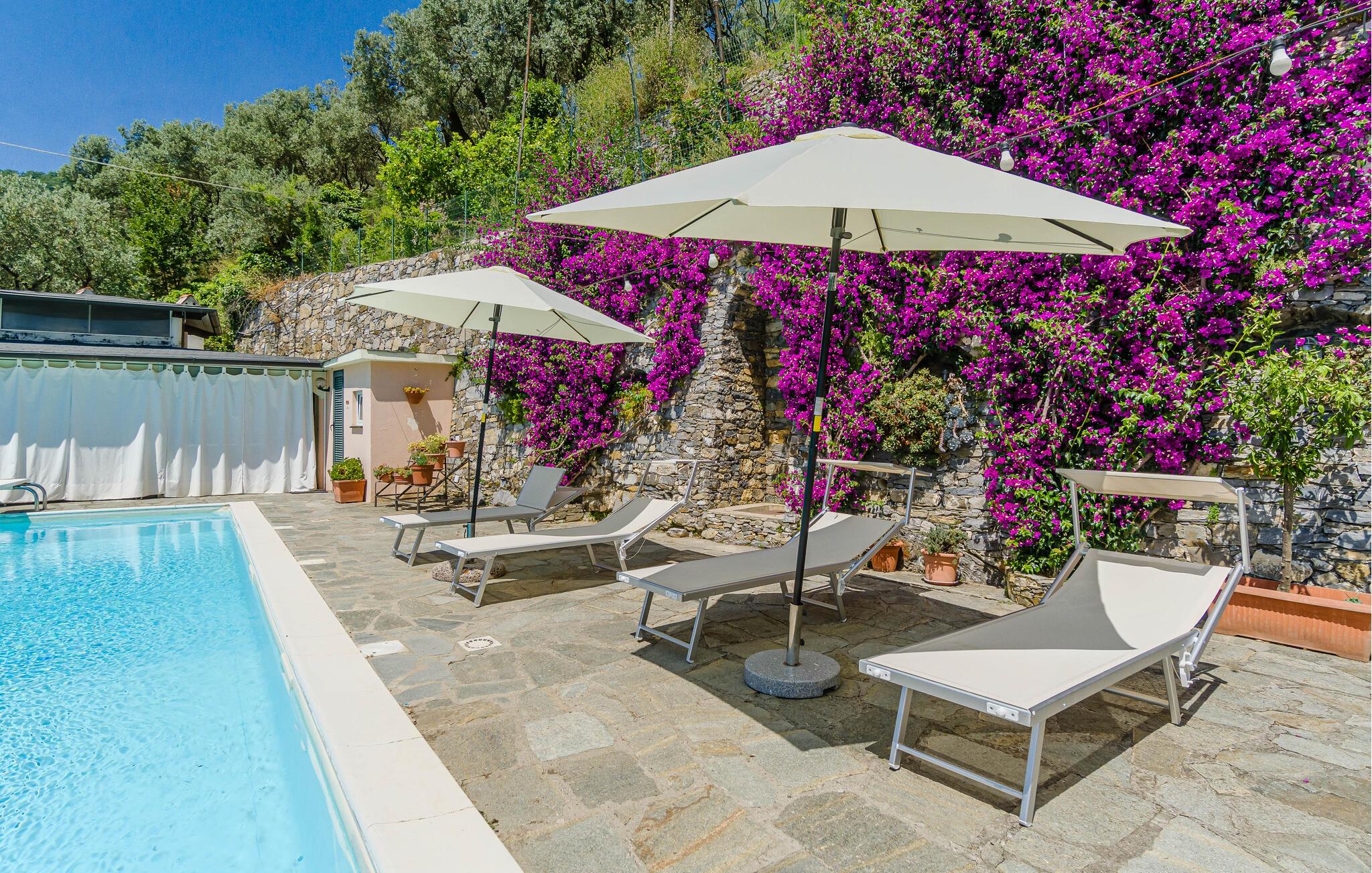 Den private terrassehave med en fantastisk udsigt er perfekt til måltider under åben himmel. Den fælles pool giver jer mulighed for at tage en forfriskende dukkert og nyde Liguriens sol. Begynd dagen med et spring i det kølige vand, eller slap af med en god bog ved poolkanten.