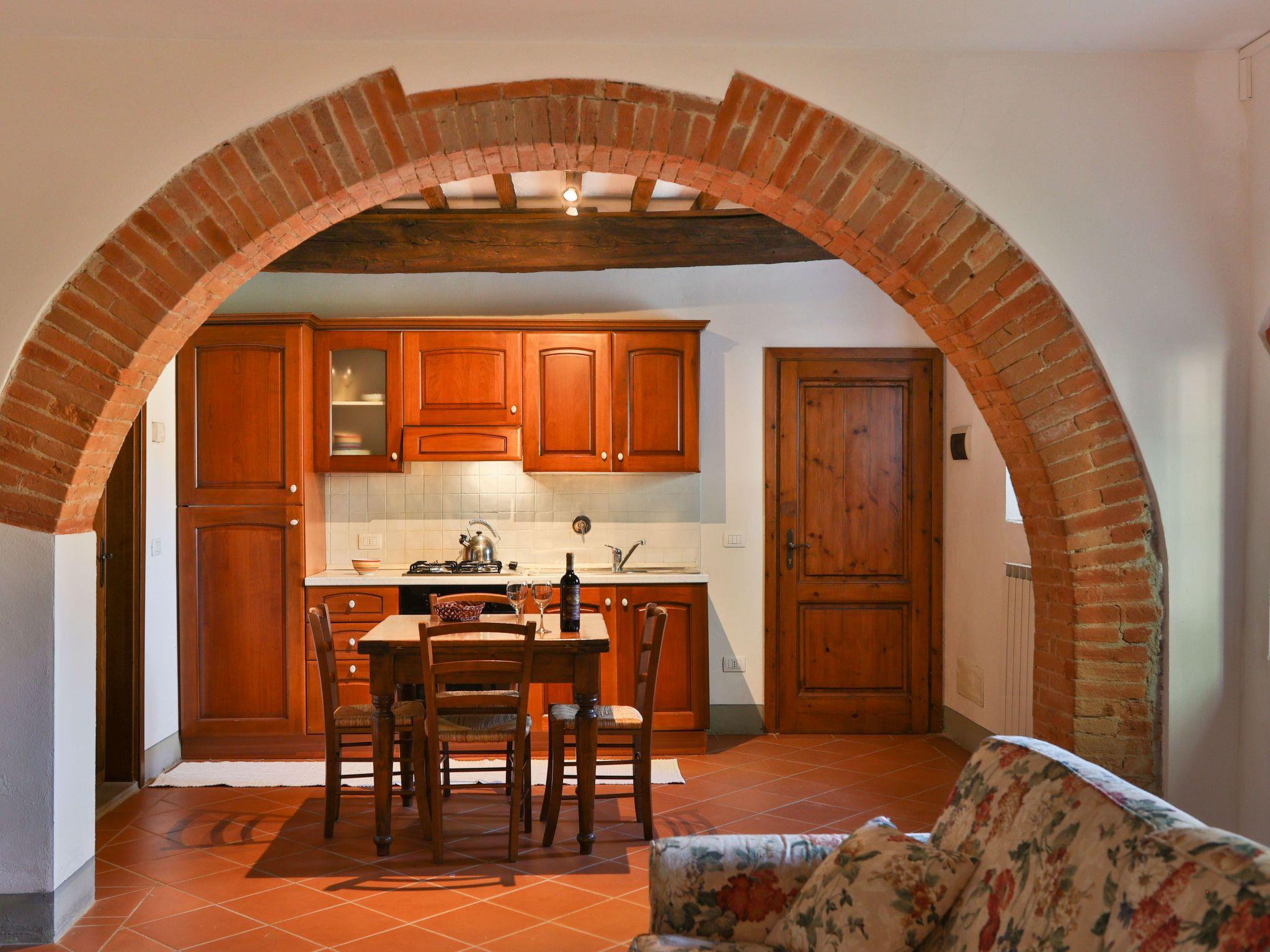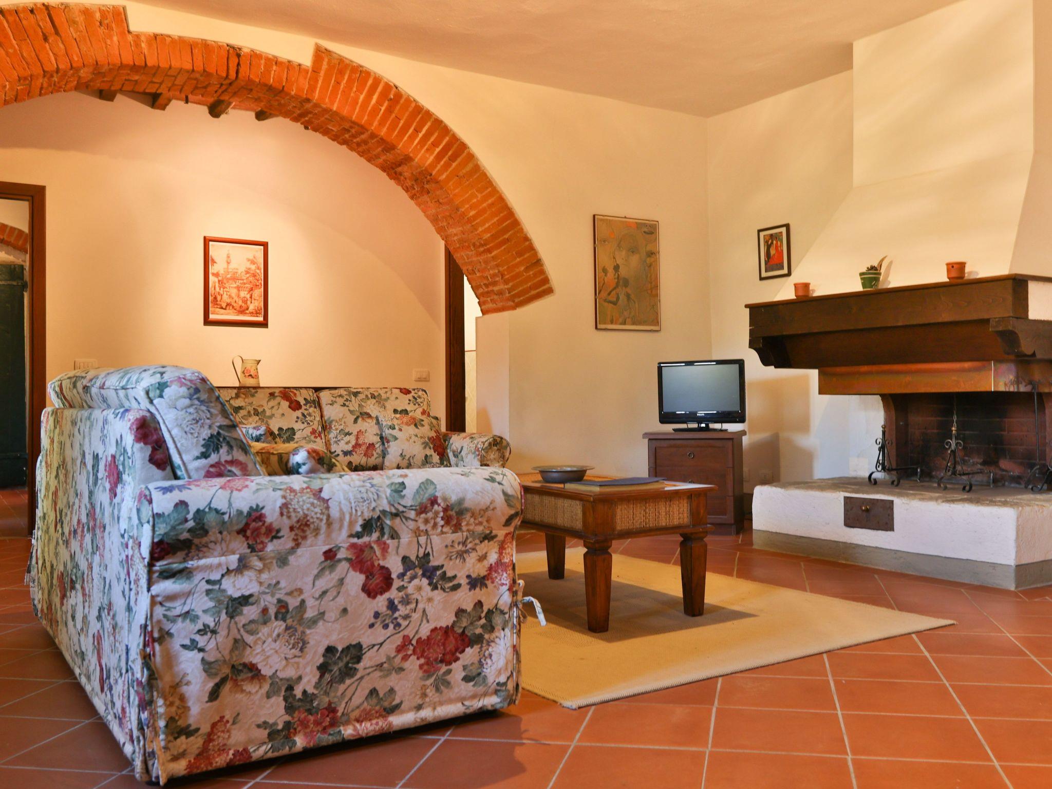The holiday apartment is located in one of the two main buildings of the farmhouse. It is on the ground floor and comprises a kitchen-living room, storage room, bedroom and bathroom. As is the case with the other holiday apartments of this agriturismo, this apartment is also cosily decorated in a rustic style and exudes a very homely atmosphere. A special feature of this holiday apartment is the beautiful round arch that divides the kitchen-living room into a living area and a dining area. The living area with two sofas and a lovely wooden coffee table right by the fire is the perfect place for romantic evenings for two, or cosy convivial evenings. There is also a single sofa bed in the living room, suitable for children up to 12 years old. In the kitchen area there is a small dining table. In the fully-equipped kitchen unit there is a gas stove, oven and fridge with a freezer compartment. The bedroom is furnished with a double bed, the bathroom has a shower and bidet. In addition, the holiday apartment provides digital television in the living room, independent gas central heating and a washing machine in the storage room.
