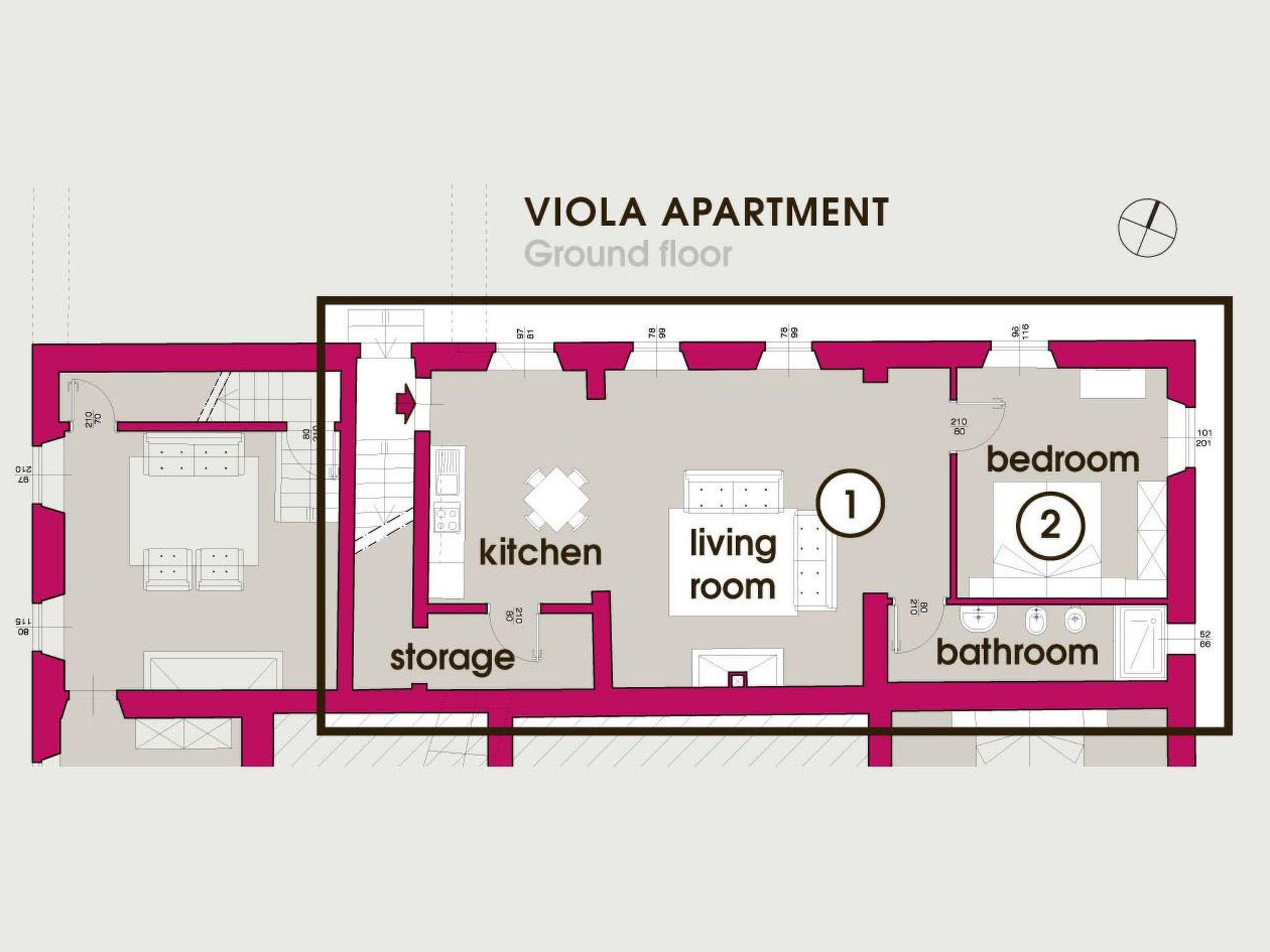 The apartment Viola of 60 sqm is part of the farmhouse Antico Borgo La Torre, located 27 km south-east of Florence, in a sunny and quiet position, immersed in the green Tuscan countryside.The farm has 32 hectares of land comprising of vineyards, olive groves and a large natural garden with a small private lake and a 20-meter pool which all guests can enjoy.