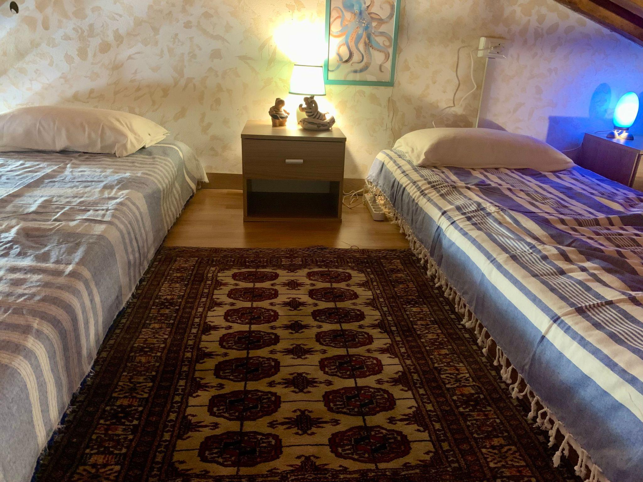 The bedroom is lofted and is accessed via a wooden ladder. In the loft, there are two single beds with a width of 0.90 x 200 cm. The beds, if desired, can be joined and converted into a double bed.